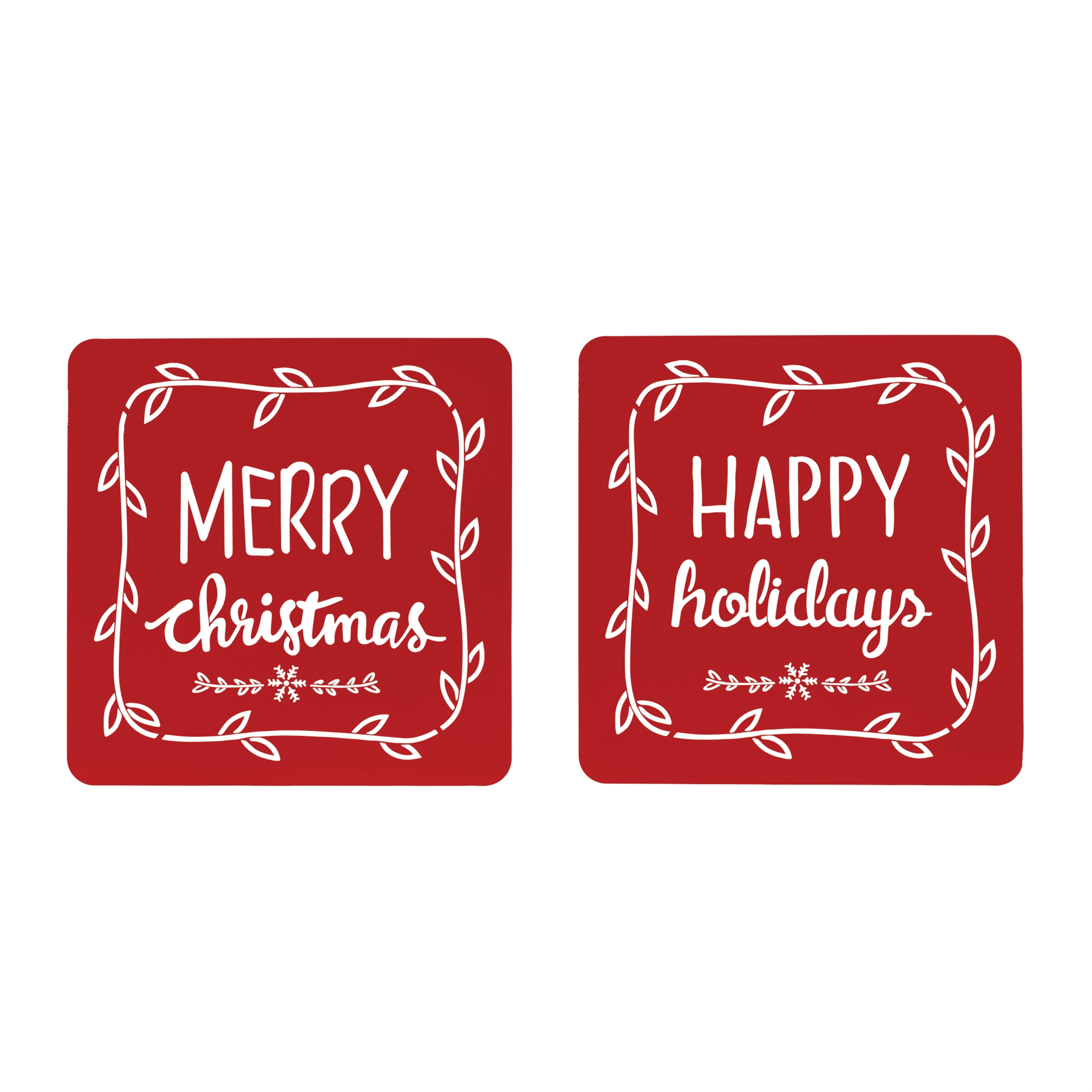 Add a festive touch to your home with this Cut Metal Holiday Sentiment Sign Set, featuring the beloved "Merry Christmas" and "Happy Holidays" sentiments. Crafted in a vibrant red tone with intricate cut sheet iron designs and delicate leaf borders, these plaques are perfect for enhancing your holiday displays. Each piece in the set comes with a sawtooth hook on the back for securing them safely to the walls of your home. Sold in a set of two assorted pieces, they re ideal for hanging in your living room, entryway, or gifting to someone special this season.