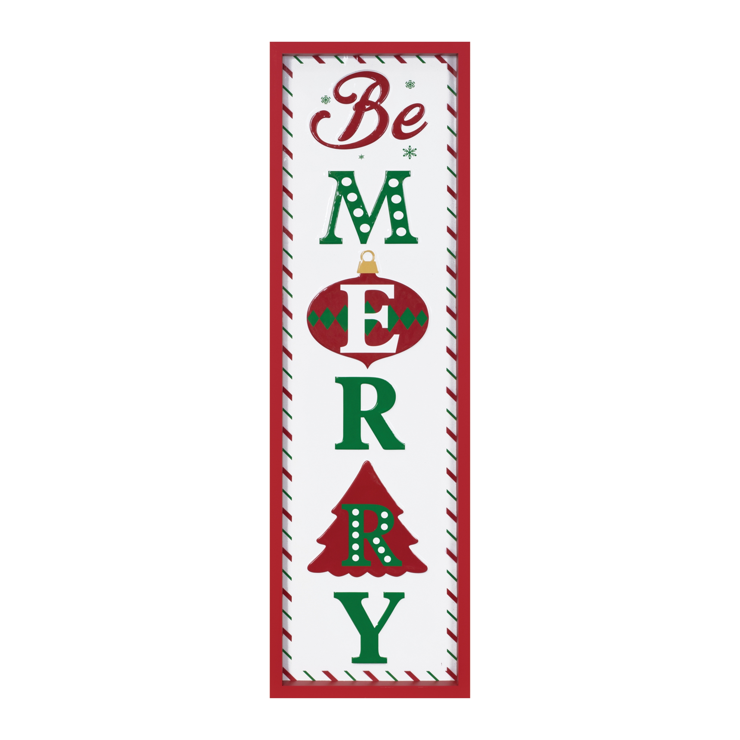 Spread holiday cheer with this Metal Be Merry Sentiment Sign, featuring bold red and green tones with a vibrant red wood frame. The whimsical "Be Merry" sentiment, accented with charming ornaments and tree designs, adds a joyful touch to any room. The piece comes with a sawtooth hook on the back for securing it safely to the wall of your home. Perfect for displaying in your living room, entryway, or as a thoughtful gift to share the holiday spirit with loved ones.