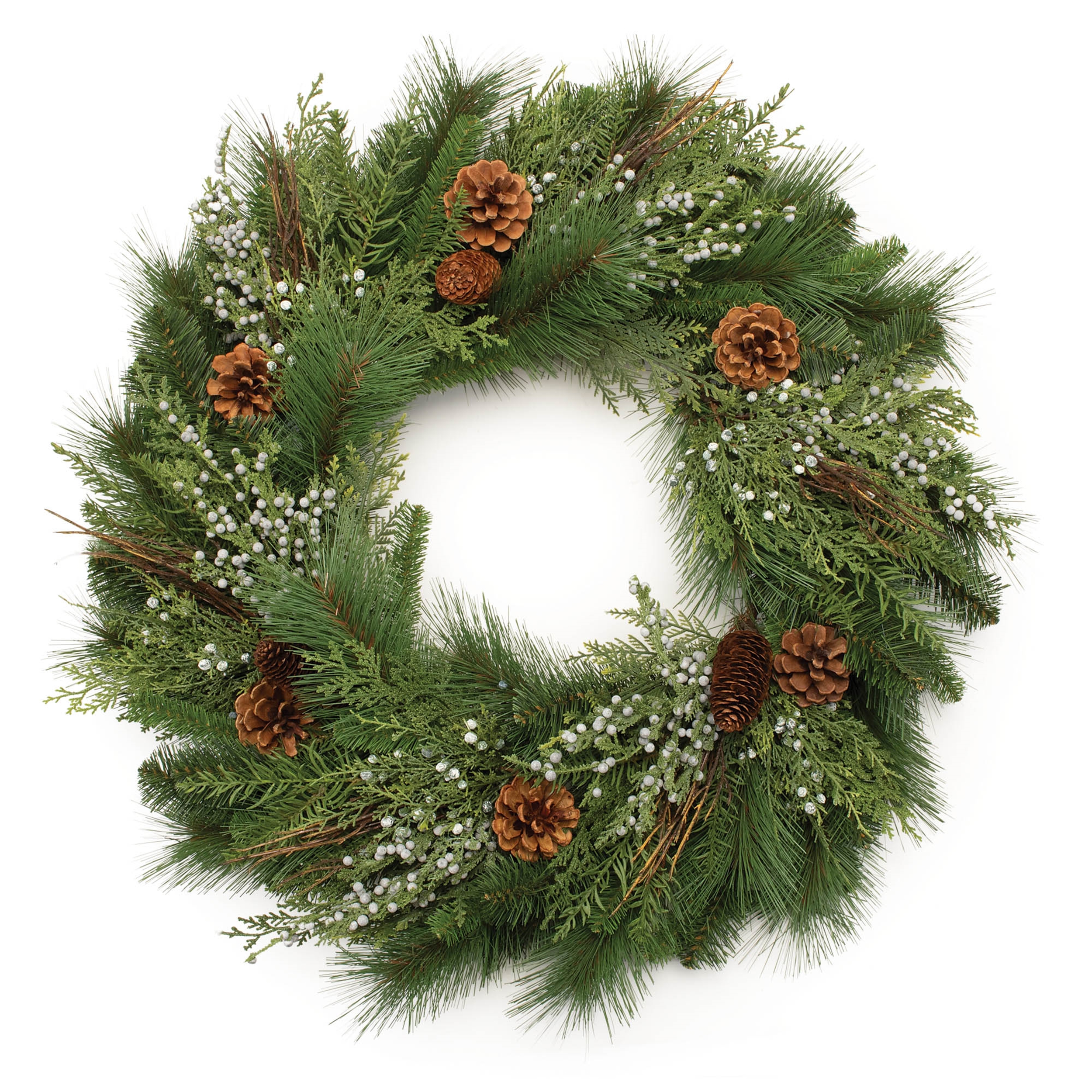 Bring the beauty of the outdoors into your home this holiday season with the Mixed Pine Juniper and Pinecone Wreath. Featuring earthy green and brown tones with subtle variegated touches, this wreath combines rustic pine foliage, juniper branches, and natural pinecone and twig accents to create a natural, earthy aesthetic. The wired branches allow for easy shaping and dimensional displays, making it a versatile addition to your seasonal decor. Hang it on your front door to warmly welcome guests or display it near your Christmas tree or fireplace mantle to add a touch of nature to your holiday festivities. Measures 30 inches across when branches are extended and fluffed.