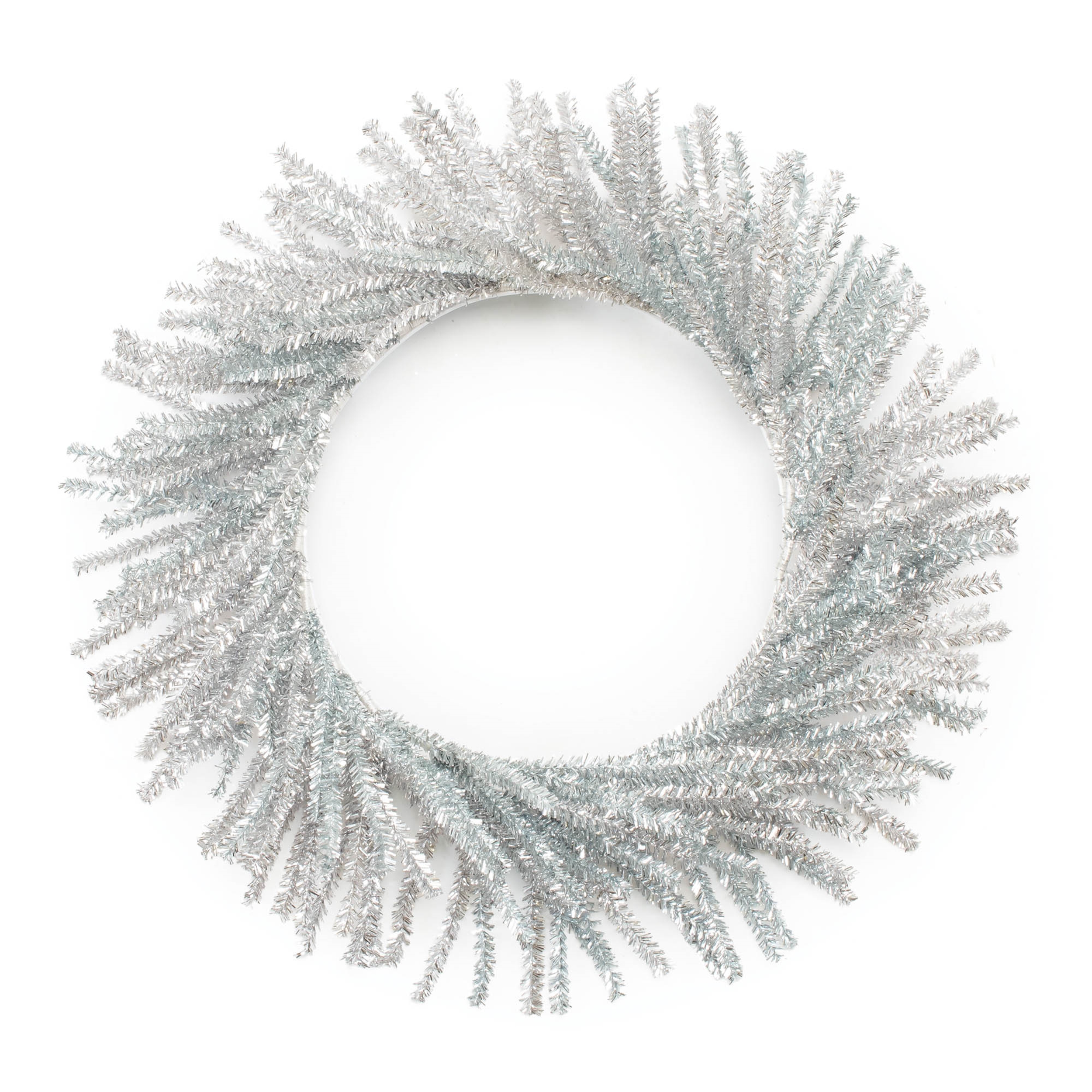 Add a sparkling touch to your holiday decor with this Tinsel Pine Wreath. Featuring festive silver tones and a metallic tinsel finish, this 21-inch wreath brings a modern and glamorous holiday look to any space. The wired branches and base provide a sturdy, full display while allowing for easy shaping and customization. Perfect for hanging on your front door, above your fireplace mantel, or as part of your Christmas tree display, this wreath is a shimmering statement piece for the season. Measures 21 inches across when branches are extended and fluffed.