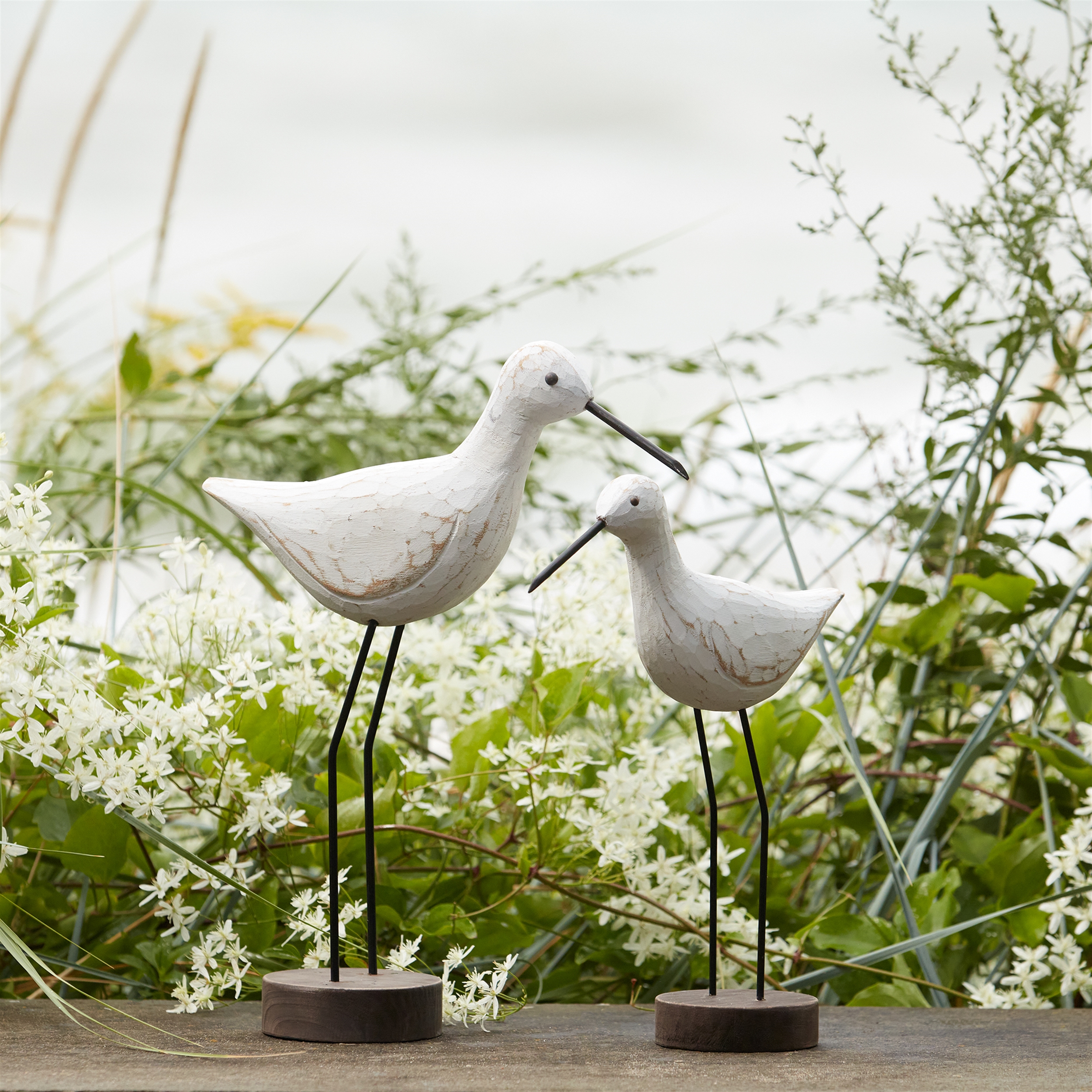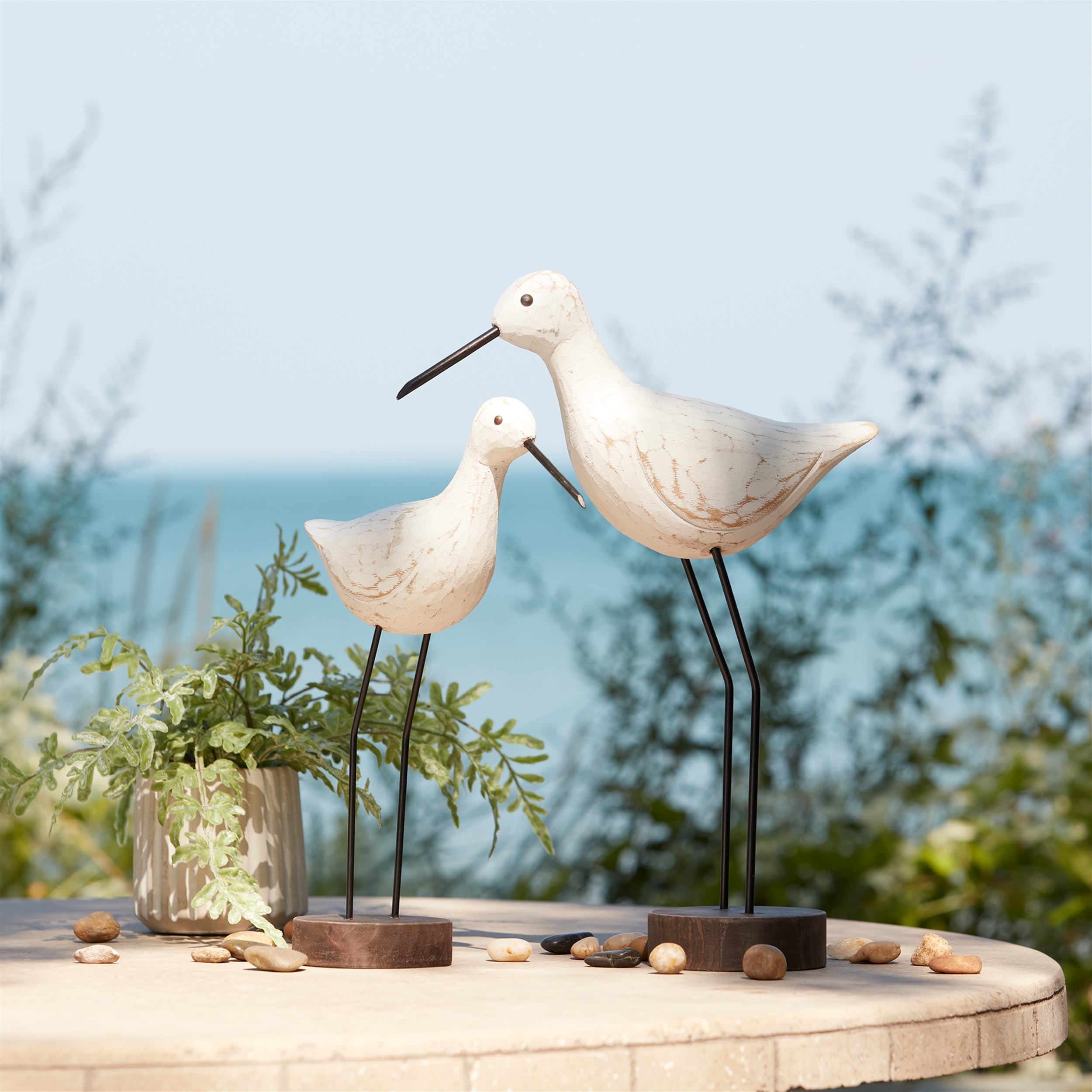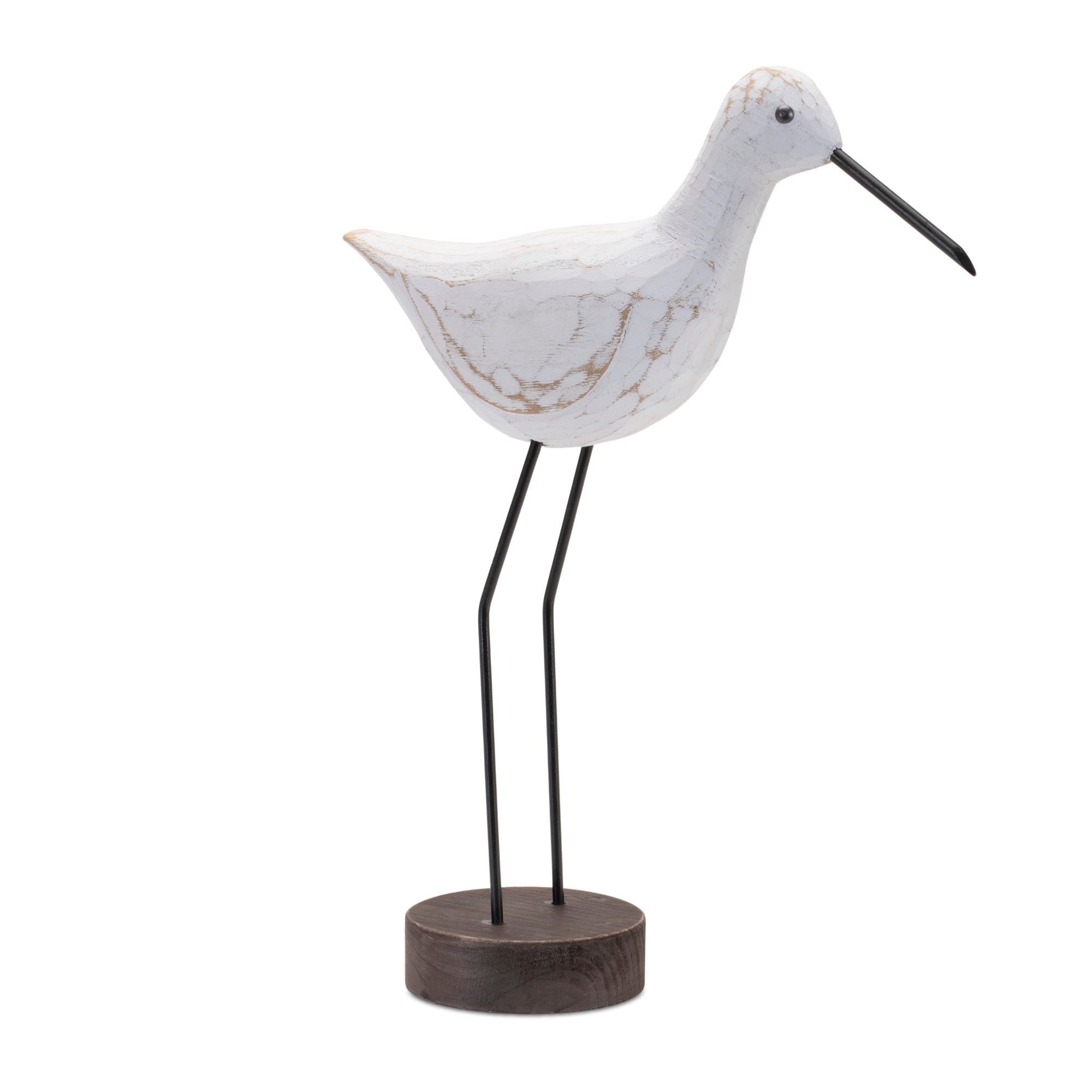 Bring the beauty of coastal living into your home with this exquisite set of Carved Wood Sea Birds with Metal Stands. Featuring a charming white-washed finish, each bird is expertly crafted from paulownia wood with rustic metal beak and stand accents. Whether displayed on a tabletop or gifted to a bird enthusiast, these stunning pieces effortlessly complement any coastal, beach, or lakehouse-inspired decor. Durable and timeless, these decorative birds add a touch of natural elegance to your home for years to come. Sold in a set of two assorted sizes to create a balanced and meaningful display in your home.