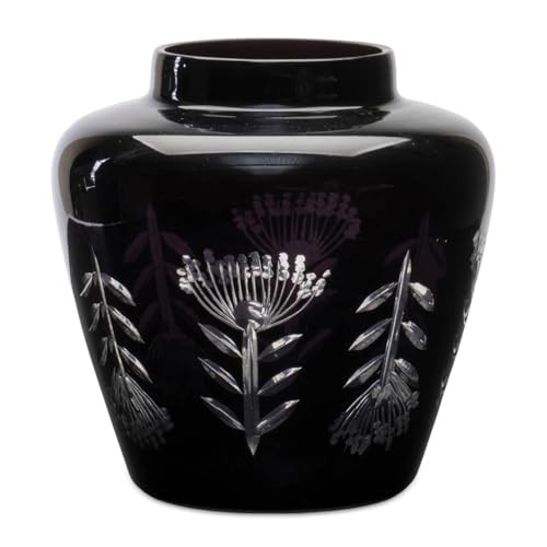 Add timeless elegance to your home with the Etched Soda Lime Glass Urn Vase. This 6.5" diameter vase features a beautifully intricate etched leaf design and a sleek black finish, making it the perfect accent for your cottage chic or modern farmhouse decor. Crafted from durable soda lime glass, it promises long-lasting beauty. Whether you're filling it with fresh flowers, dried florals, or simply showcasing it as a standalone piece, this vase is sure to enhance your space with style and sophistication. Ideal for gift-giving or adding charm to any room.