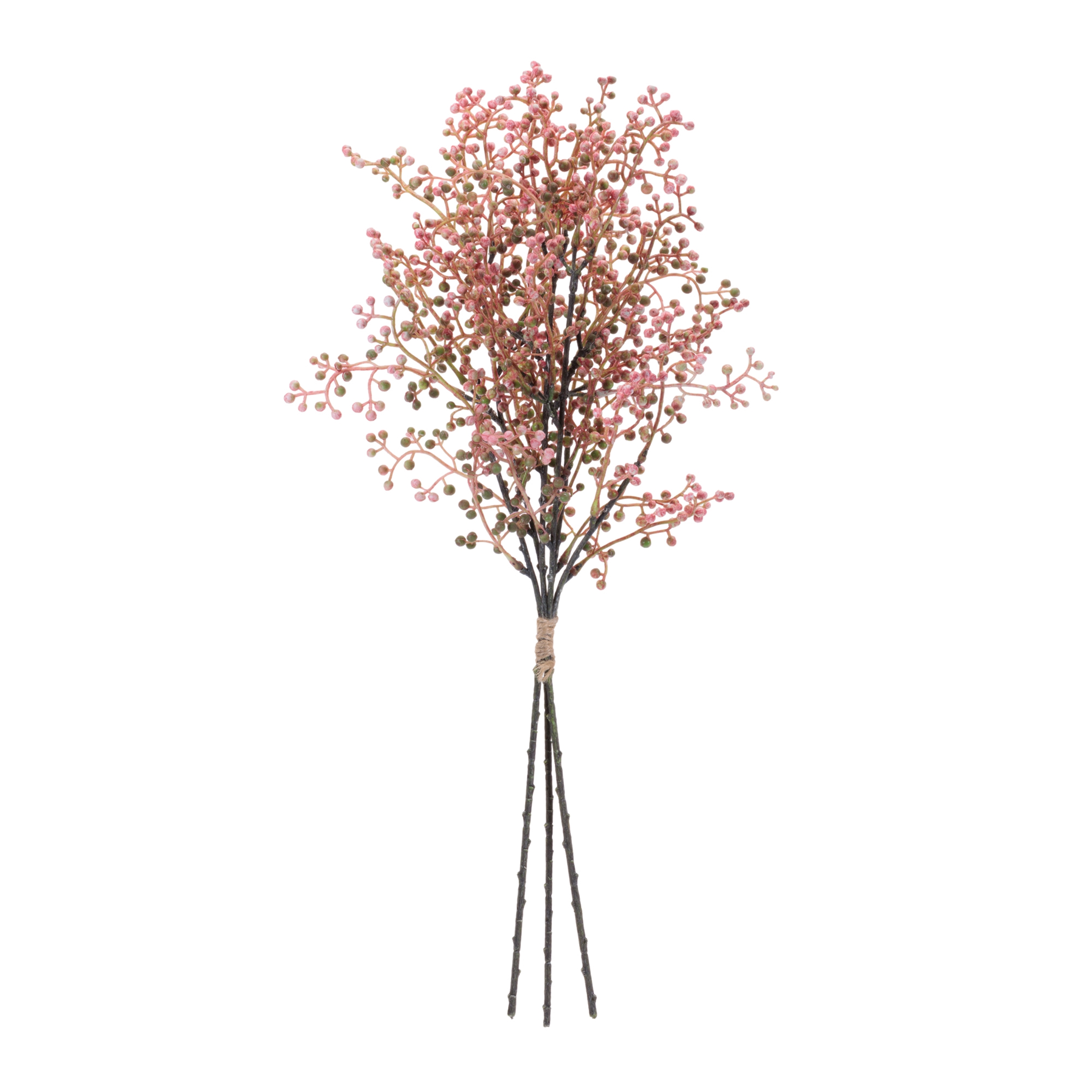 Add a delicate touch of soft pink tones with the Mini Berry Spray Bundle. This bundle features mini berry accents, perfectly bundled with raffia string for a natural, rustic look. Wired stems offer sturdy support and versatility for all your decorative needs. Display them in a tabletop vase, arrange them into a spring floral arrangement, or weave them into a wreath or garland for a pop of color and charm. Sold in a set of 6 matching pieces, this spray adds timeless beauty to any home decor..