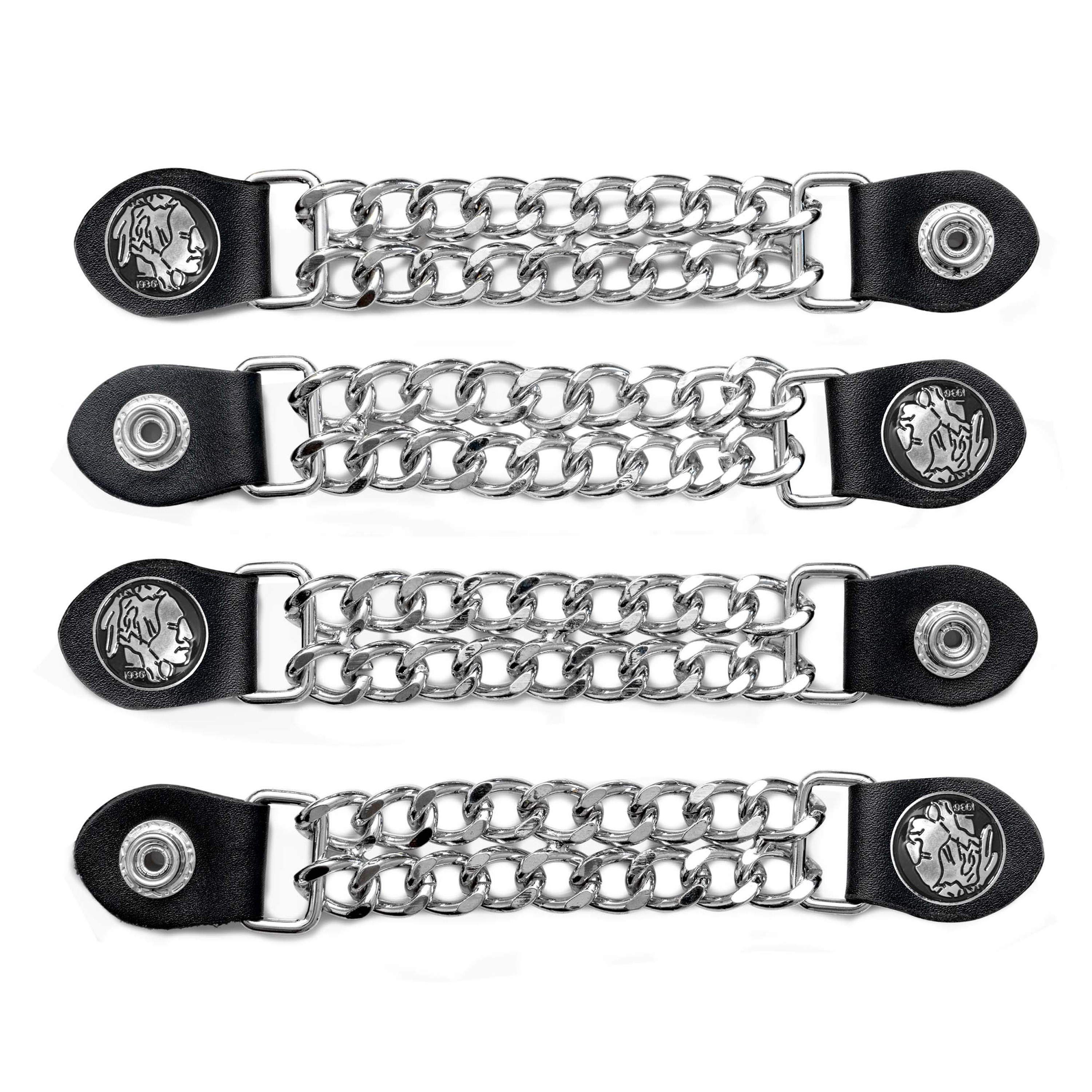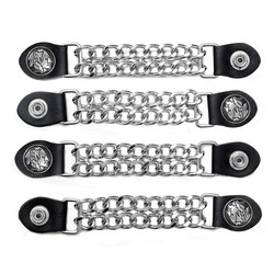 Inject an element of comfort and style into your road gear. These vest extenders showcase unique designs while you get a bit more breathing room out of your garment. Includes: 4pc faux leather and chrome chain extender with Indian Head medallions. Measures 6-1/2 x 1 . Not sold individually.