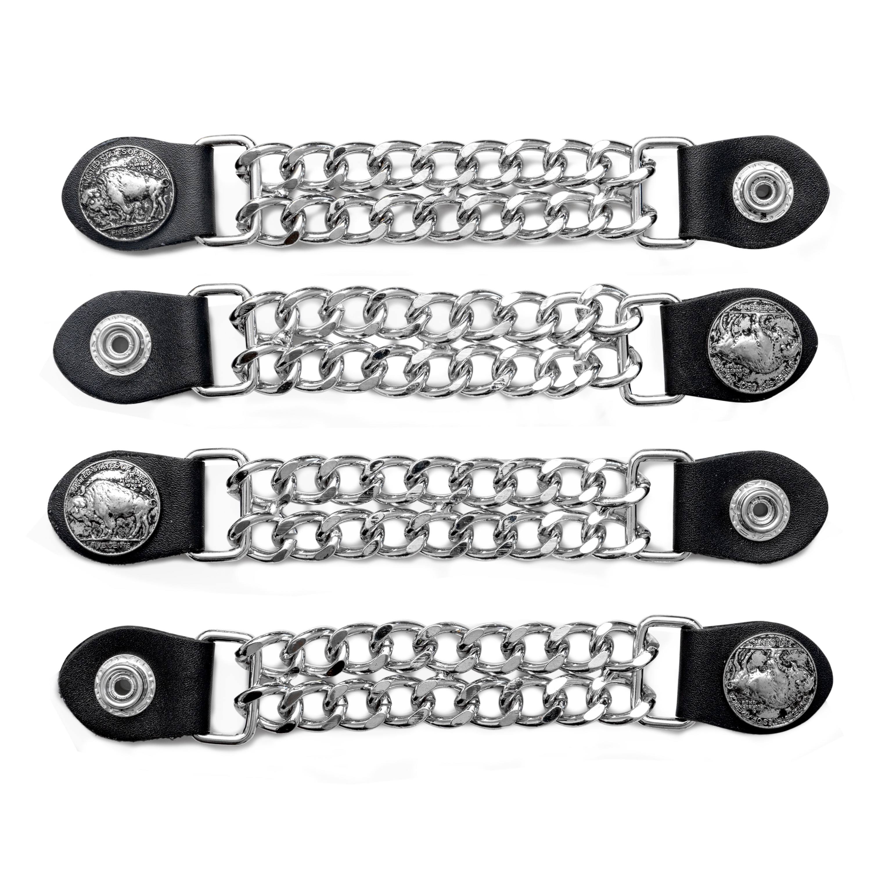 Inject an element of comfort and style into your road gear. These vest extenders showcase unique designs while you get a bit more breathing room out of your garment. Includes: 4pc faux leather and chrome chain extender with Buffalo Head Nickel medallions. Measures 6-1/2 x 1 . Not sold individually.