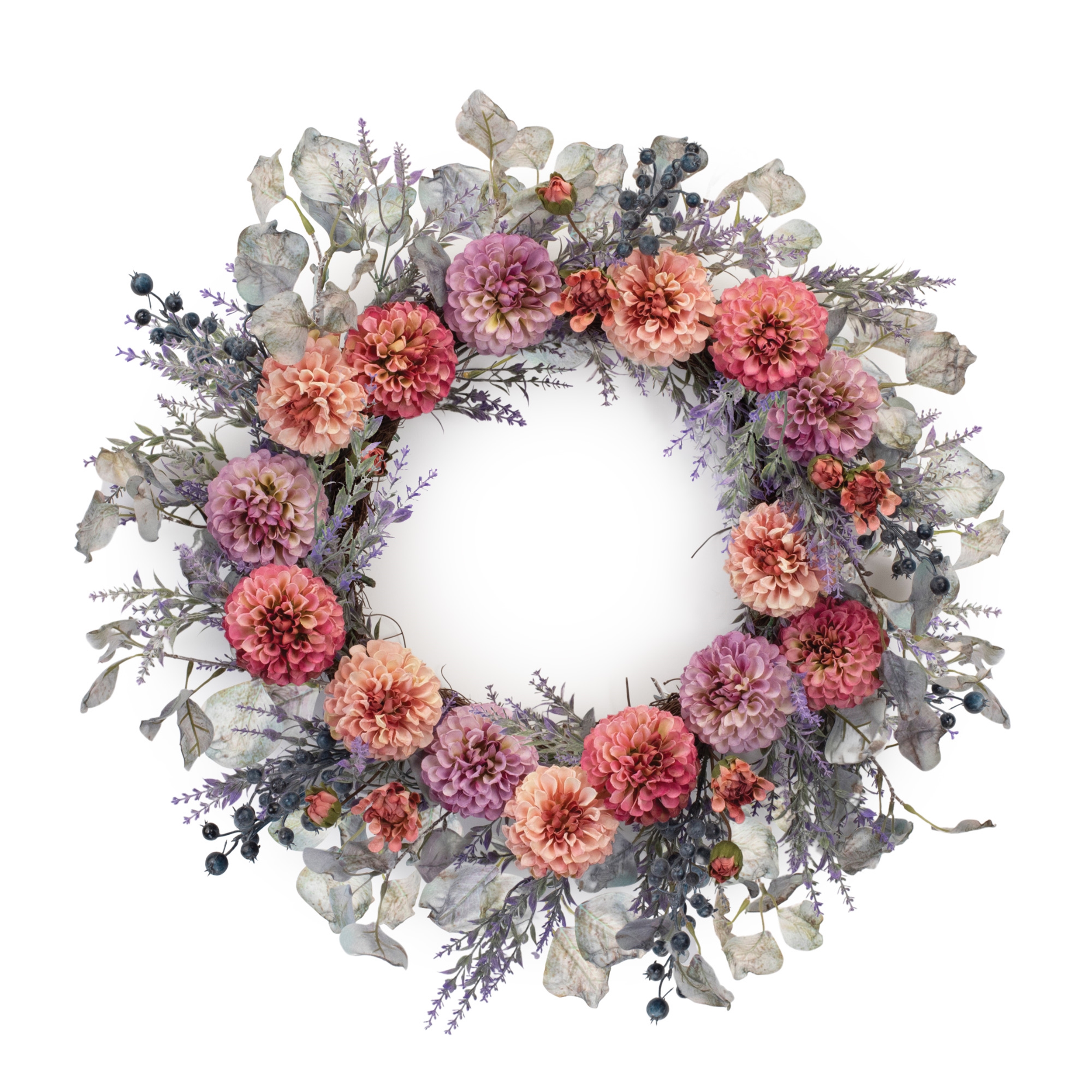 Brighten your home with the vibrant charm of the Mixed Zinnia Floral Wreath. Featuring a stunning mix of purple and pink blooms, this 24-inch wreath adds a burst of color and warmth to any space. Its lush design, crafted from high-quality polyester and plastic, is set on a durable grapevine twig base, making it perfect for both indoor and covered outdoor use. Whether hanging on your front door or placed above a mantel, this wreath exudes a welcoming and cheerful atmosphere for your home. Bring nature's beauty indoors with the Mixed Zinnia Floral Wreath! Measures 24 inches across when branches are extended and fluffed.
