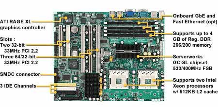 Tyan Tiger GC-SL S2727GN-533 Socket 604 Motherboard,  Intel Based Socket 604, ServerWorks Grand Champion SL chipset, ATX Form Factor, Onboard Video, Dual LAN, Up to 4 GB in Ram DDR, 3 PCI 64 bits, 2 PCI 32 bits,  ATX Factor