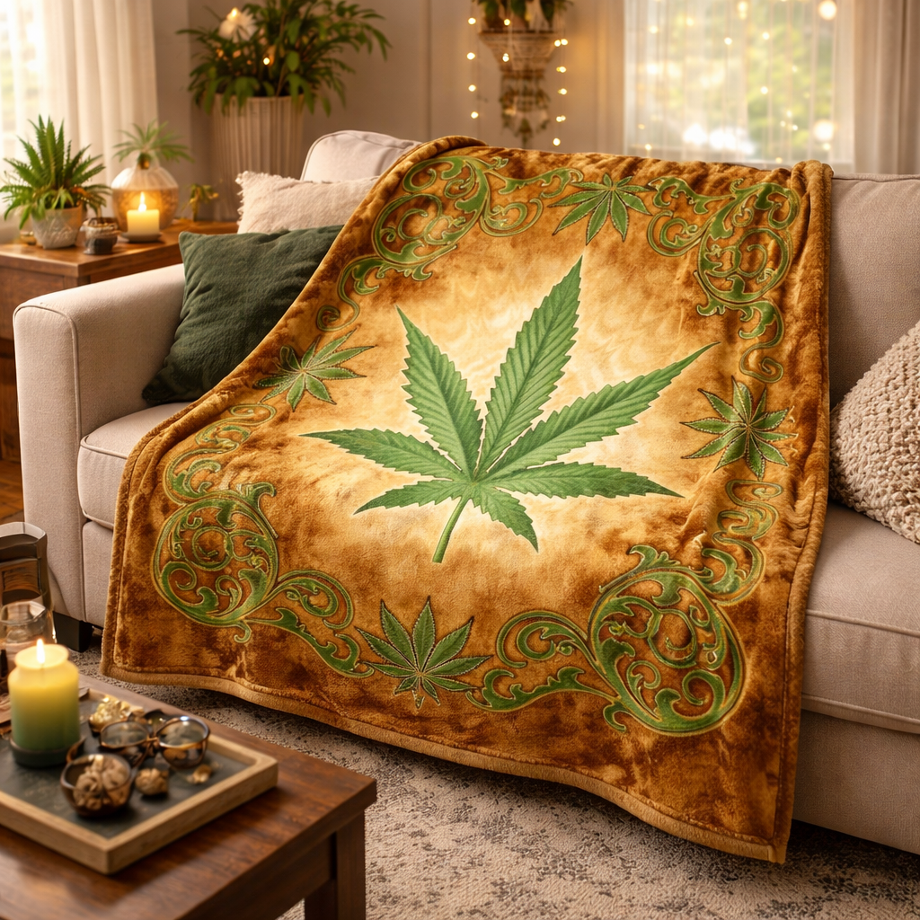 Wrap yourself in luxurious warmth and display your respect for nature. The Sacred Herb Luxury Blanket is 100% polyester, and fits a queen or king size bed. Measures 79" x 91". Design features stunning marijuana leaf design on a background of gold and cream.