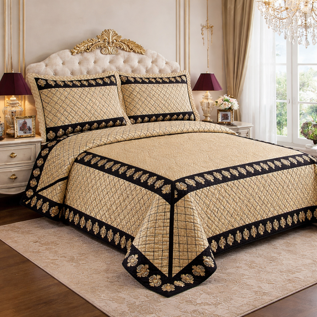 Damascus - Luxury Plush Quilted Bedspread with 3D Embroidery3 Piece Quilt Set - Vintage Royal Gold Design Bedspread |