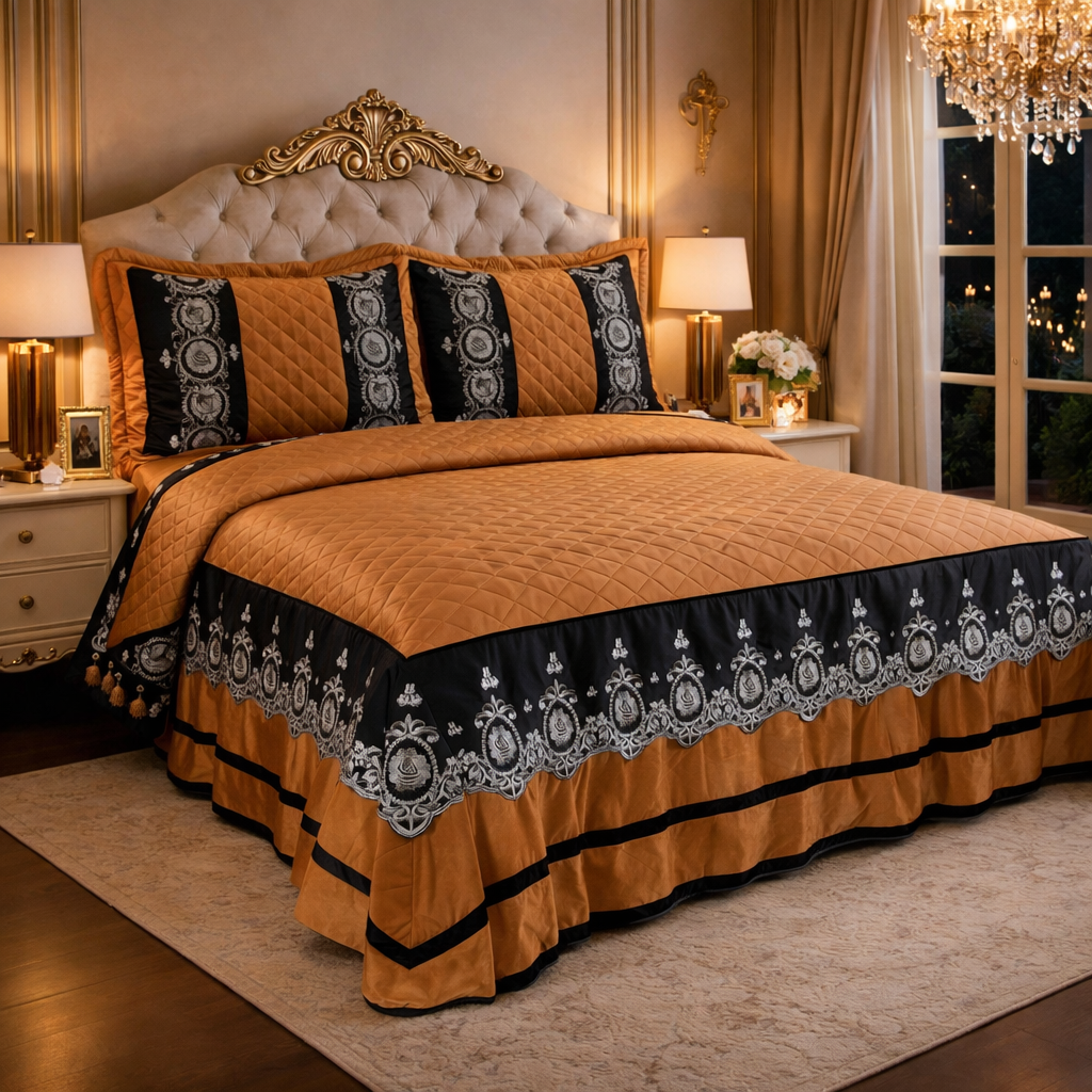 Istanbul Gold - Luxury Velvet Bedspread with Ruffle3 Piece Set - Vintage Royal Design Coverlet |