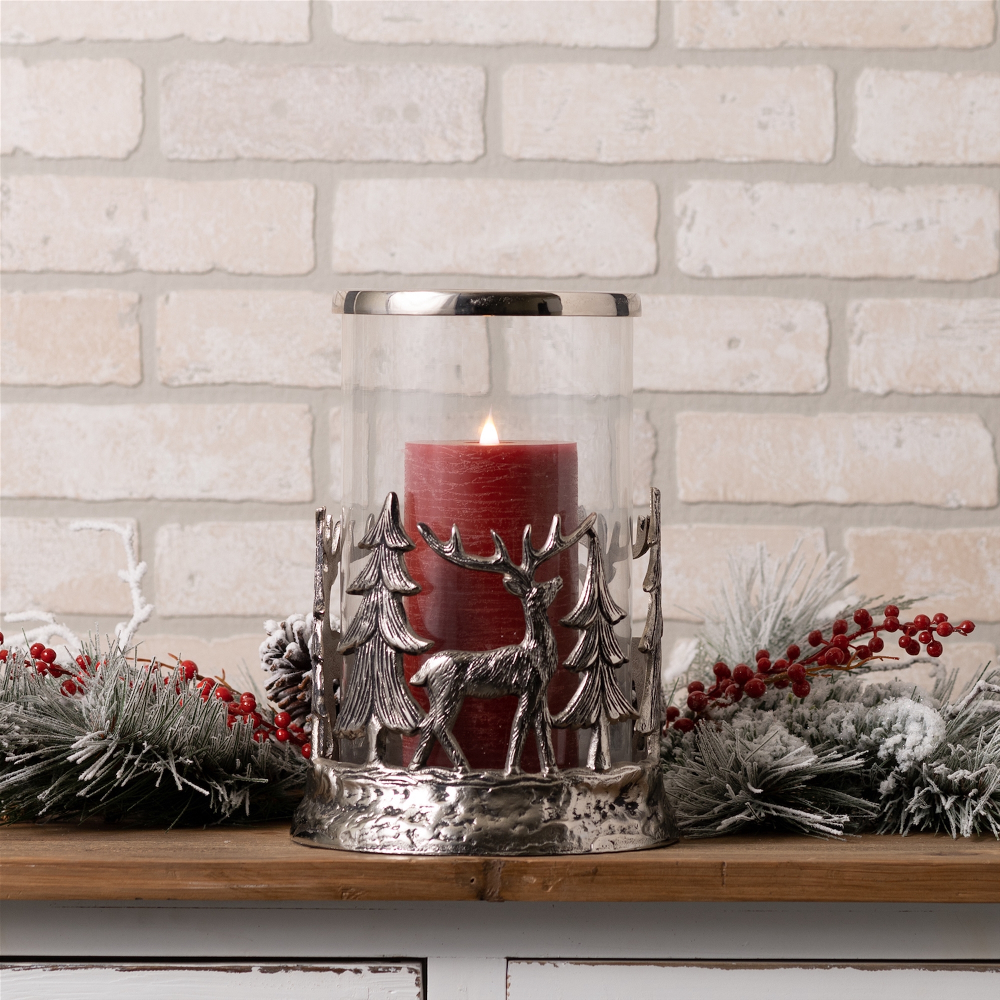 Add a charming woodland touch to your holiday decor with the Etched Metal Deer and Tree Candle Holder. Standing 11" tall and featuring a stunning etched metal design, this piece is perfect for rustic and cabin-inspired holiday displays. The detailed woodland scene, with deer and pine trees, creates a warm, inviting atmosphere when paired with a candle (sold separately). Crafted from durable aluminum and glass, this elegant holder will be a seasonal favorite for years to come.