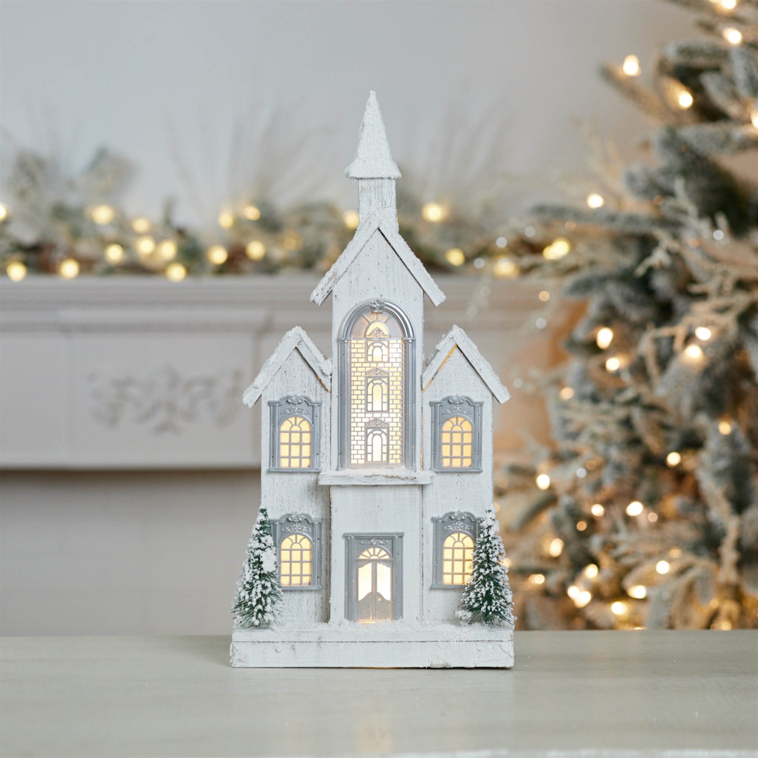 Bring the beauty of a snow-covered holiday village into your home with the LED Flocked Wooden Church. Crafted with wintry white and silver tones, this classic church design features arched windows and snowy pine tree accents, creating a peaceful and elegant seasonal display. The built-in LED lights cast a warm and inviting glow, making it a perfect centerpiece for mantels, tabletops, or festive arrangements. Battery-operated for easy placement, it also includes a USB cord option for added versatility.