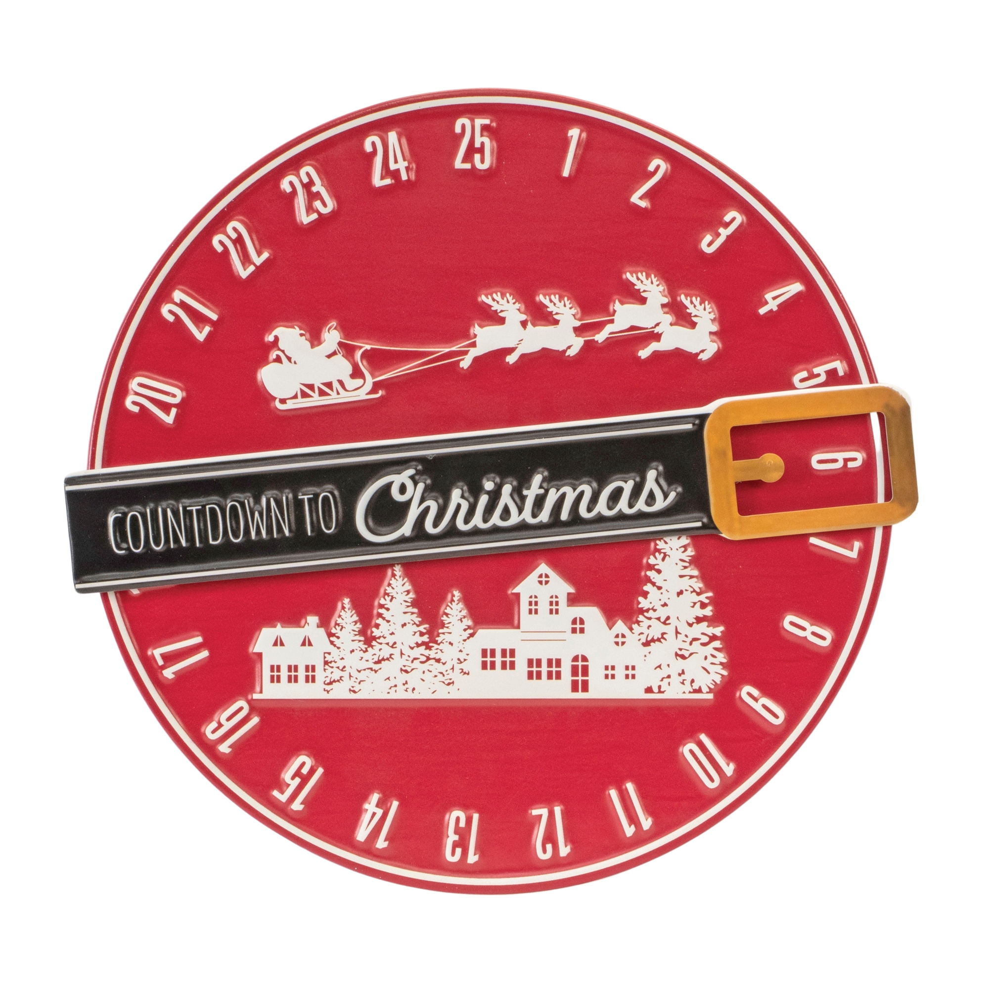 Make the anticipation of Christmas even more magical with the Santa Belt Christmas Countdown. Shaped like a festive red disk, this charming metal countdown features a bold black belt with golden buckle that slides to mark the days until December 25th. White silhouette art of Santa in his sleigh with reindeer, along with a snowy village scene, adds whimsical holiday charm. At 16 inches in diameter, it s a statement piece perfect for hanging on a wall, placing on a mantel, or incorporating into a holiday display.