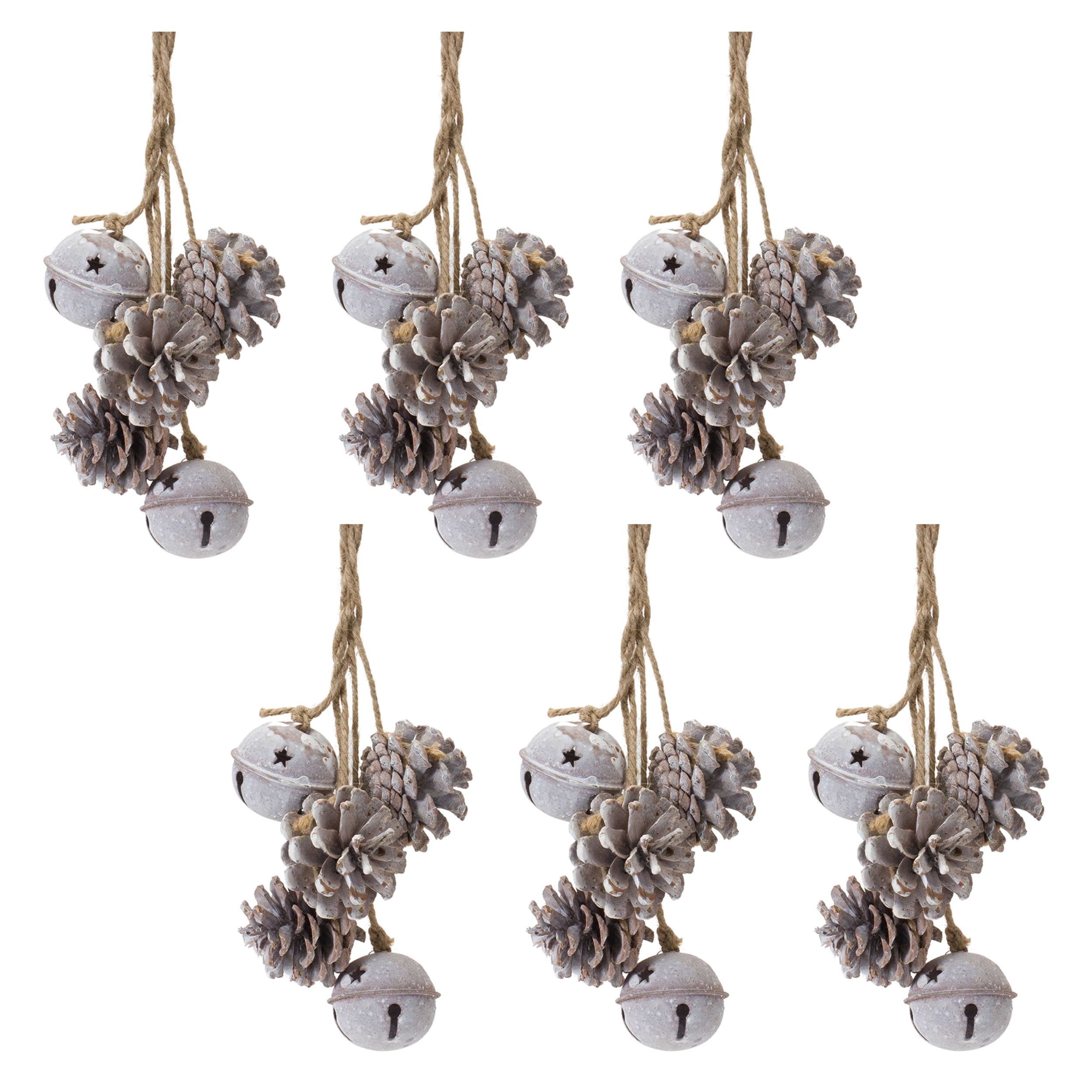 Bring a rustic charm to your holiday decor with this stunning Bell and Pine Cone Ornament Set. Featuring beautifully crafted ornaments, this set effortlessly enhances your Christmas tree, holiday porch pots, and festive table displays. The wintry brown and white tones, combined with natural pinecones and elegant iron bells, create a timeless holiday accent. Designed for both indoor and covered outdoor use, these ornaments are crafted from durable materials to bring seasonal joy year after year. Elevate your holiday decor with this classic and nature-inspired ornament set! Sold in a set of six pieces to make a statement in any holiday seasonal display.