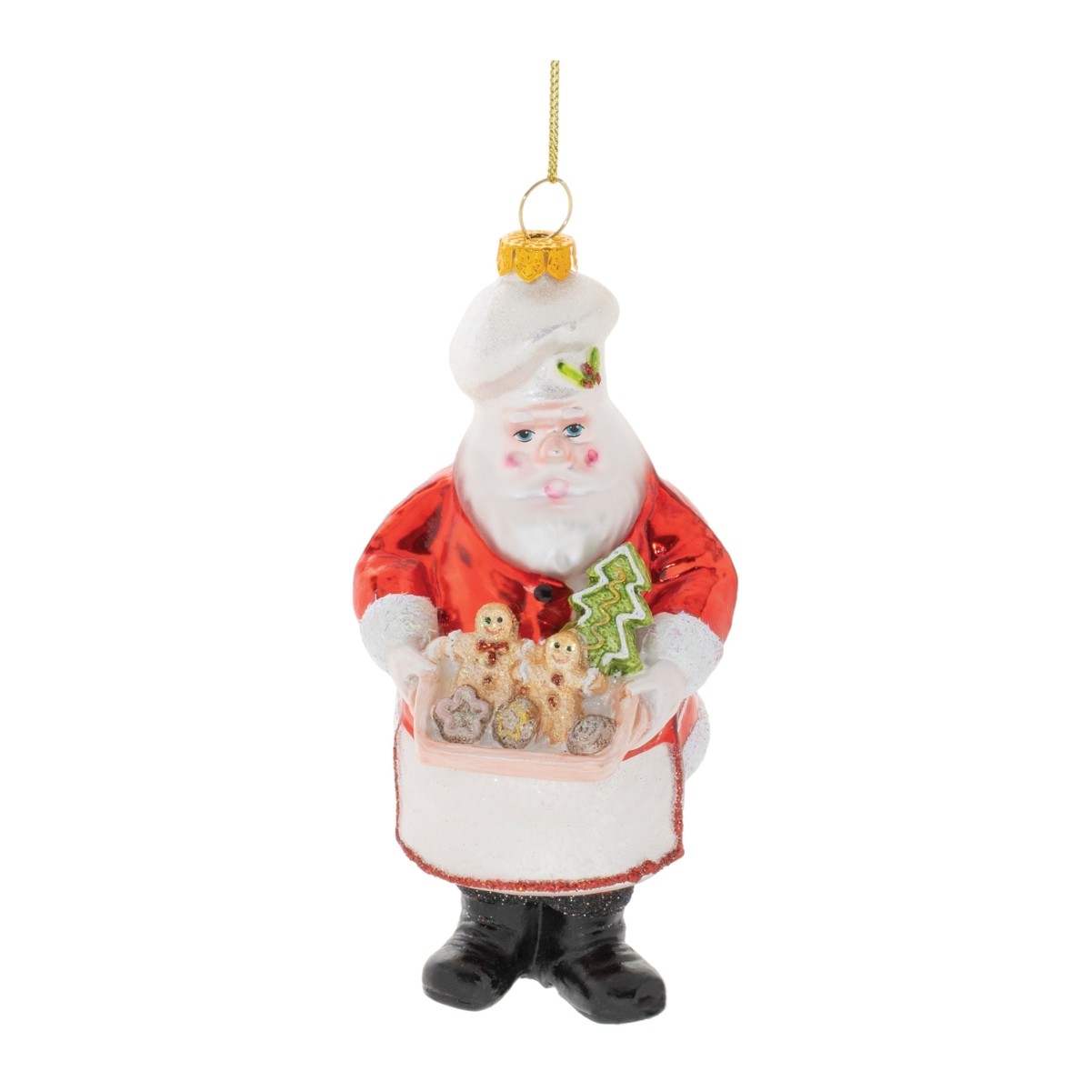 Bring a whimsical holiday charm to your decor with these Glass Baking Santa Ornaments. Designed in festive red, white, and green tones with glittered accents, each ornament features Santa Claus holding a baking tray filled with gingerbread men and pine tree cookies for a cozy, baking-inspired touch. The gold ornament cap and delicate string hanger make them perfect for displaying on your Christmas tree, wreaths, or garlands. A delightful gift for bakers or anyone who loves the magic of holiday sweets and traditions.