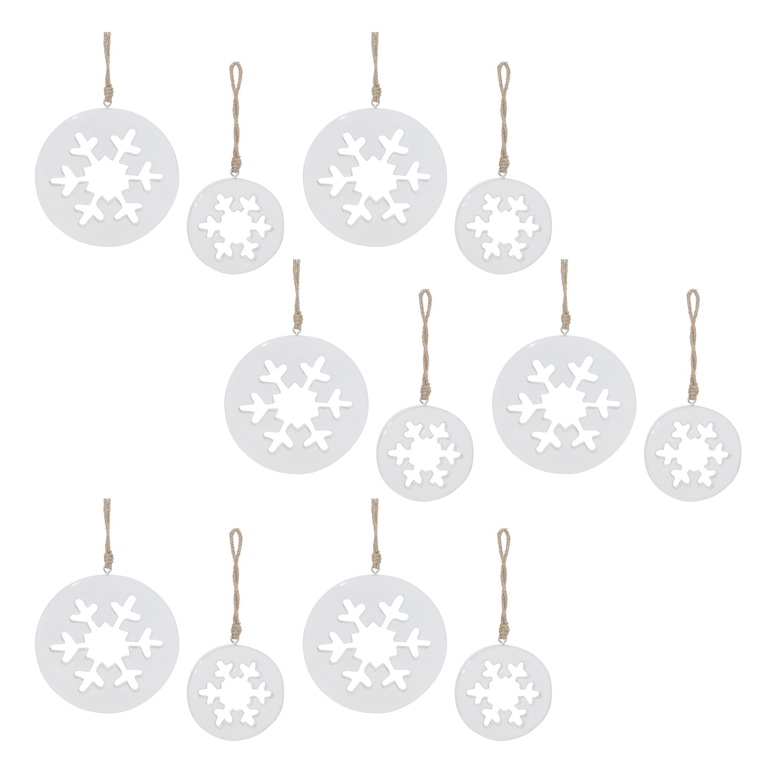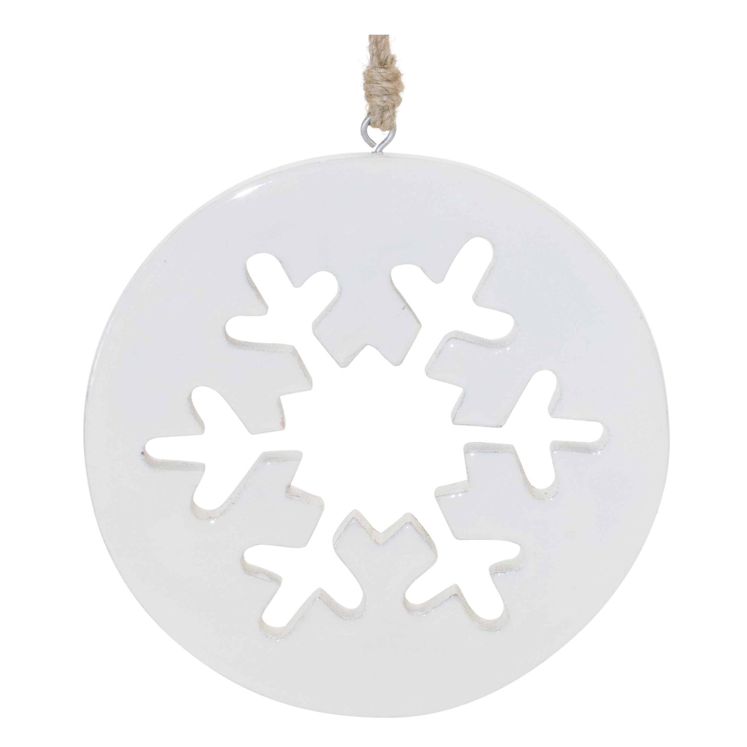 Add a charming, rustic touch to your holiday decor with this set of White Wood Snowflake Cut-Out Ornaments. Crafted from solid wood and featuring a delicate cut-out snowflake design, these ornaments bring a timeless wintery feel to your Christmas tree. Each ornamnet is finished in crisp white with a natural jute string for easy hanging. Whether adorning your own home or given as a thoughtful holiday gift, these ornaments are perfect for creating a warm and festive seasonal display. Sold in a set of twelve pieces with two assorted sizes to create a balanced display on your Christmas tree.