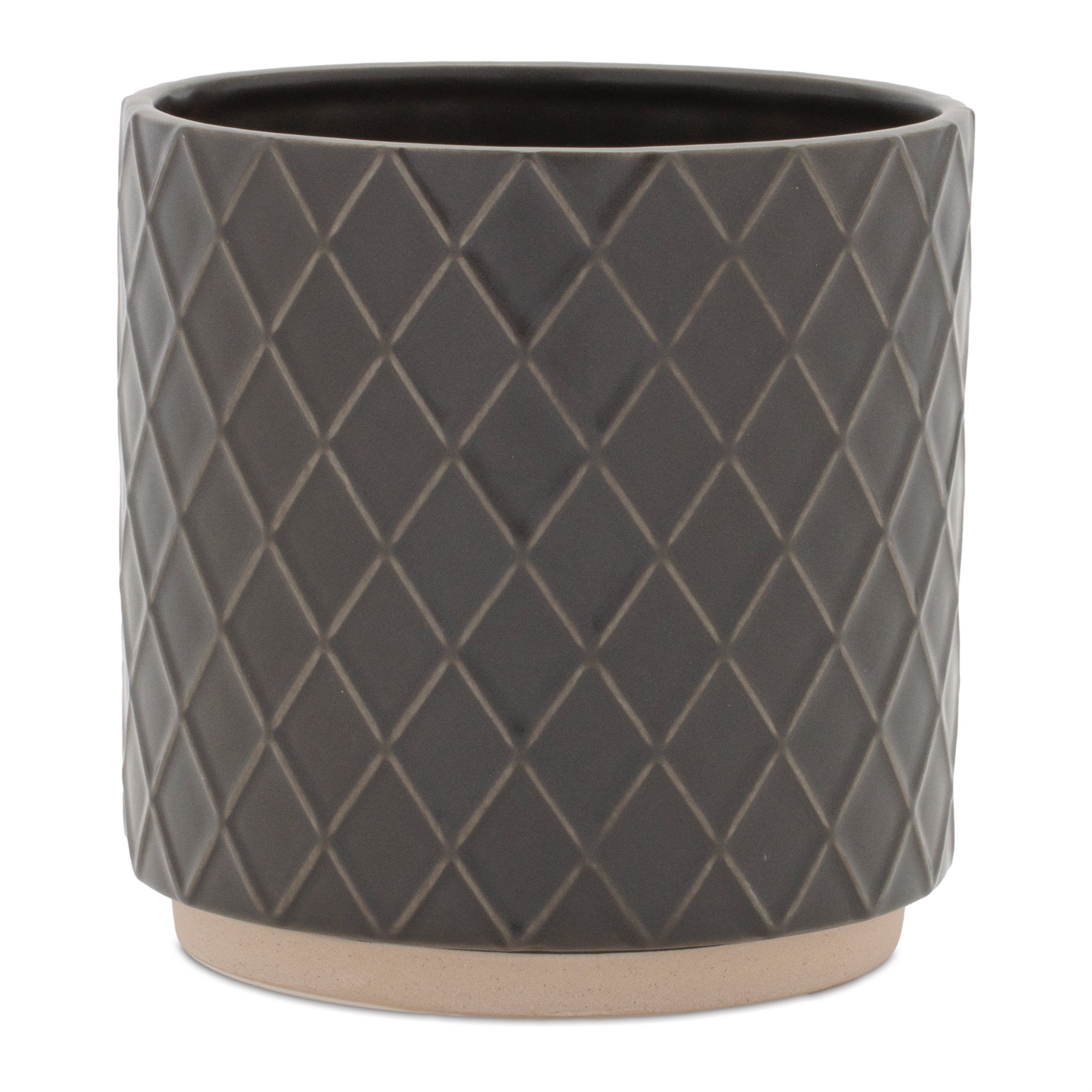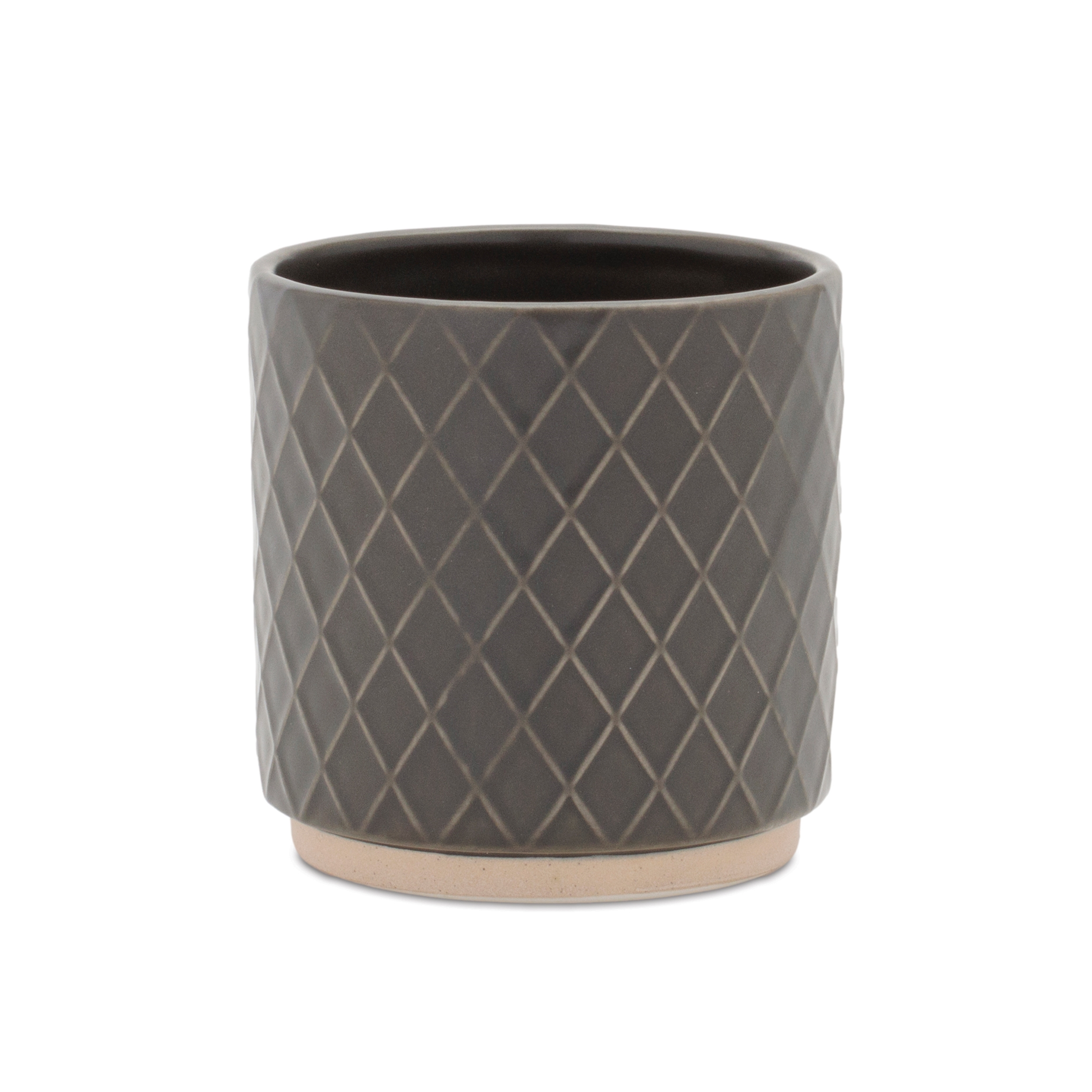 Add a modern touch to your space with the Ceramic Diamond Pattern Planter Set. Featuring cool grey and beige tones with a sleek glazed finish, these planters are designed with a striking diamond texture pattern. The set of two matching pieces offers a cohesive look that complements a variety of decor styles. Perfect for showcasing both real and faux potted plants, these planters are versatile and suitable for both indoor and outdoor covered use.