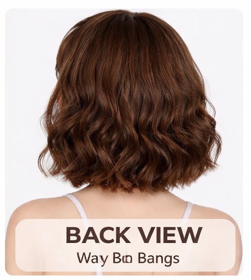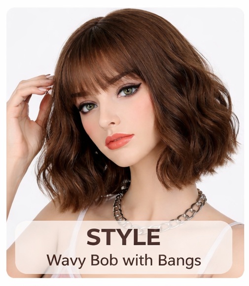 • Style: Wavy bob wig with bangs (classic face-framing look)