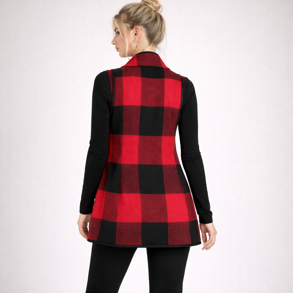 Upgrade your layering game with this fashion-forward red and black buffalo plaid cardigan vest, designed to deliver a flattering silhouette with effortless style.