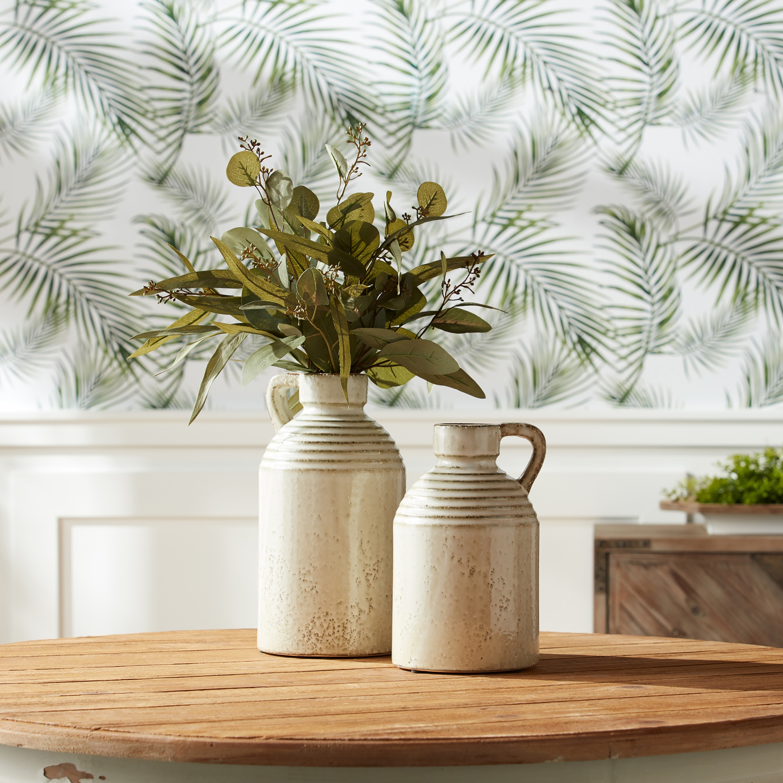 Elevate your home decor with this Rustic Ceramic Jug Vase, crafted from durable terracotta with a soft, washed cream and grey finish. Designed to bring timeless charm to any space, its classic jug silhouette and rustic speckled glaze make it the perfect accent for farmhouse, country, or vintage-inspired interiors. Whether styled with dried blooms or displayed on its own, this jug adds a warm, handcrafted touch to your tabletop or shelf. Ideal for indoor spaces or covered patios, this piece is built to last through the seasons.