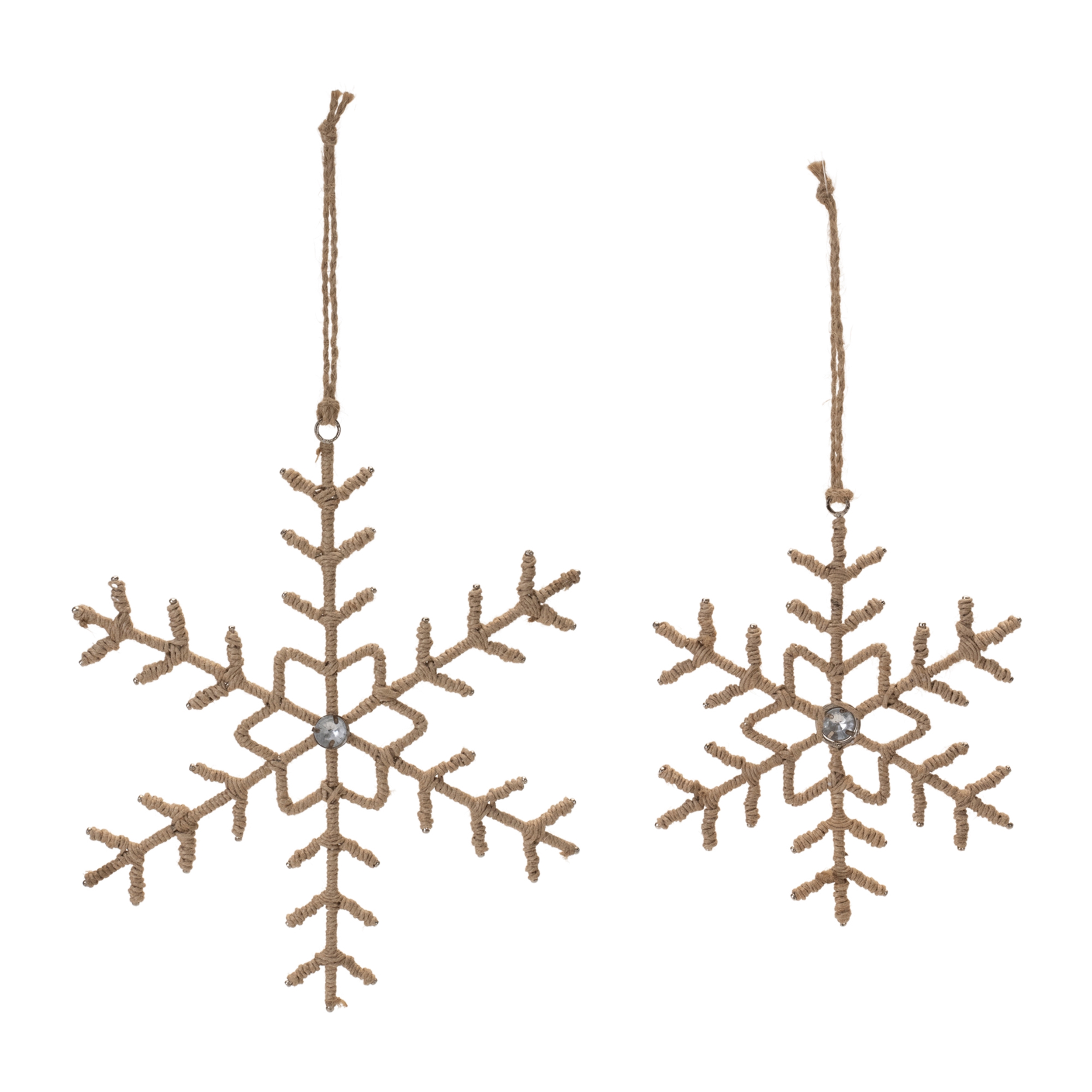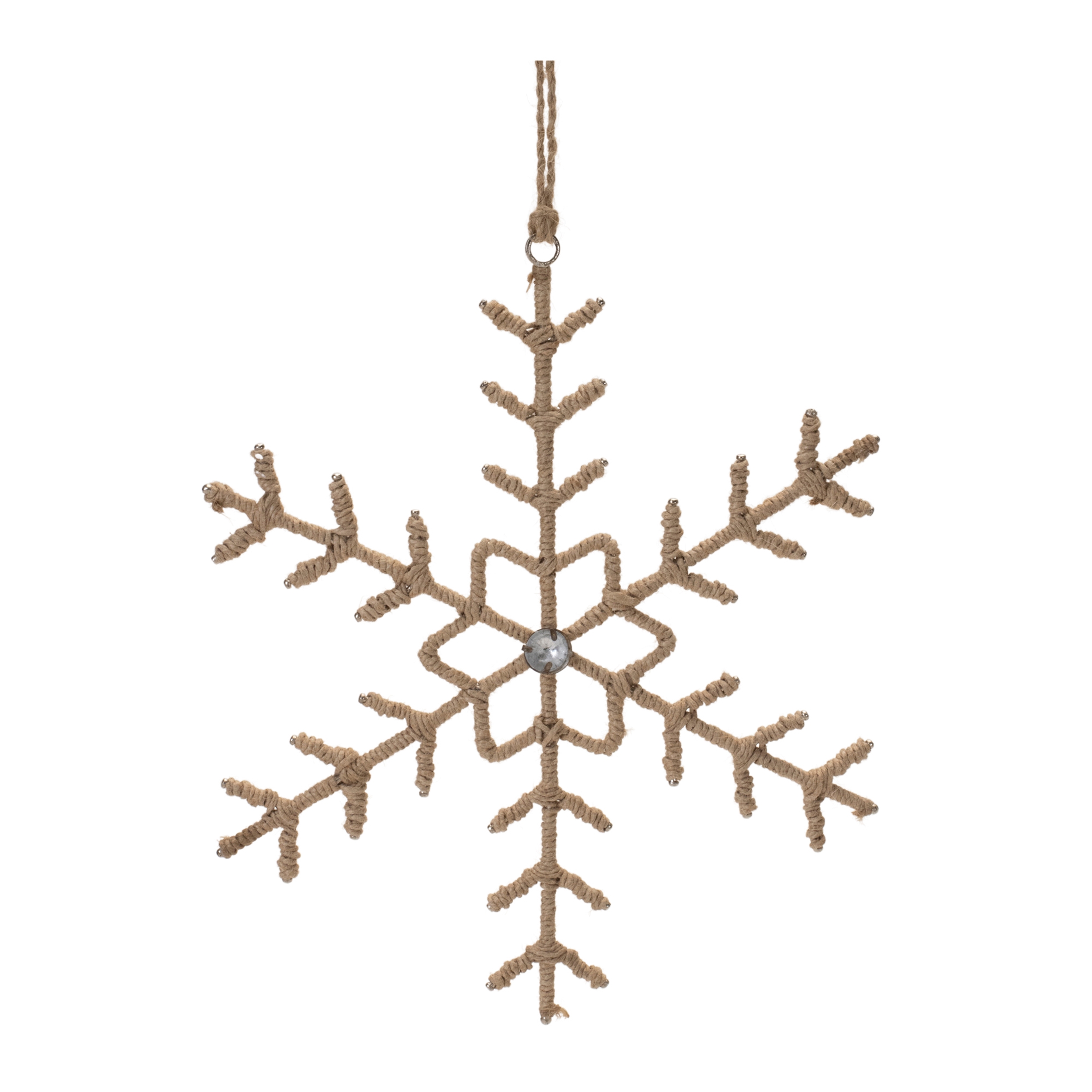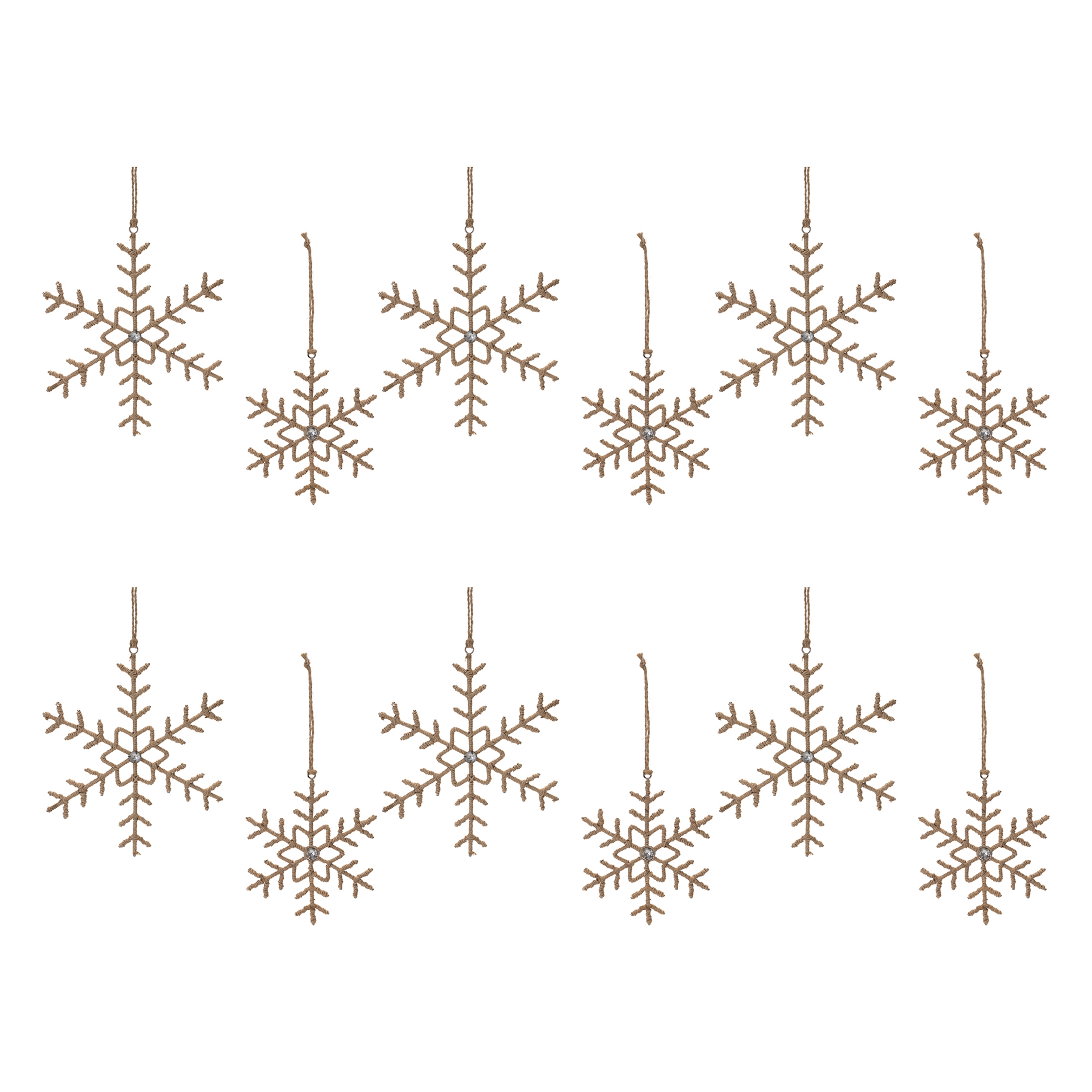 Bring a rustic yet elegant touch to your holiday decorations with this Jute Wrapped Metal Snowflake Ornament set. These snowflakes are made from durable iron metal and wrapped in natural jute, offering a perfect blend of charm and craftsmanship. The intricate snowflake design, accented with jewel-like details, creates a festive atmosphere that enhances your Christmas tree, mantle, or commercial display. With their natural beige tones and sturdy string hangers, these ornaments will make a lasting impression season after season. Sold in a set of twelve pieces with two assorted sizes to create a balanced display on your Christmas tree.