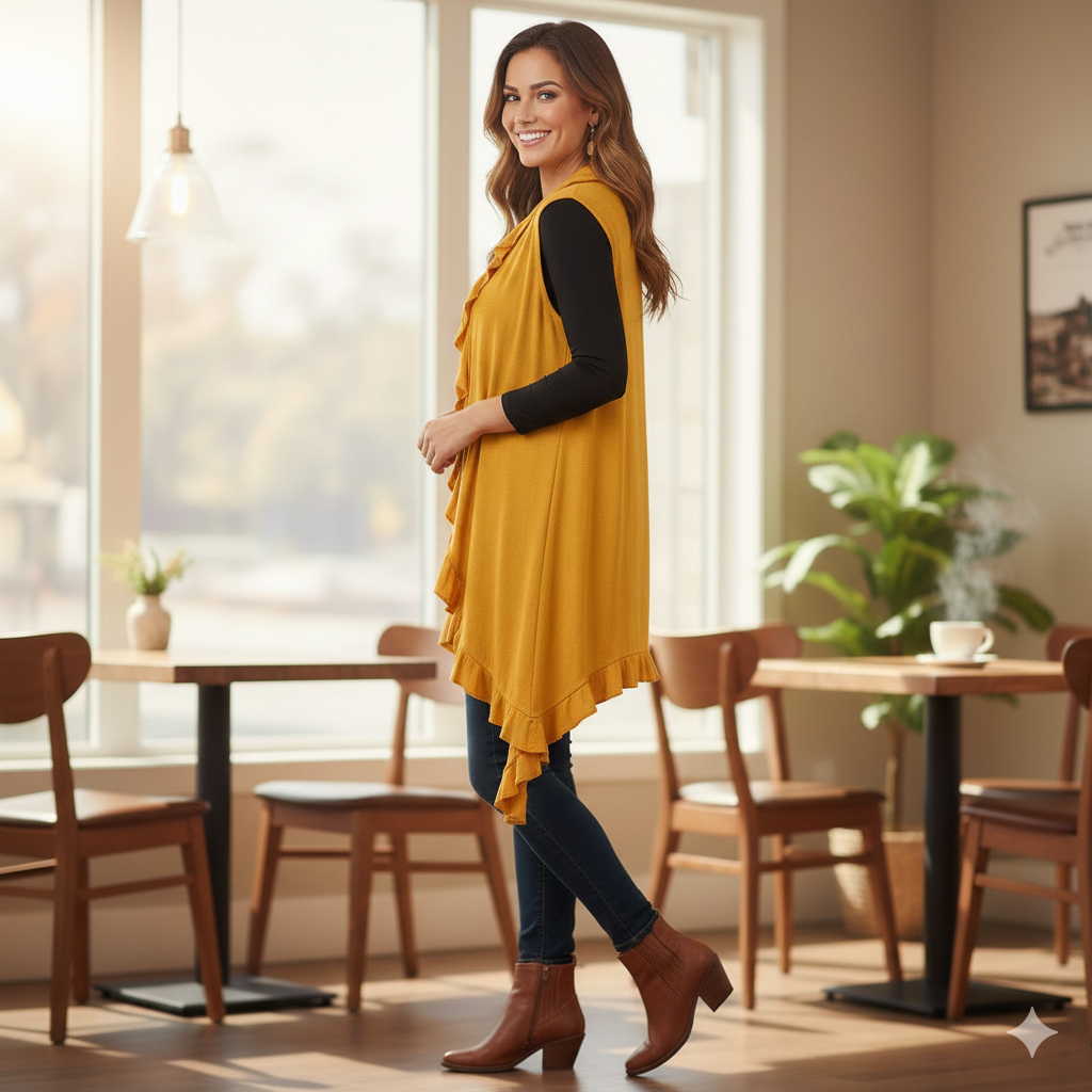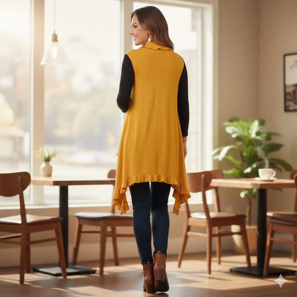 Wavy Ruffle Hem Cardigan Duster Topper Golden Mustard Hi-Low Knee Length
