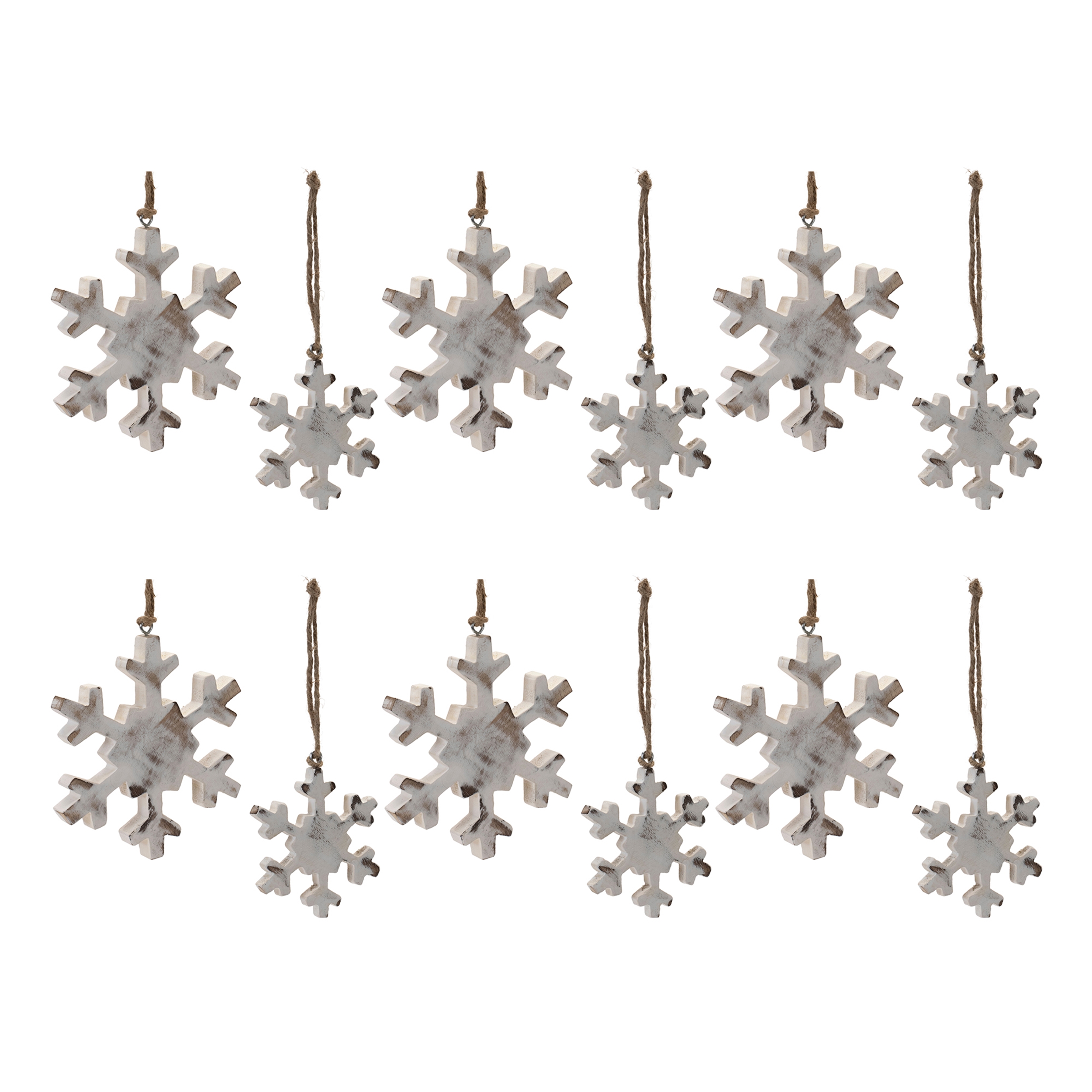 Bring the beauty of nature into your holiday celebrations with this set of White Washed Wood Snowflake Ornaments. Crafted from high-quality wood and designed with a charming snowflake shape, these ornaments create a rustic woodland vibe that will enhance your Christmas tree with style. Each ornament is carefully finished with a trendy white wash and comes with a durable jute string hanger for easy display. Perfect for adding festive cheer to your home or gifting to loved ones, these ornaments will shine season after season. Sold in a set of twelve pieces with two assorted sizes to create a balanced display on your Christmas tree.