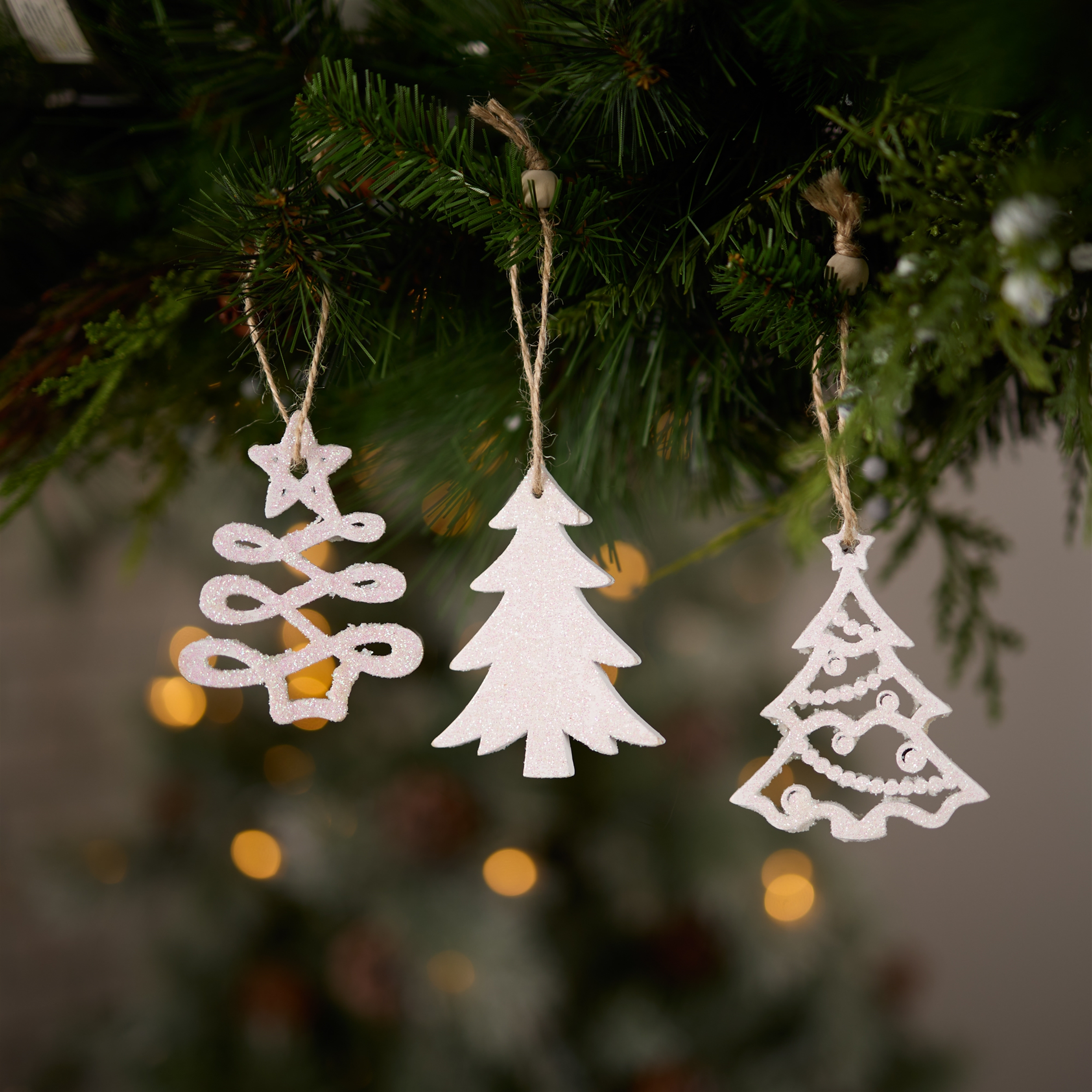 Add a touch of rustic charm to your Christmas tree with this set of beautifully crafted Wood Tree Tag Ornaments. Featuring an elegant white finish and a delicate bead accent, these ornaments bring a warm, festive glow to your holiday decor. With two unique designs, including a cut-out pine tree pattern, this set will complement any Christmas tree, making it the perfect gift or keepsake for years to come. Each ornament comes with a string for easy hanging, making decorating a breeze. Ideal for indoor use, these ornaments are a delightful addition to your seasonal celebrations. Sold in a set of nine matching pieces to make a statement on your Christmas tree.