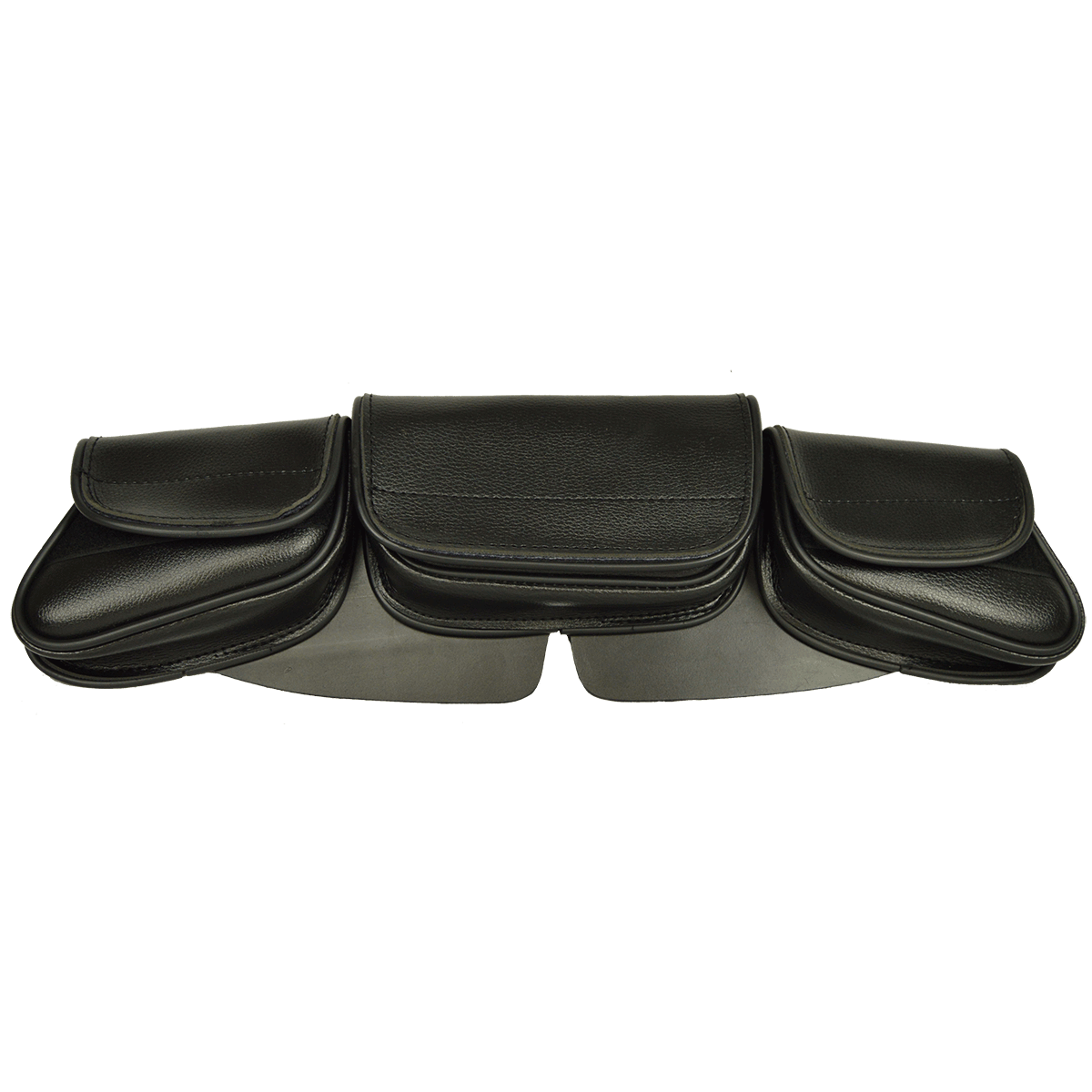 3 Compartment Studded Windshield Bag Handy bag attaches to the windshield of your bike and has three magnetic hook and loop close pockets. FEATURES: Heavy duty PVC construction Three compartments Hook and loop close pockets Stud trim.
