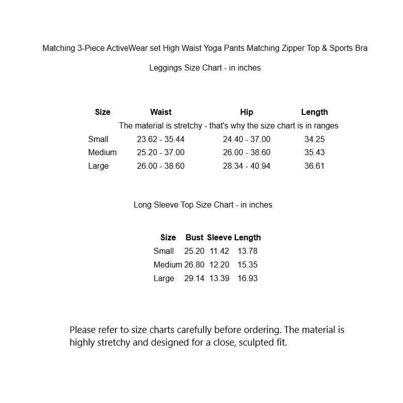 3-Piece ActiveWear set High Waist Yoga Pants Matching Zipper Top & Sports Bra