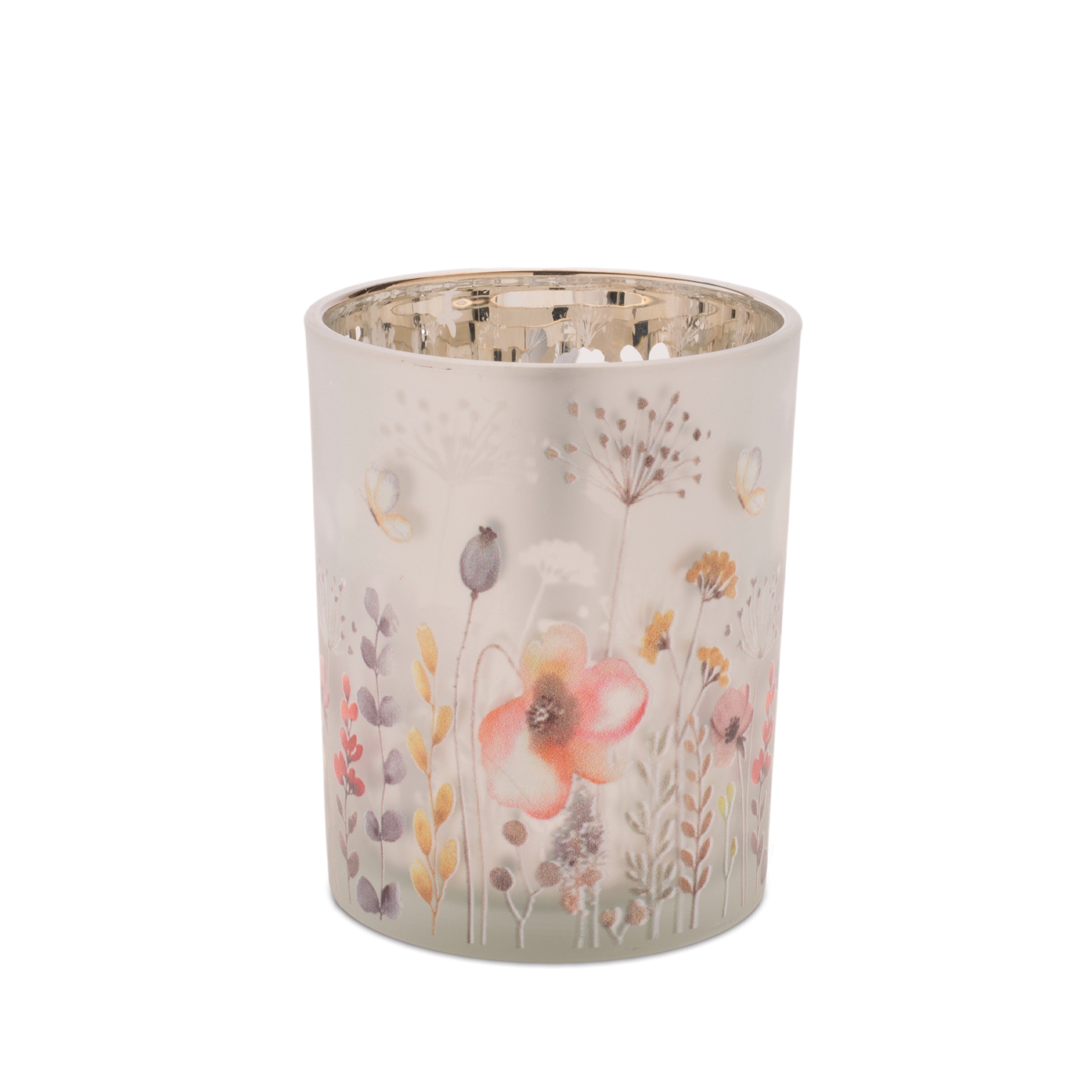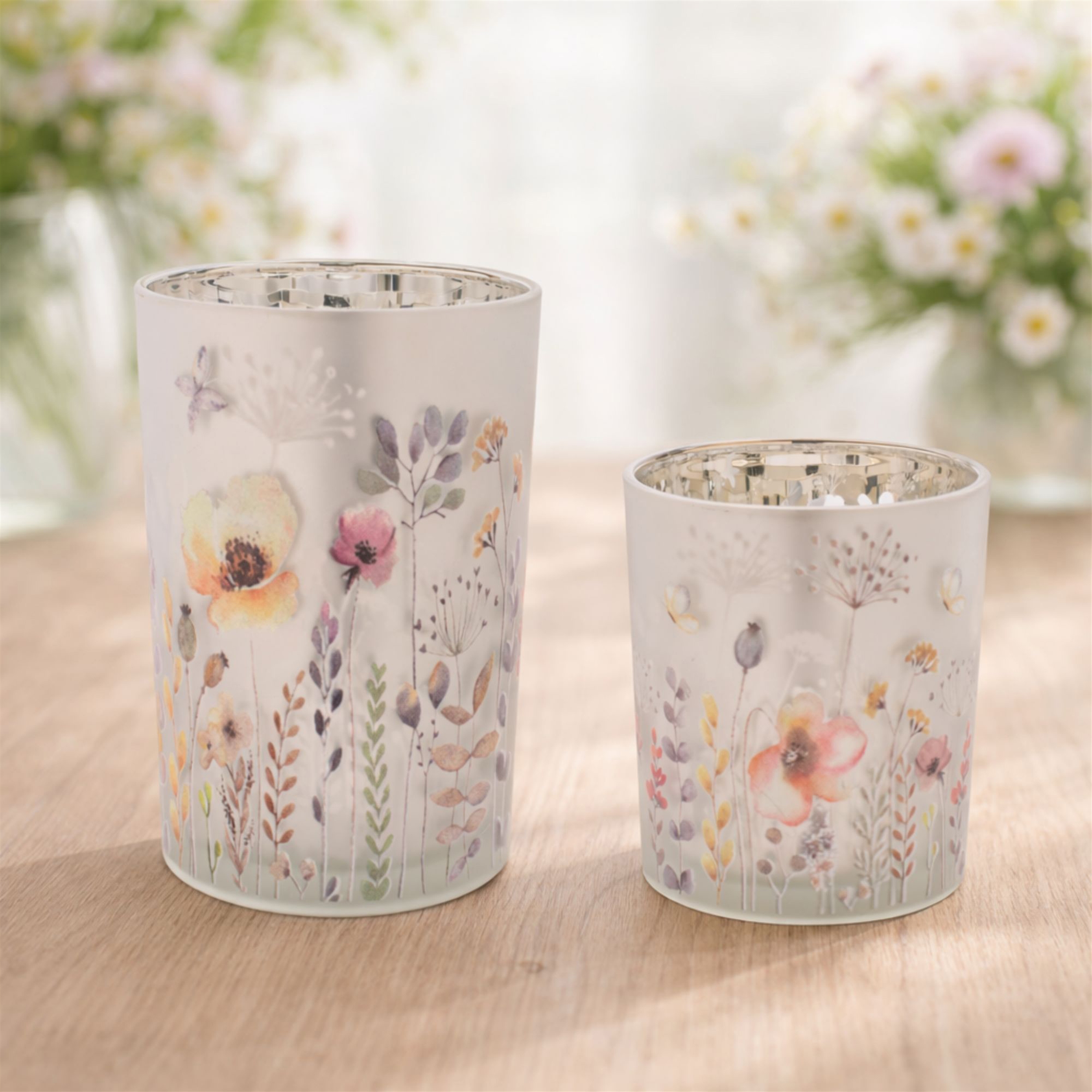 Bring warmth, light, and artistry into your home with this set of floral votive candle holders.These luminous matte silver vases feature a delicate motif of flowers and foliage, rendered in a palette that reflects the full spectrum of nature's colors. Each is designed to showcase candlelight beautifully, with shiny silver interiors that create a captivating interplay of light and detail. Crafted from frosted glass, each holder features a delicate wildflower and butterfly design that s double-printed on the interior for stunning visual depth. The perfect size for votive or tealight candles, these holders are sold in a set of three matching pieces. Whether styled on a bookshelf, dining table, or mantel, these holders offer a nature-inspired touch that blends beautifully with modern, rustic, or farmhouse interiors.