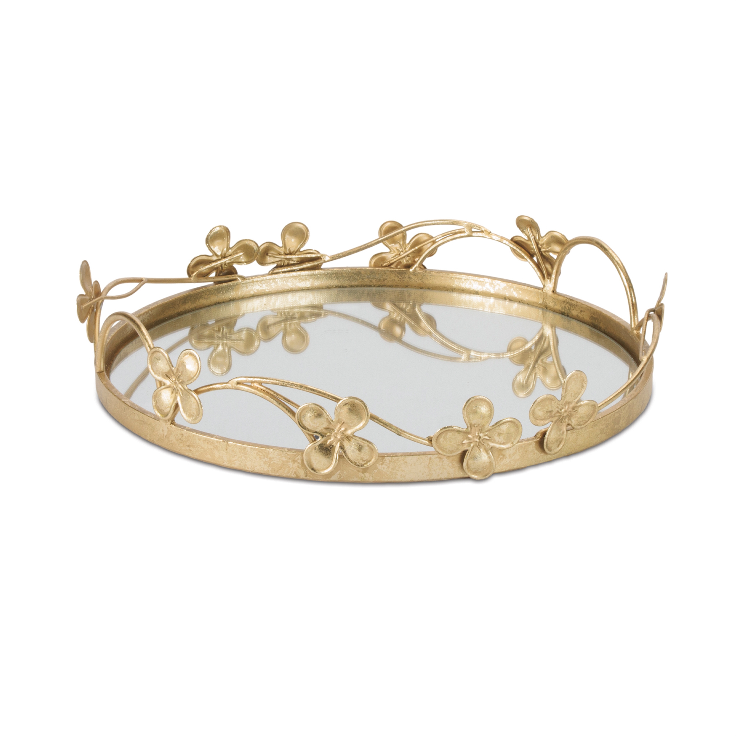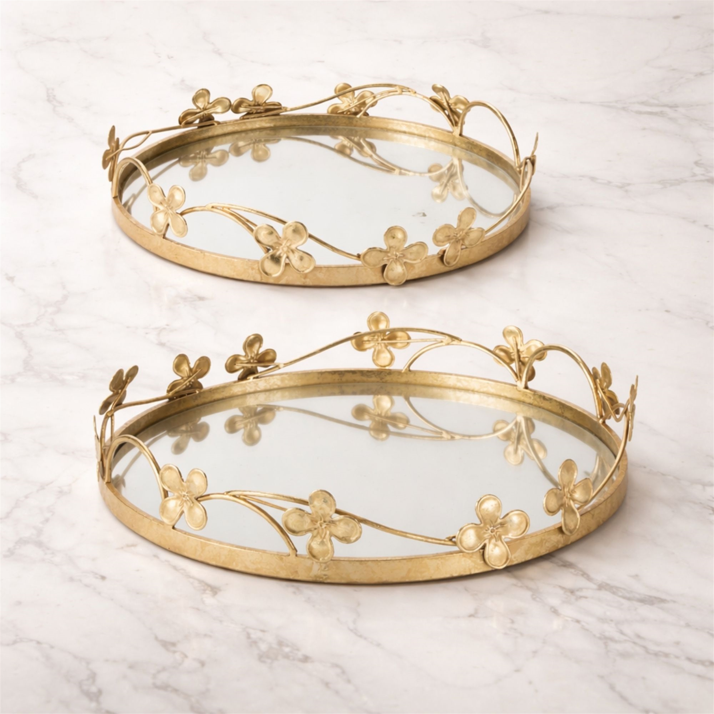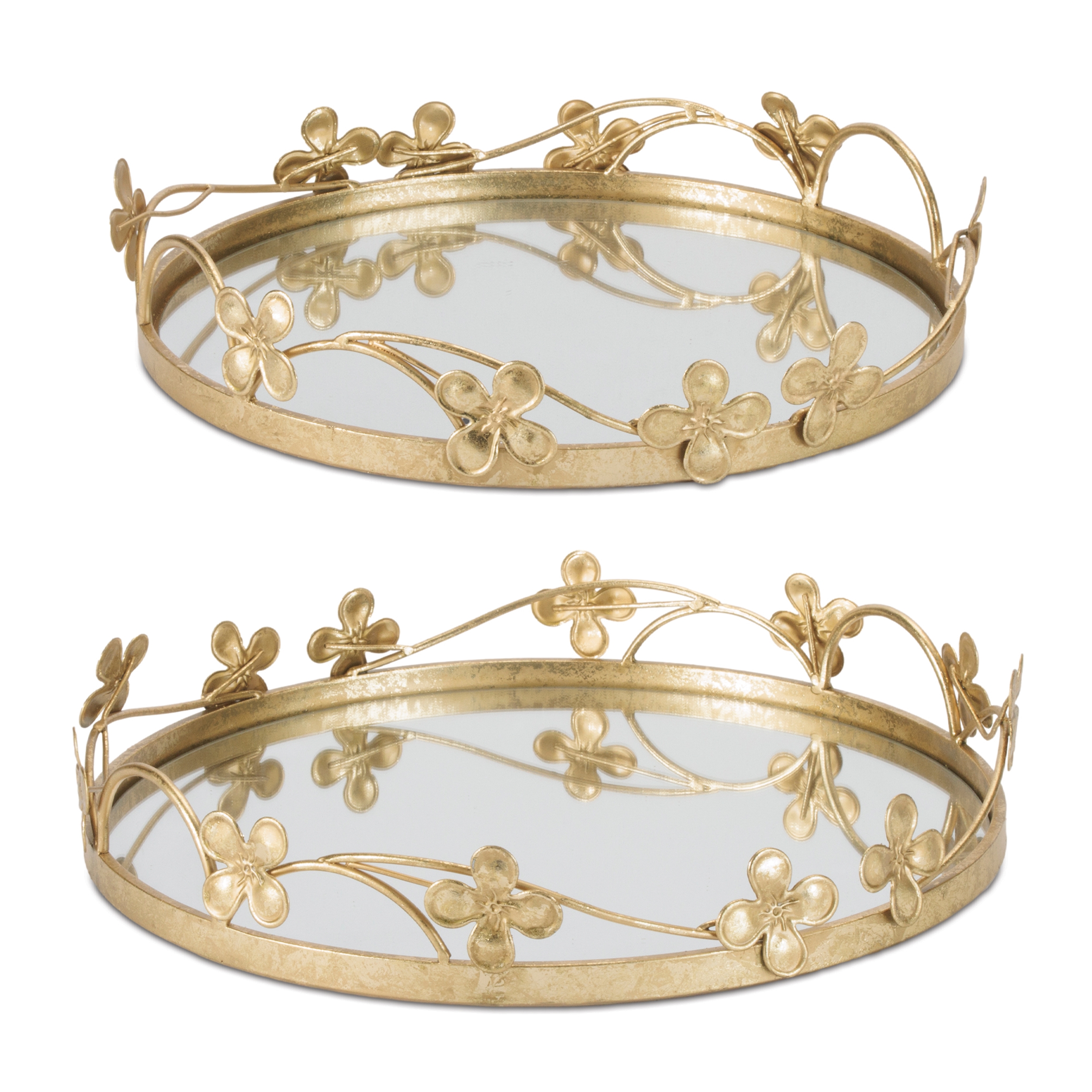 Add a touch of romantic elegance to your home with this Gold Floral Mirror Tray Set. Featuring delicate sculpted flowers and gracefully curved metal detailing, these round mirrored trays bring vintage-inspired charm to any space. The reflective glass base beautifully showcases candles, perfumes, d cor accents, or cocktails, while the warm gold finish adds a soft glam touch. Perfect for styling a coffee table, vanity, dining centerpiece, or ottoman, these decorative trays can be displayed together for a layered look or used separately throughout your home. Whether you're entertaining guests or elevating everyday d cor, this floral mirror tray set delivers timeless sophistication with functional beauty.