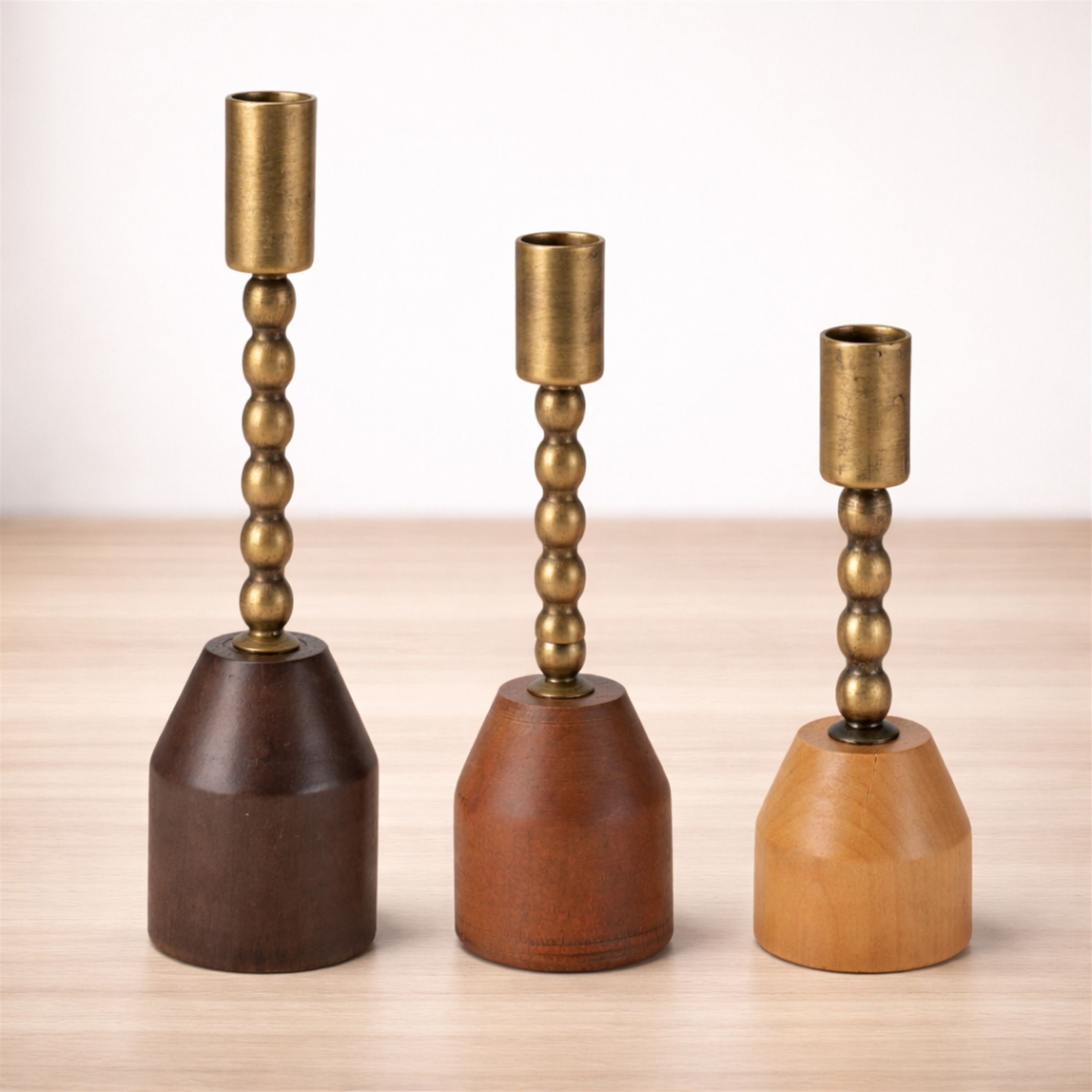 - Set of three coordinating taper candle holders with varied wood tones for a balanced, layered decorative display.