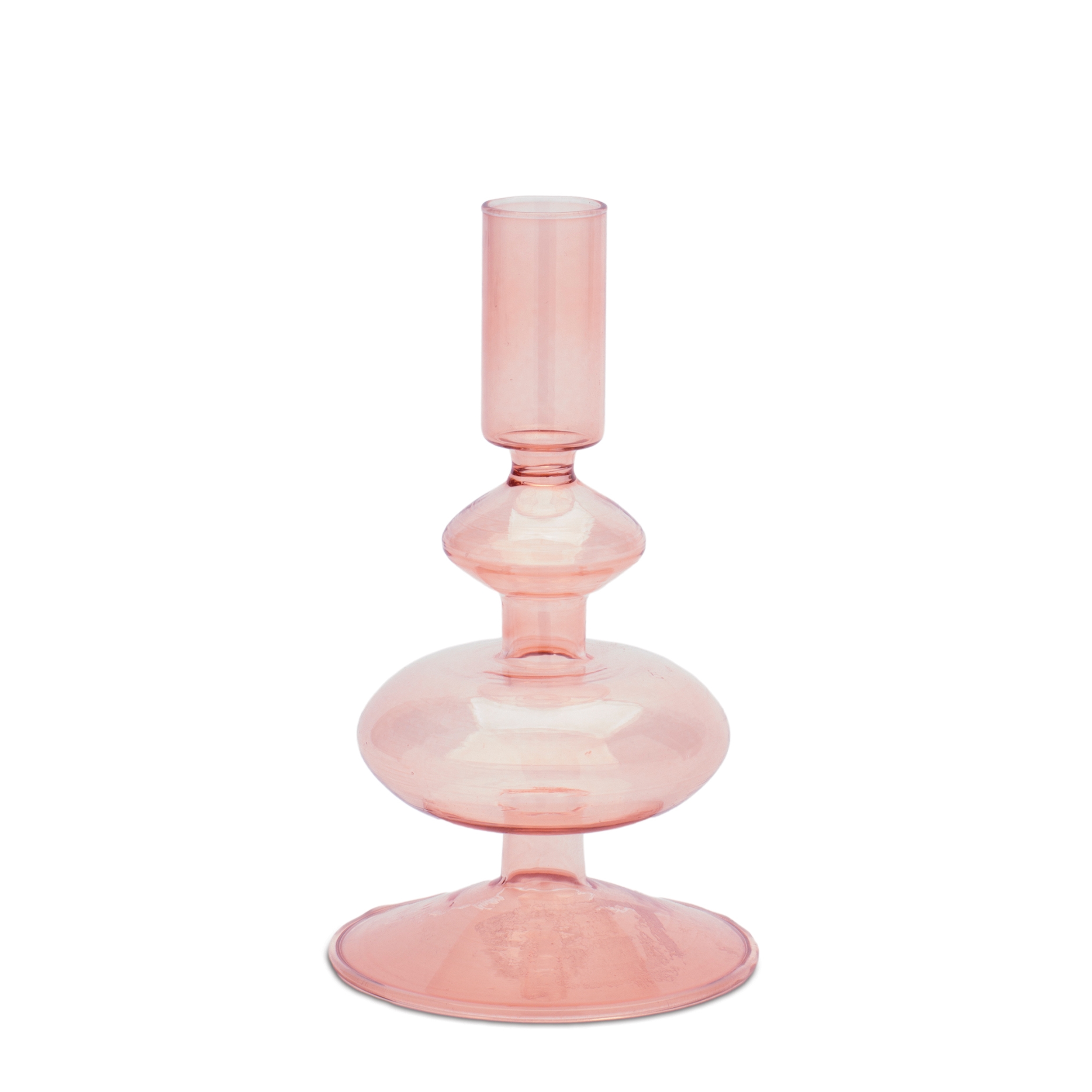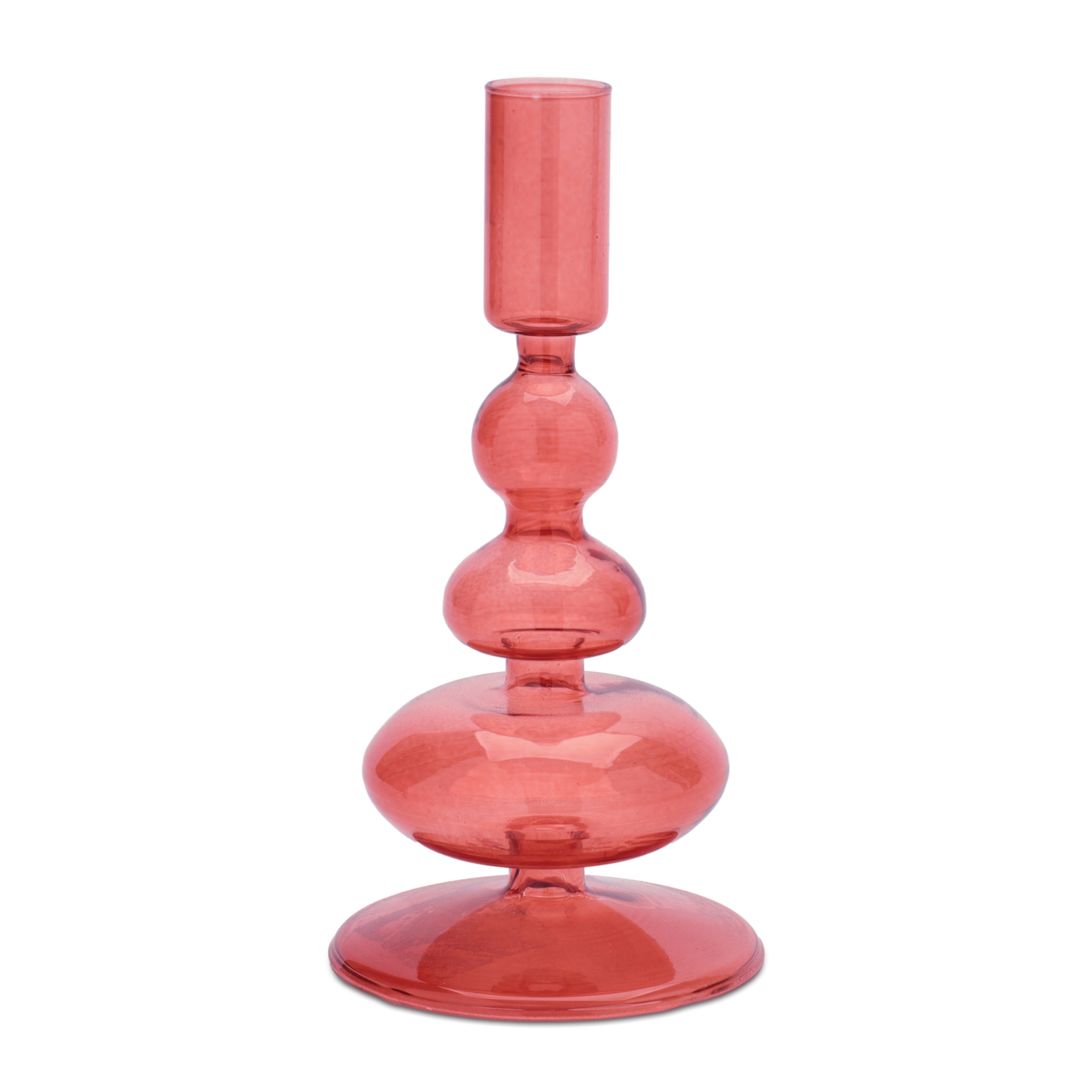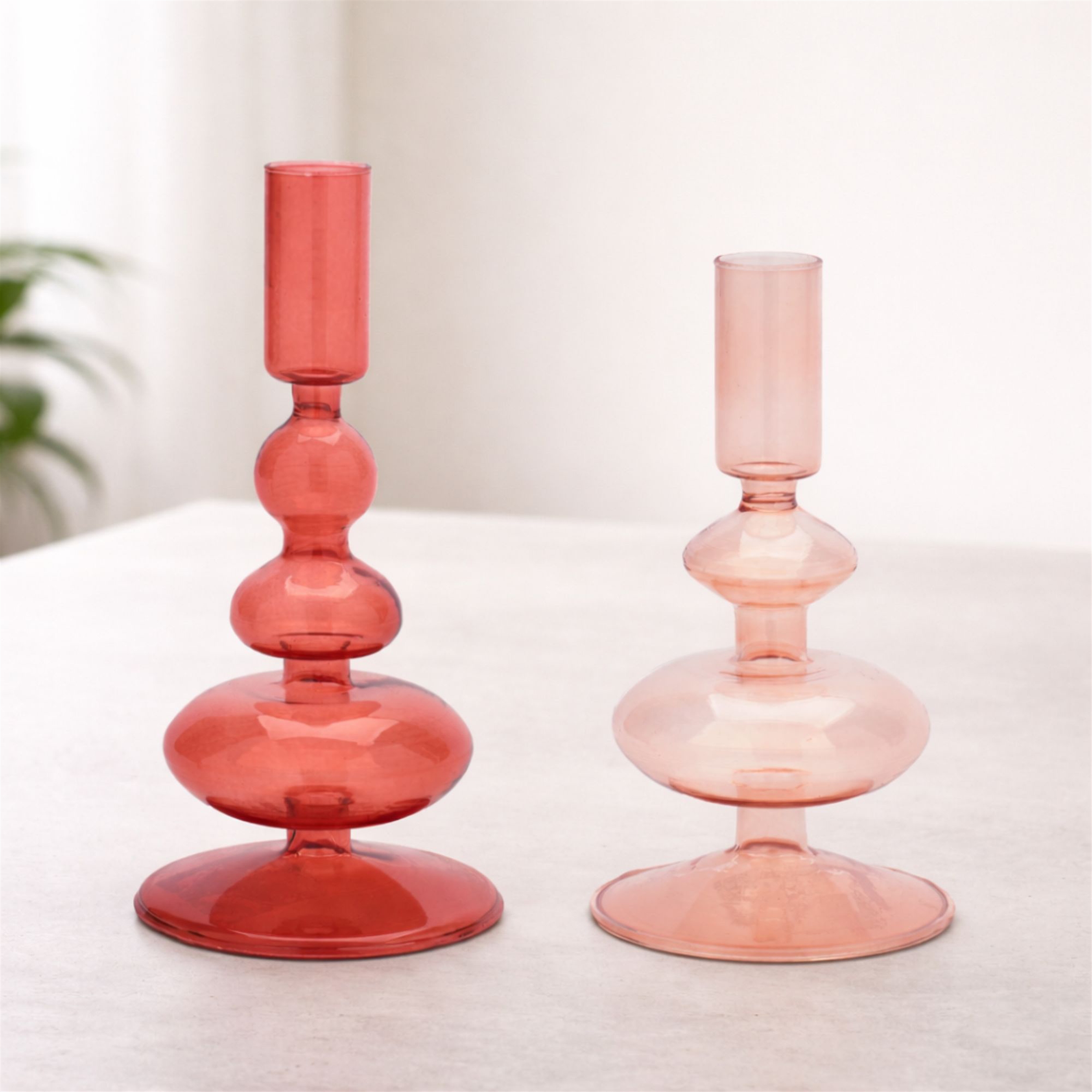 Add a playful yet elegant accent to your space with this set of glass candle holders, crafted in soft hues of red and pink. Delicate and light-catching, these glass candle holders come in spring pastels, each with its own spindle-like silhouette. Made with transparent glass, they refract light with quiet precision, offering a thoughtful interplay of color, form, and atmosphere. Designed to hold trending taper candles, these pieces offer a eclectic touch that blends beautifully with modern, French country, or Boho-chic interiors. Style them together on a mantel, dining table, or shelf for a charming layered display.