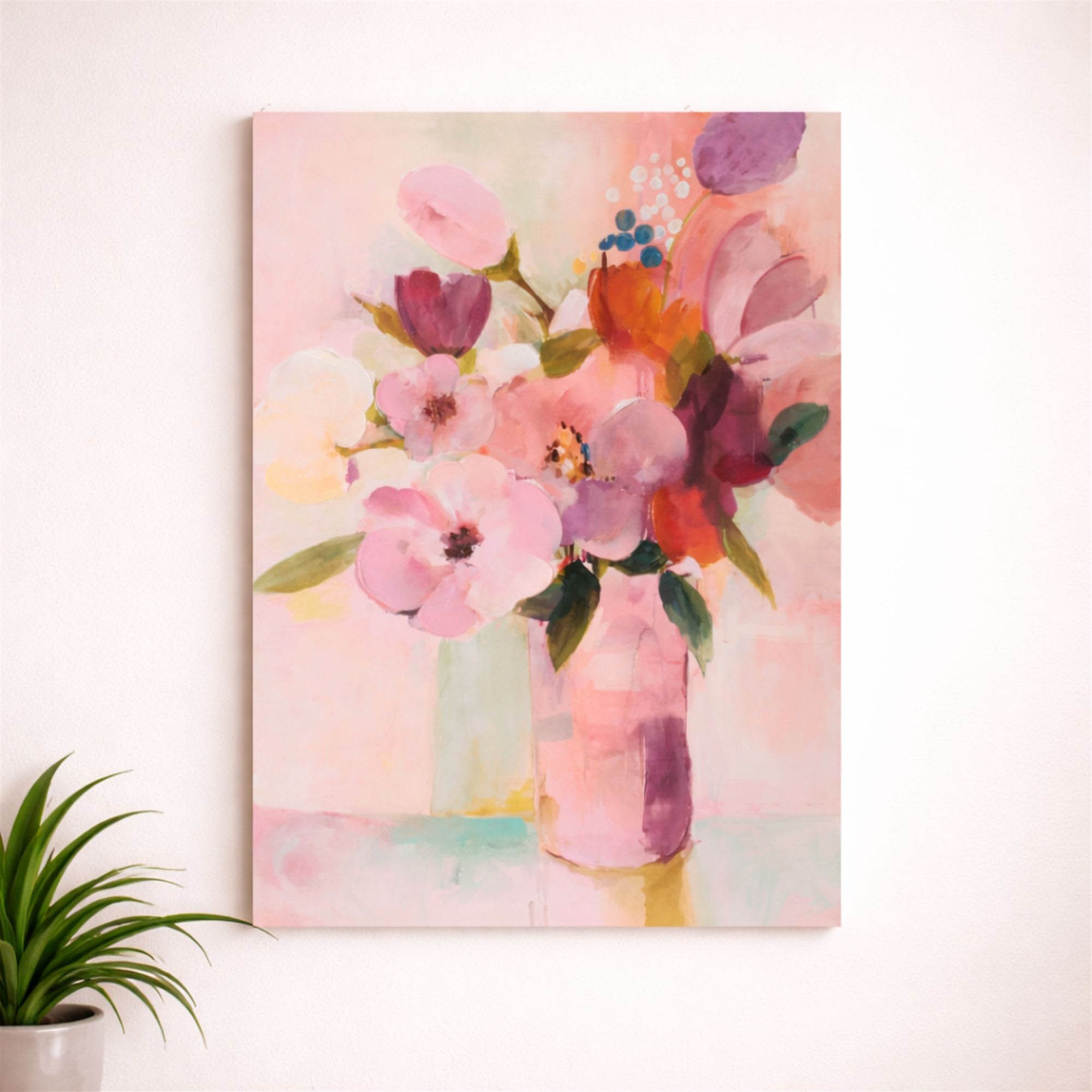 Brighten your space with the Canvas Floral Vase Print, a joyful burst of color and modern botanical beauty. Featuring an abstract bouquet of pinks, corals, purples, and soft greenery arranged in a charming vase, this 31.5" tall canvas wall art adds an instant pop of warmth and artistic flair. The airy watercolor-inspired style feels fresh, feminine, and effortlessly chic perfect for bedrooms, living rooms, entryways, or gallery walls. Whether you re styling a cozy cottage look or adding a playful touch to modern d cor, this floral canvas print brings year-round bloom to your home.