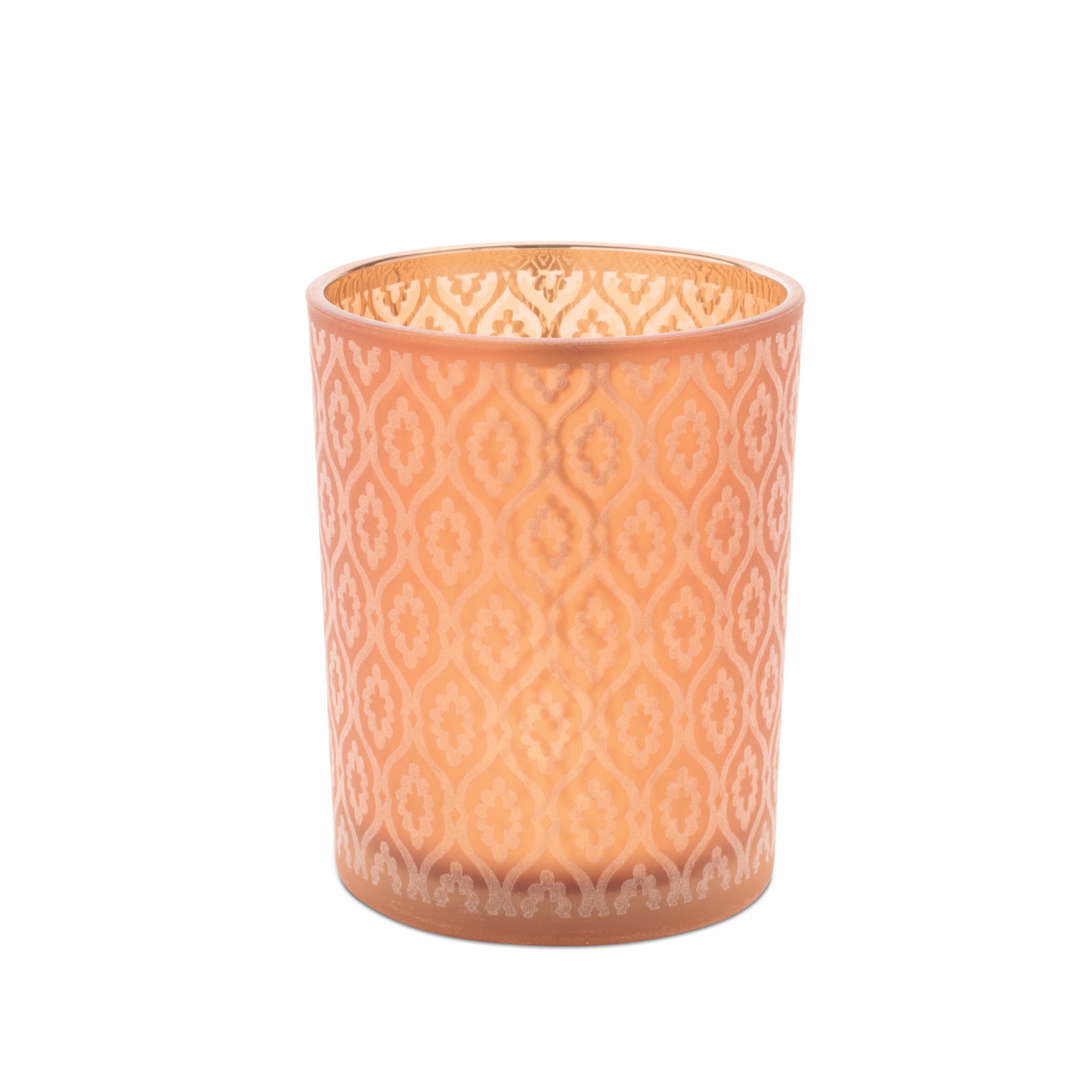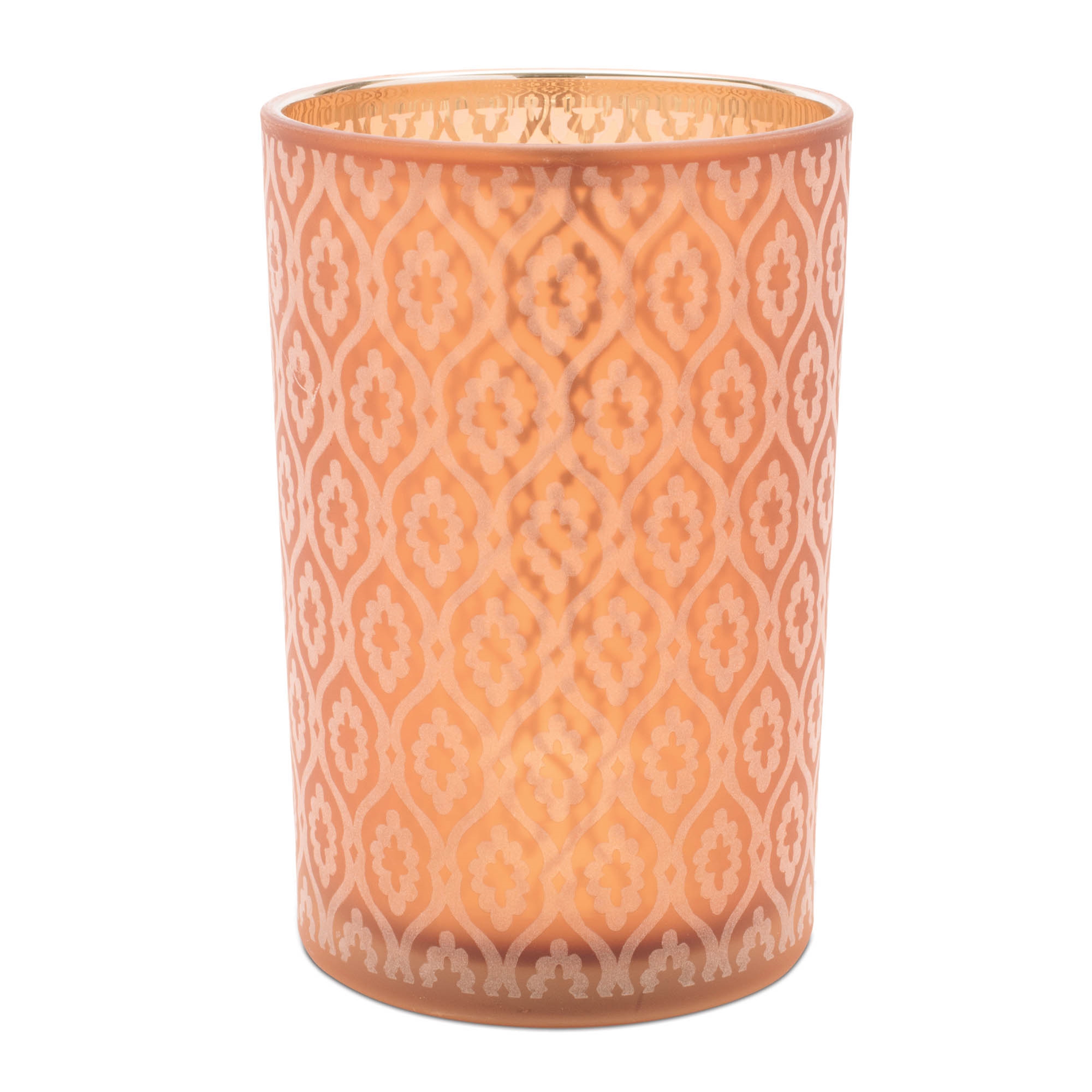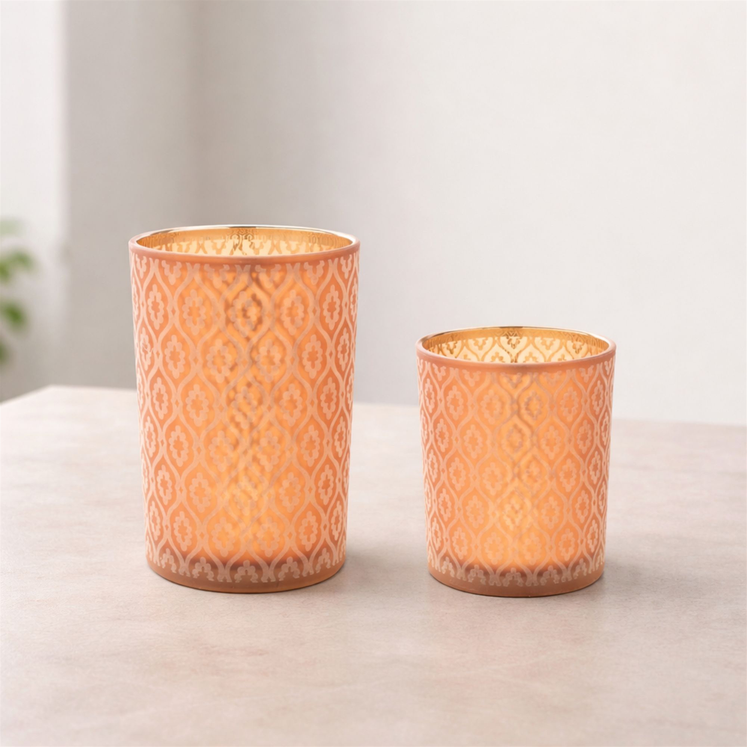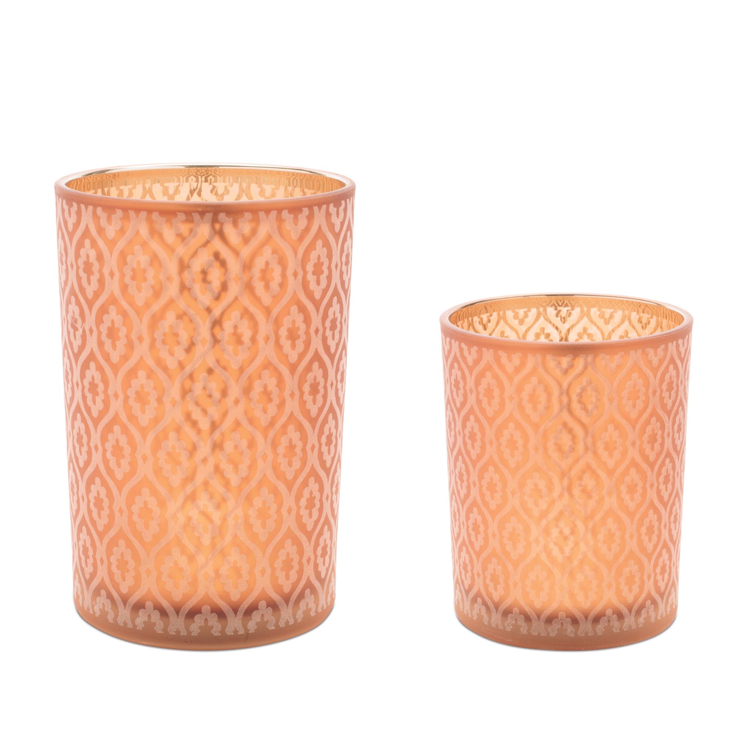 Bring warmth, sophistication, and artistry into your home with this set of patterned candle holders. Timeless geometry meets luminous color in these striking candle holders. Their etched-glass look catches the light in shimmering bronze, while metallic gold interiors amplify the glow. By candlelight, they cast a warm, faceted radiance an elegant play of shadow and shine. Crafted from frosted glass, each holder features a delicate design that s double-printed on the interior for stunning visual depth. Whether styled on a bookshelf, dining table, or mantel, these holders offer an elegant touch that blends beautifully with modern, contemporary, or eclectic interiors.