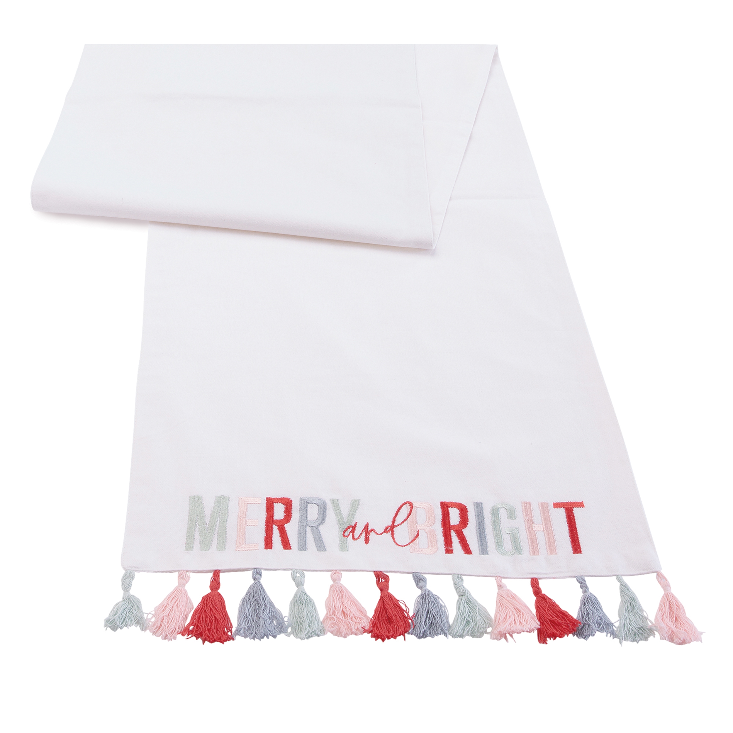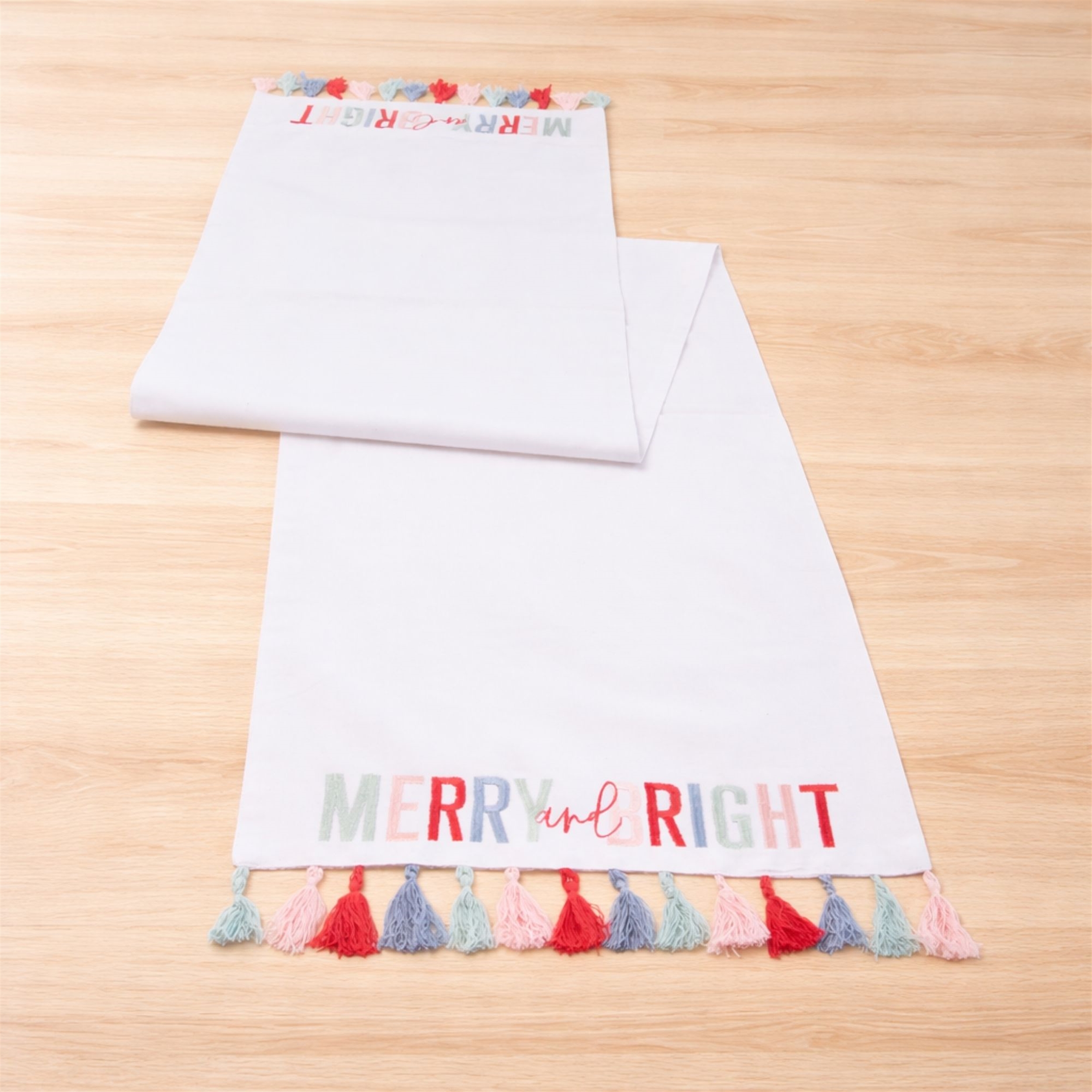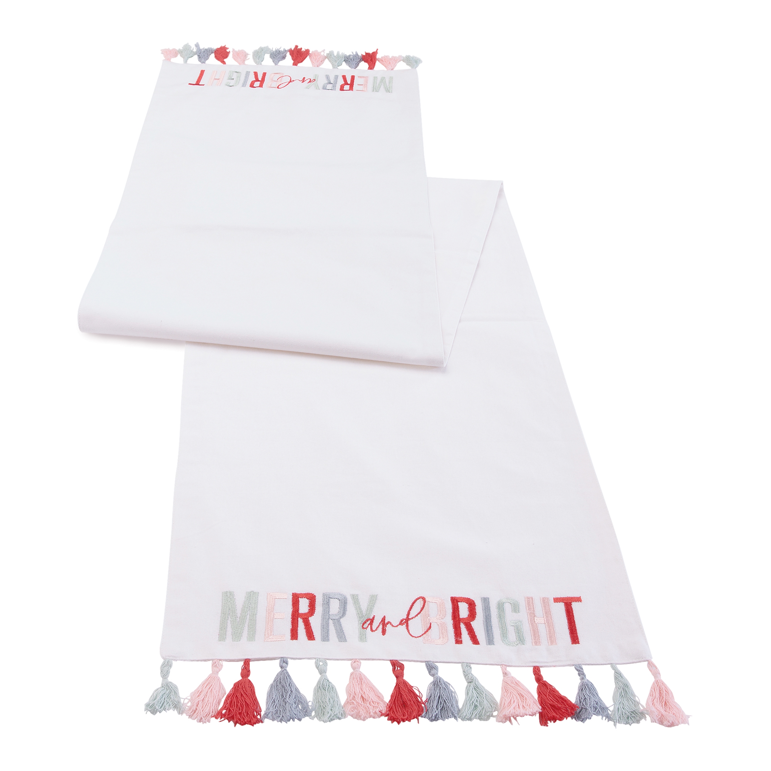 Add cheerful charm to your holiday table with this Merry and Bright tassel table runner, designed to bring playful color and festive spirit to your seasonal d cor. Crafted from soft cotton in a crisp white finish, this runner features embroidered Merry and Bright lettering in soft pastel holiday hues, complemented by coordinating tassel trim along each end. Perfect for Christmas brunches, holiday dinners, cookie exchanges, and winter gatherings, it adds a fresh, modern twist to traditional d cor. Style it on your dining table, kitchen island, buffet, or console table to instantly brighten your space and create a warm, welcoming setting for friends and family.