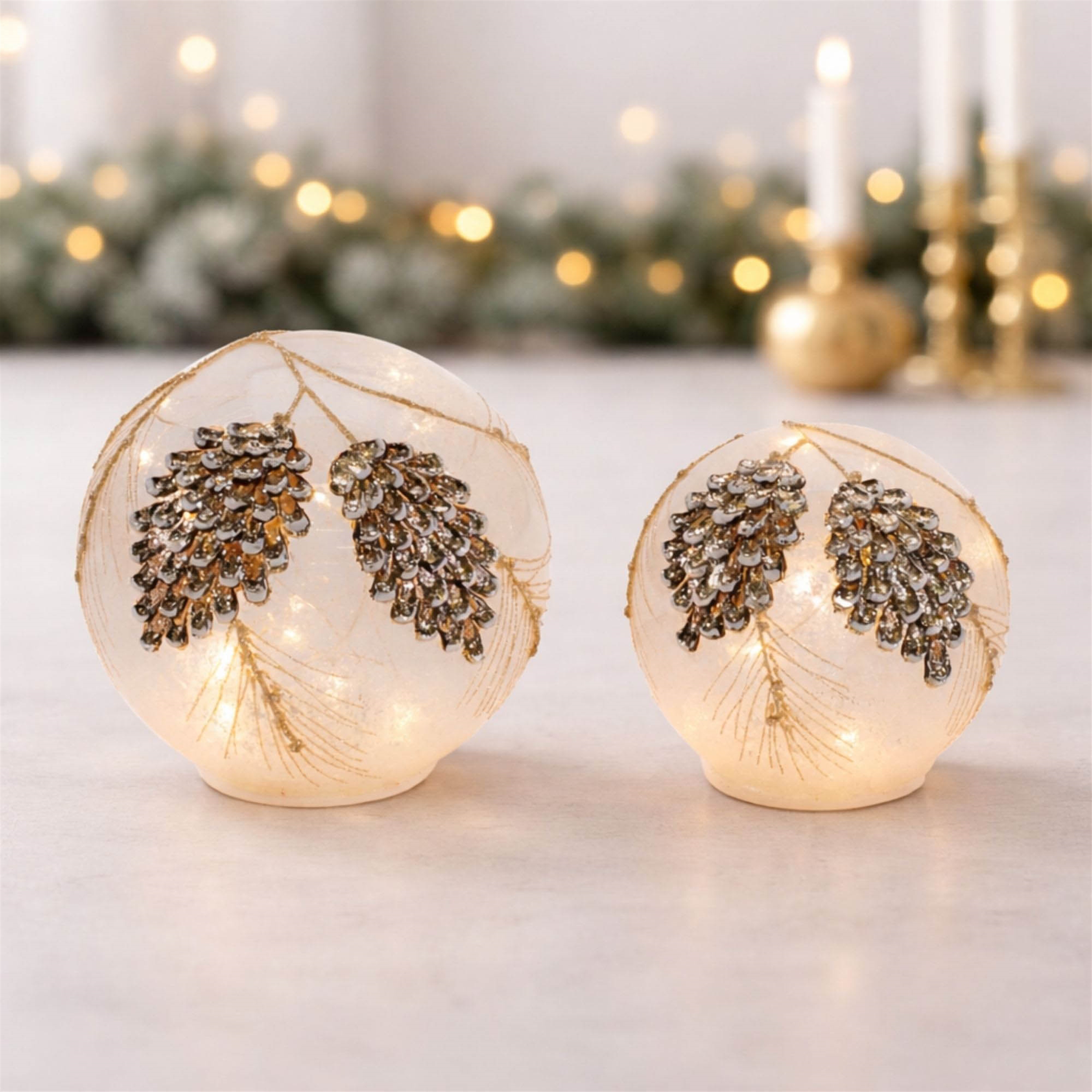 Add a sparkling winter glow to your home with the LED Frosted Pine Cone Globe Set. These beautiful illuminated glass globes feature a frosted, ice-kissed finish that feels straight out of a snowy forest. Shimmering gold glitter pine accents and hand-painted pine cone details bring rich texture and seasonal charm, making them perfect for Christmas d cor, winter centerpieces, or cozy mantel styling. Designed to glow warmly throughout the season, these decorative LED globes create an inviting ambiance that shines well beyond the holidays.