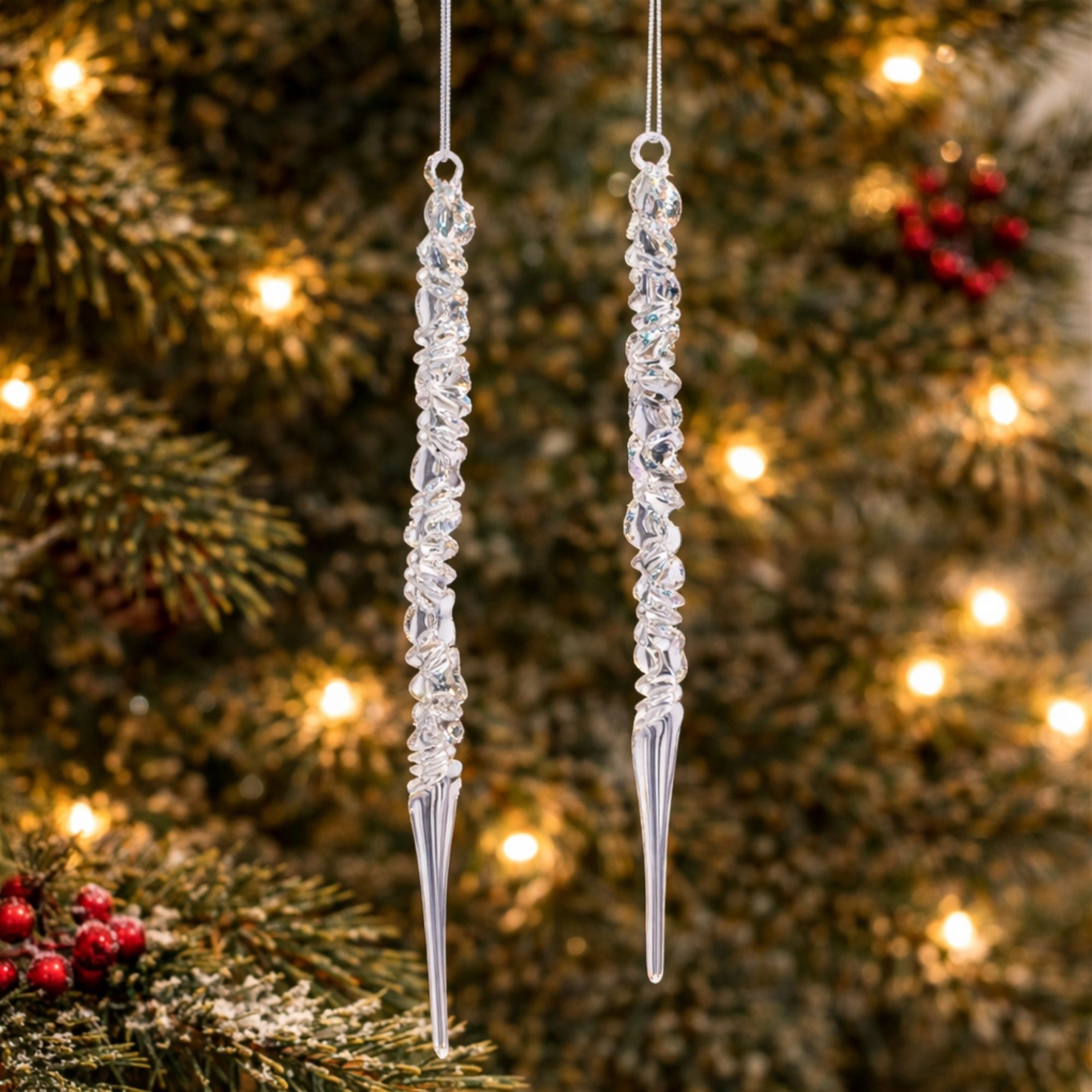 - Sleek, elongated icicle shape adds winter elegance and shimmer