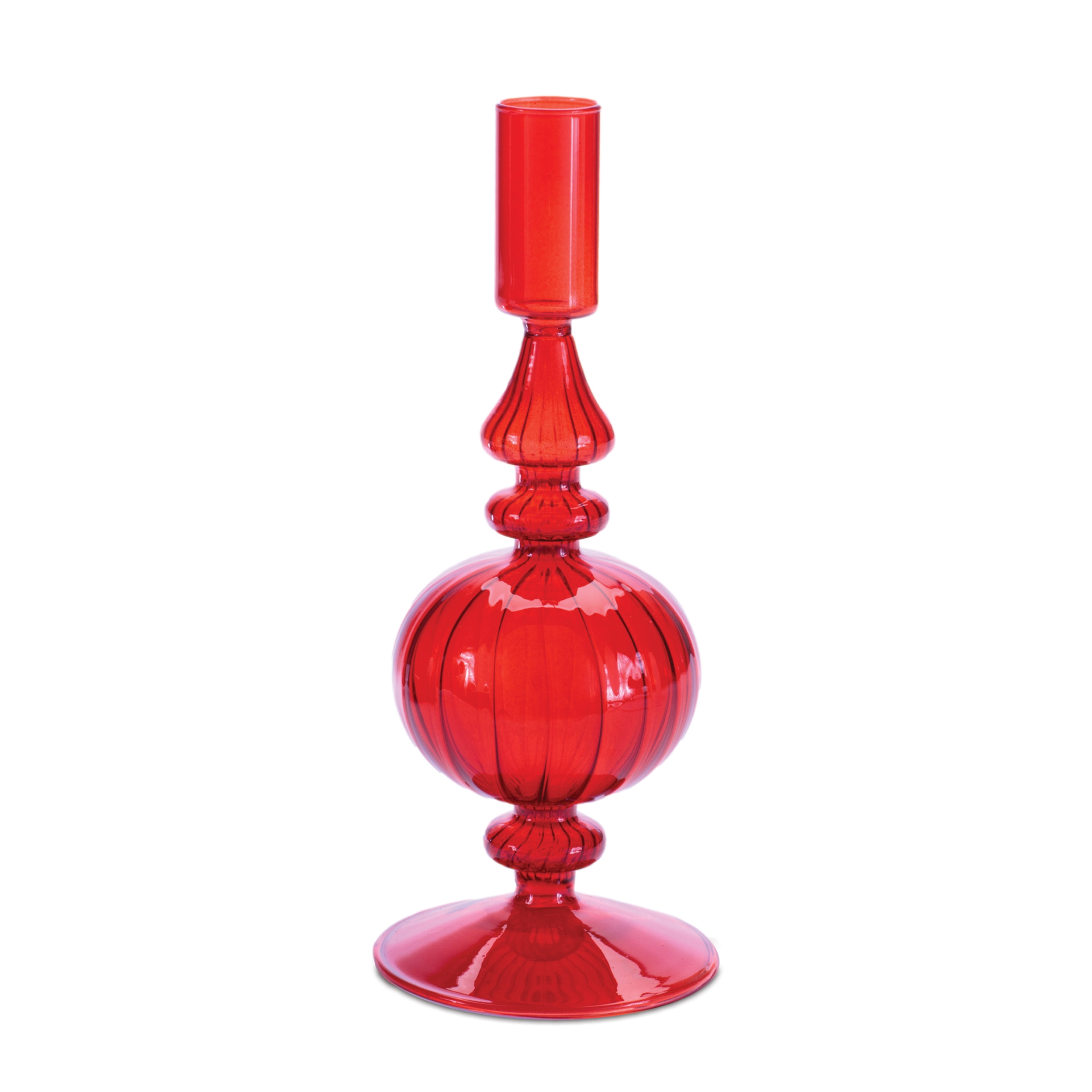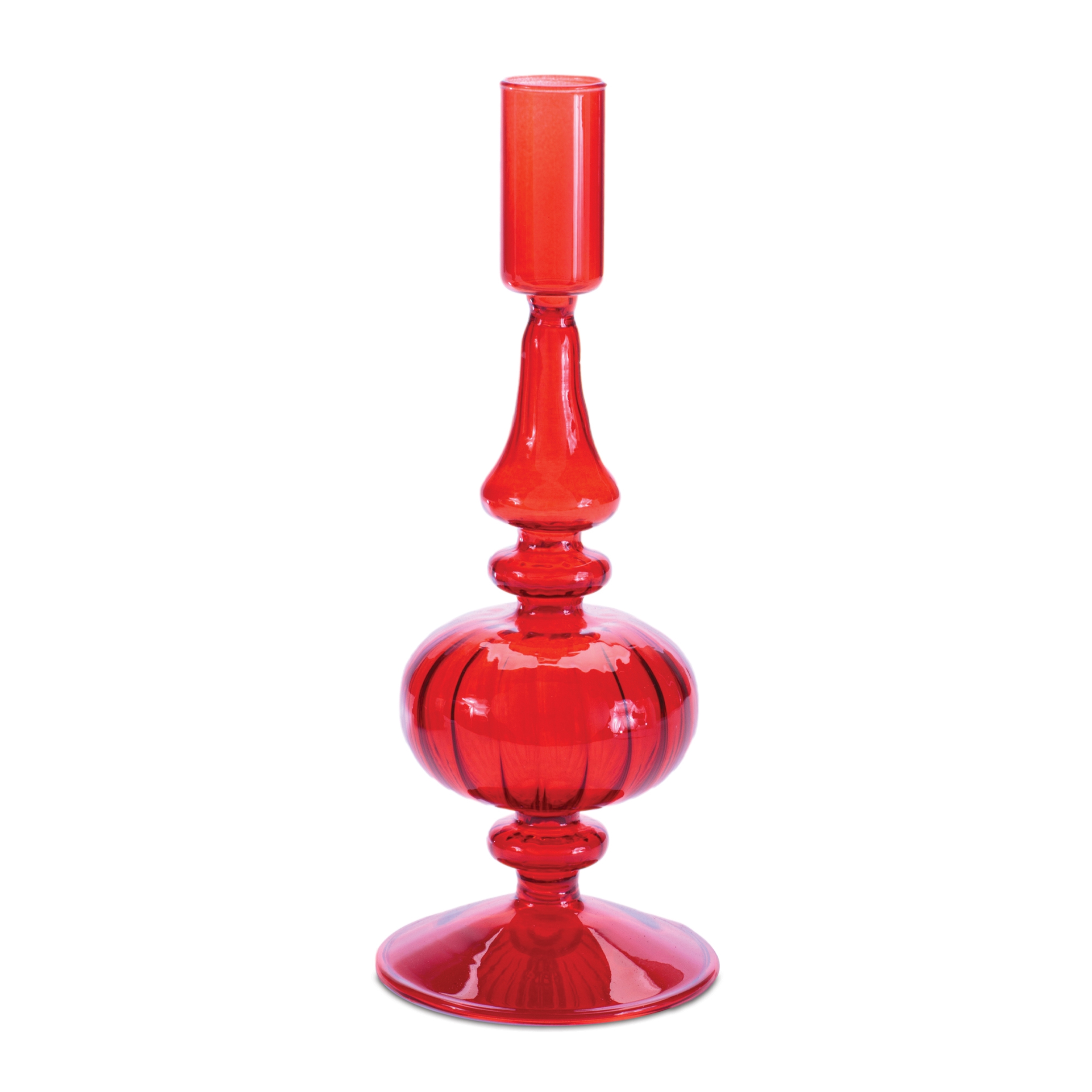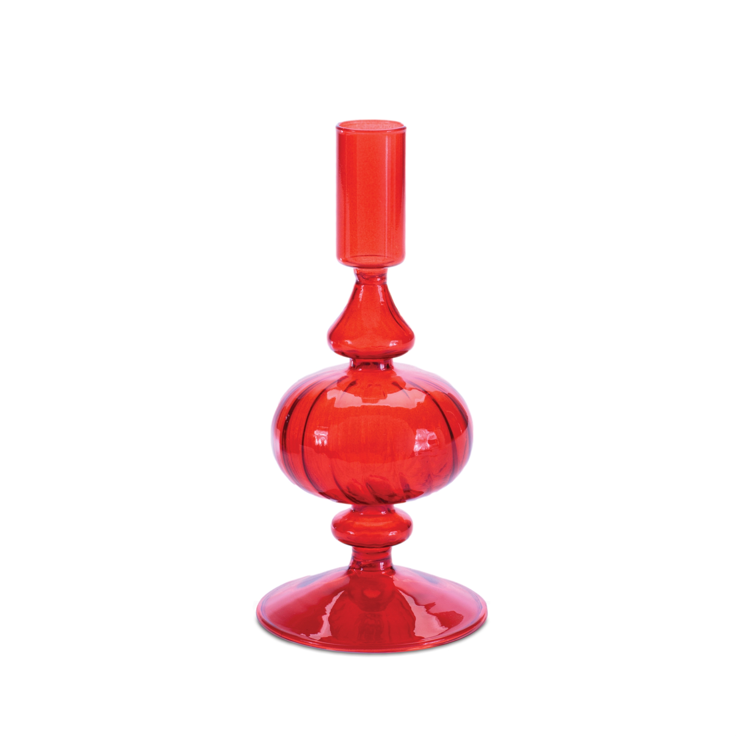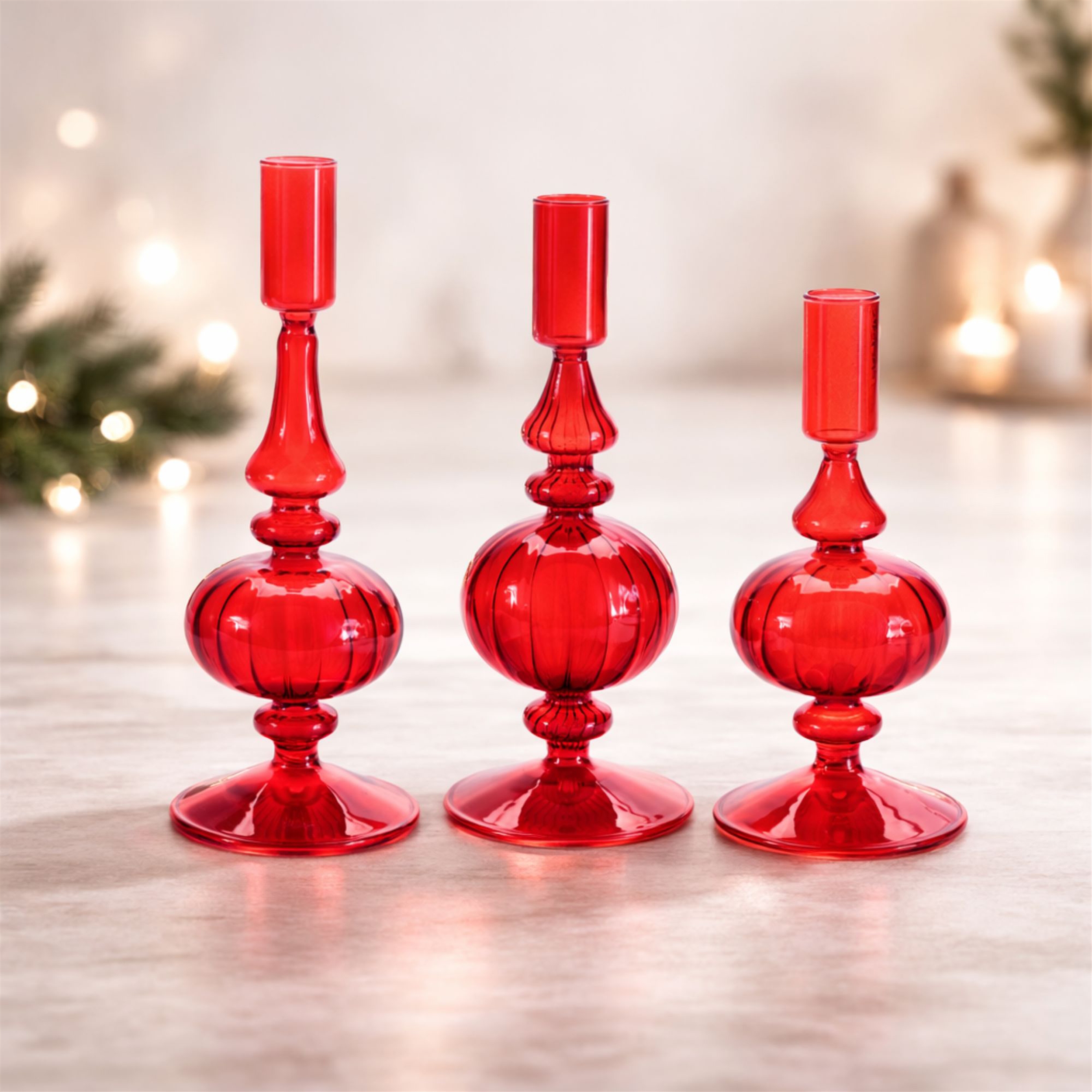 Add a playful yet elegant accent to your space with this set of glass candle holders. Delicate and light-catching, these glass candle holders come in a bright red tone, each with its own spindle-like silhouette. Made with transparent glass, they refract light with quiet precision, offering a thoughtful interplay of color, form, and atmosphere. Designed to hold trending taper candles, these pieces offer a eclectic touch that blends beautifully with modern, contemporary, or Boho-chic interiors. Style them together on a mantel, dining table, or shelf for a charming layered display.