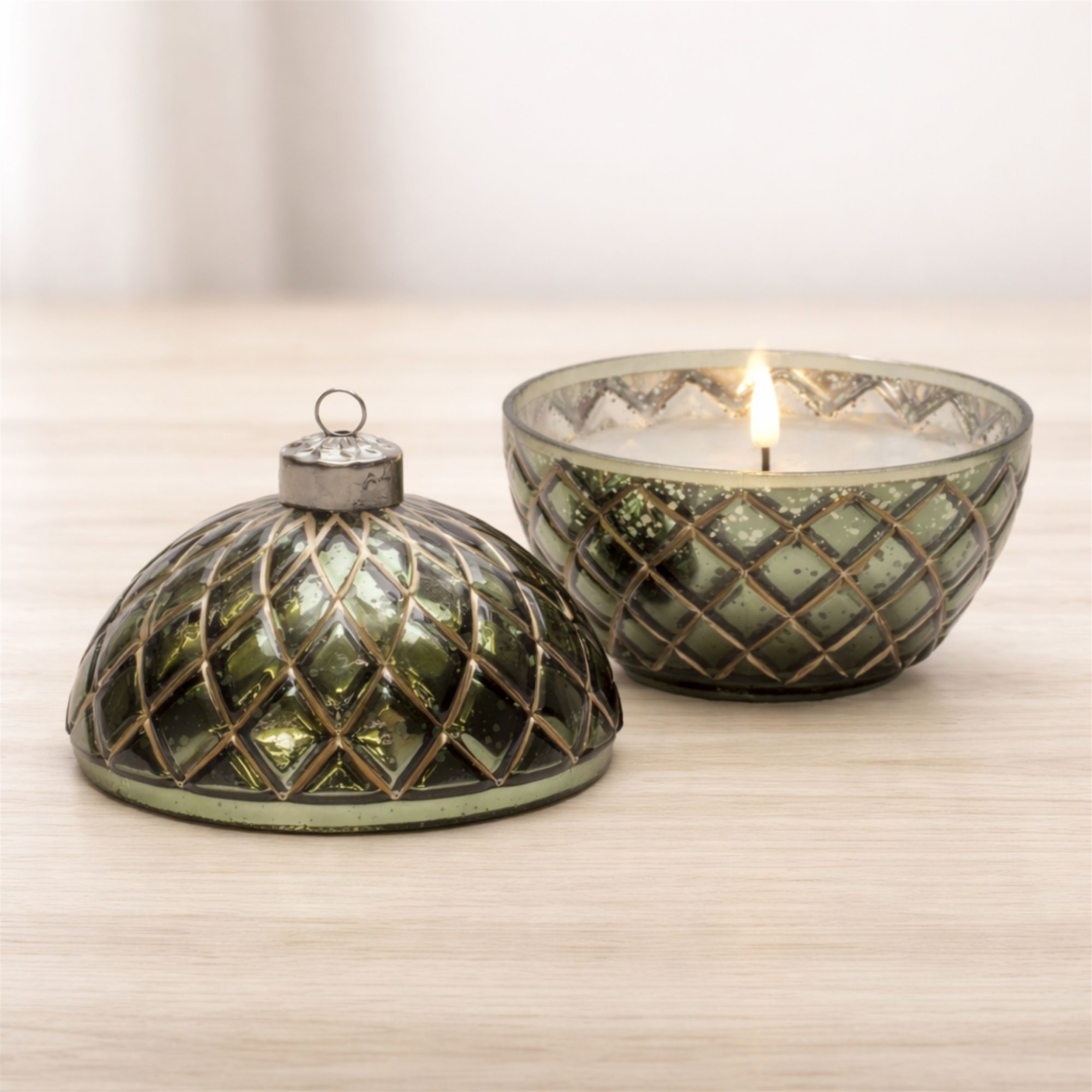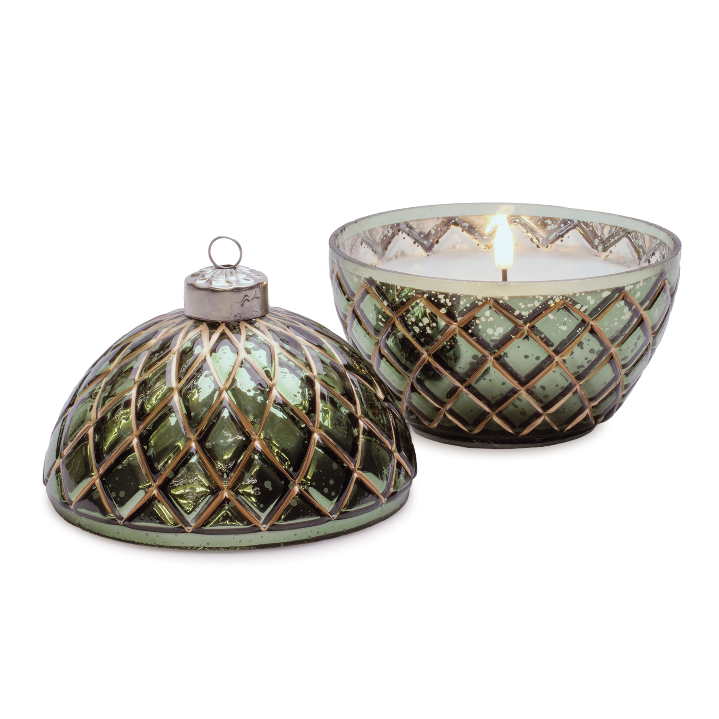 - Crafted from ribbed green glass with a metallic-look topper for an authentic ornament-inspired design
