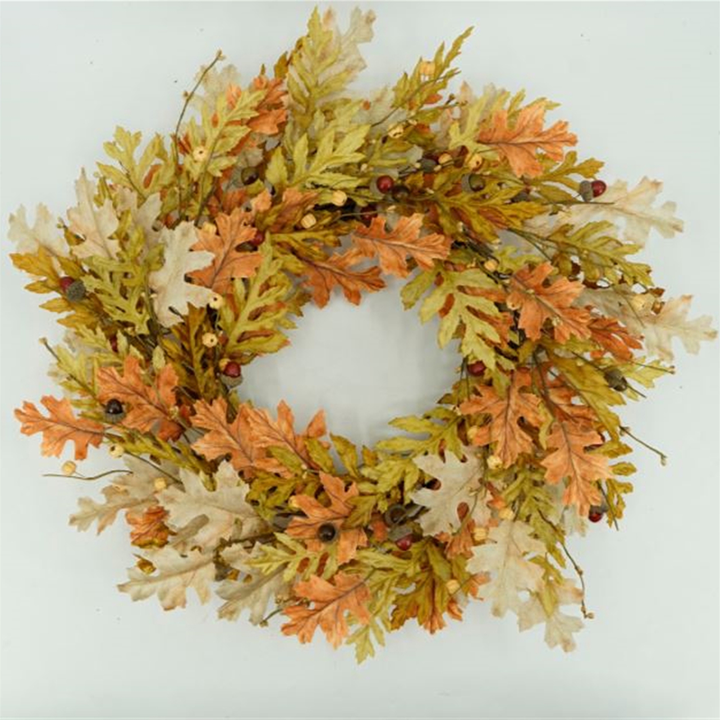 Celebrate the beauty of the harvest season with this charming Oak Leaf Harvest Wreath, designed to bring warm autumn color and natural texture to your home d cor. Featuring a lush mix of golden yellow, burnt orange, and soft cream oak leaves, this fall wreath is accented with realistic acorns and berries for a true-to-nature look. The layered foliage and twig base create rich depth and dimension, making it a stunning focal point for your front door, entryway, mantel, or above a fireplace. Perfect for Thanksgiving gatherings, seasonal parties, or simply welcoming guests all autumn long, this decorative wreath effortlessly enhances farmhouse, rustic, and traditional fall d cor themes.