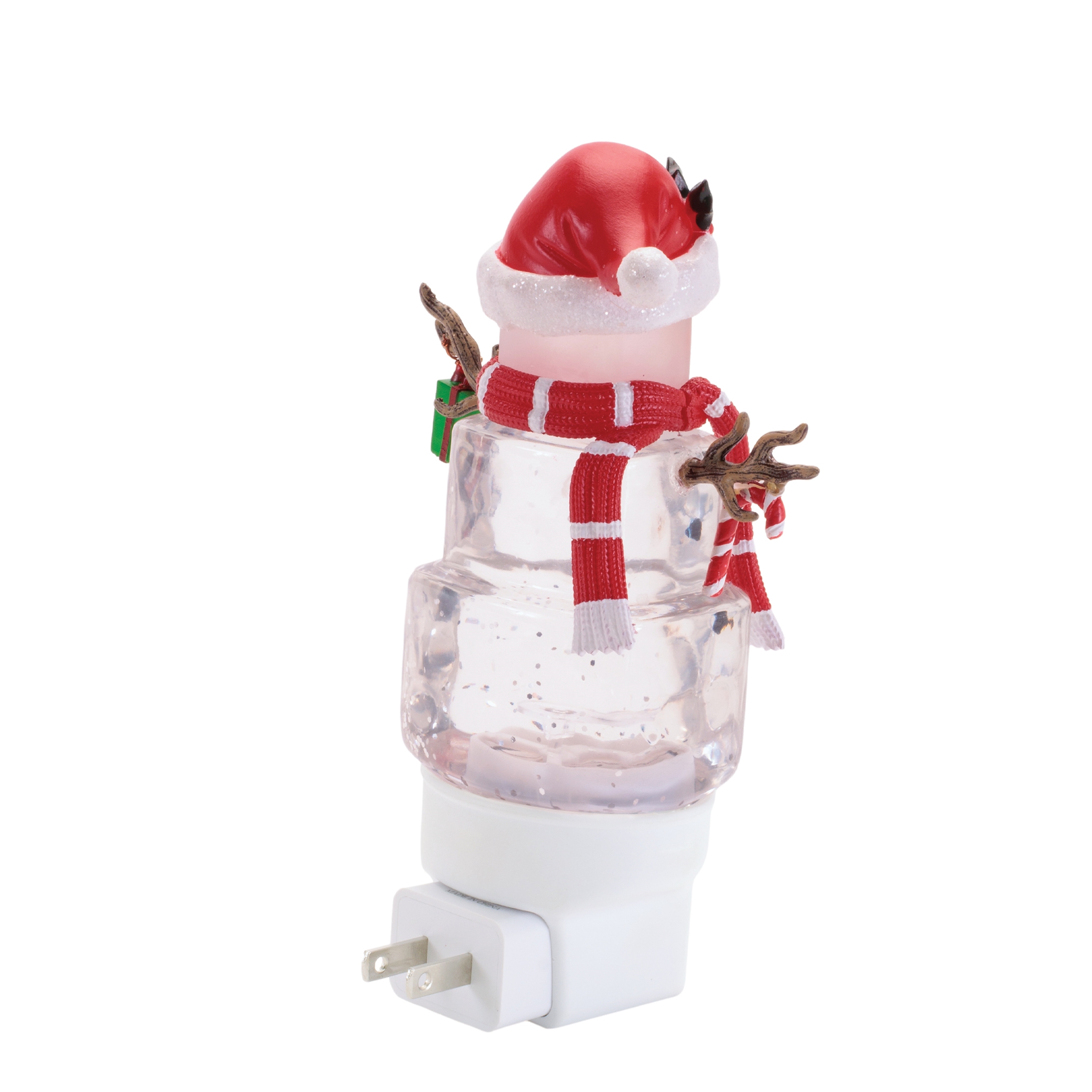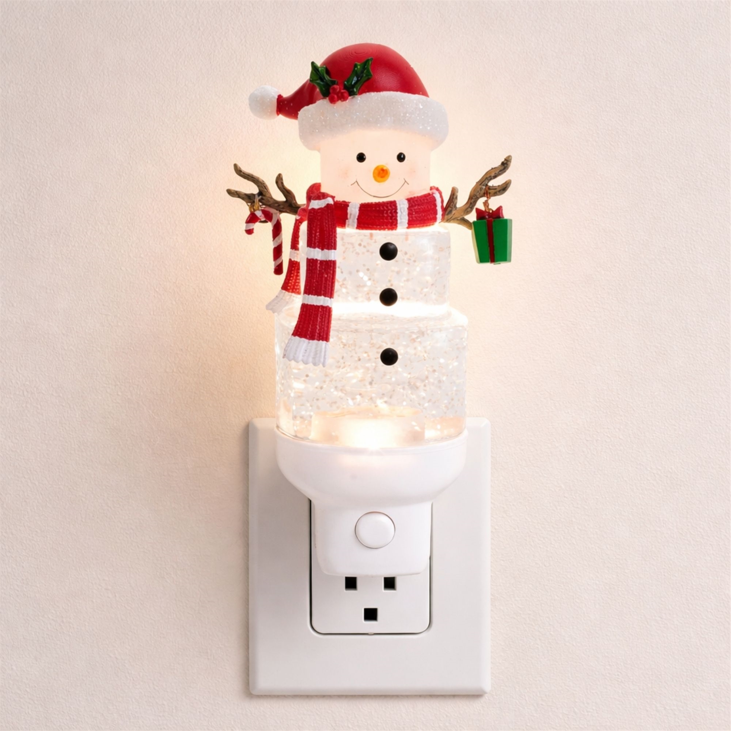 Add a sprinkle of holiday magic to your home with the Snowman with Present Snow Globe Night Light. Standing 7 inches tall, this whimsical snowman decoration features bright red and green accents, a festive Santa hat, a cheerful candy cane, and a special Christmas gift in hand. With its sparkling snow globe effect and warm LED glow, this charming night light creates a cozy winter ambiance perfect for bedroom, living room, or counterspace outlets. A delightful accent for Christmas d cor lovers of all ages, it s sure to bring smiles and soft holiday light all season long.