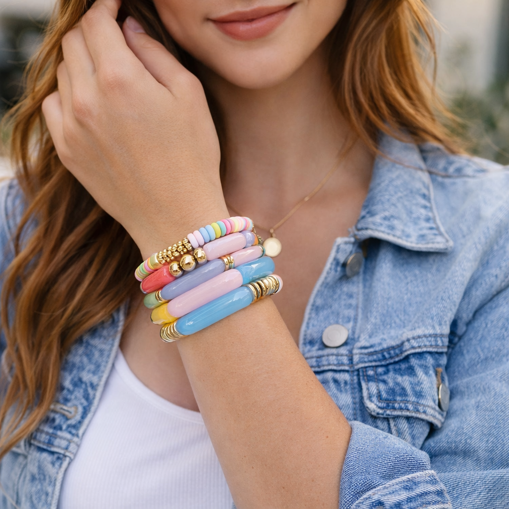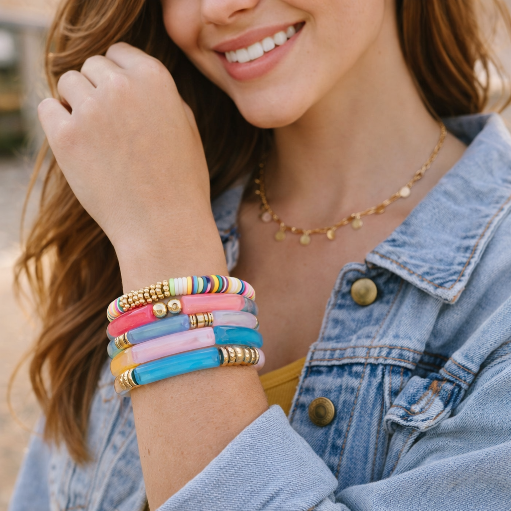 Add a burst of color to your outfit with this vibrant set of 7 multicolor beaded stretch bracelets. Designed in a playful boho style with bright pastel tones and fun gold-tone accents, these bracelets are perfect for everyday wear, festival outfits, or just mixing and matching with your favorite accessories.
