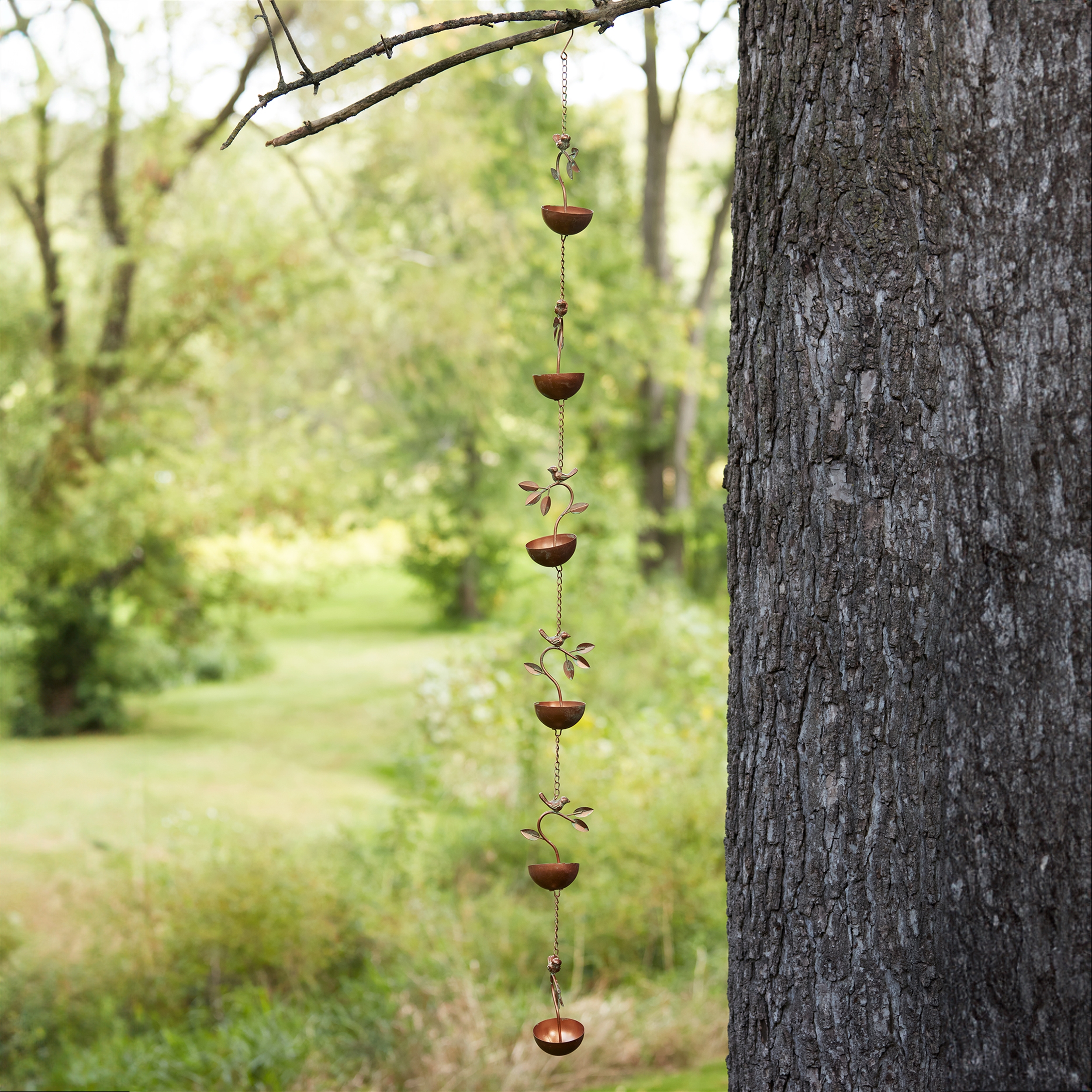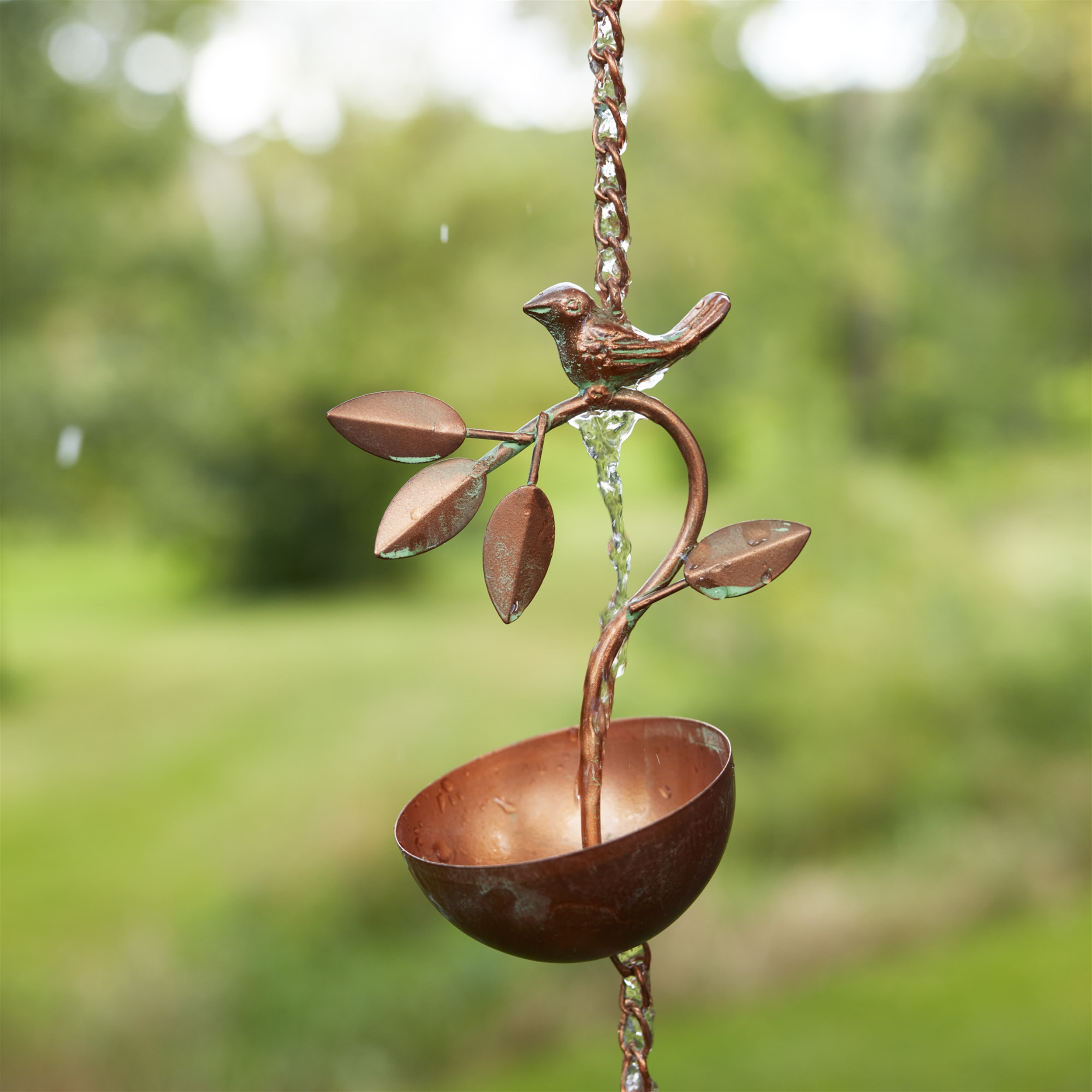 Transform your garden or home into a serene retreat with the Bird Branch Rain Chain. Crafted from durable iron metal and finished in a stunning bronze hue, this decorative rain chain offers both beauty and function. The elegant bird and branch design captures the essence of nature while efficiently guiding rainwater into descending cups, creating a soothing sound as it flows. Perfect for both indoor and outdoor use, this rain chain adds charm and tranquility to any space, while inviting birds and butterflies to your garden. Add a touch of nature to your home today!