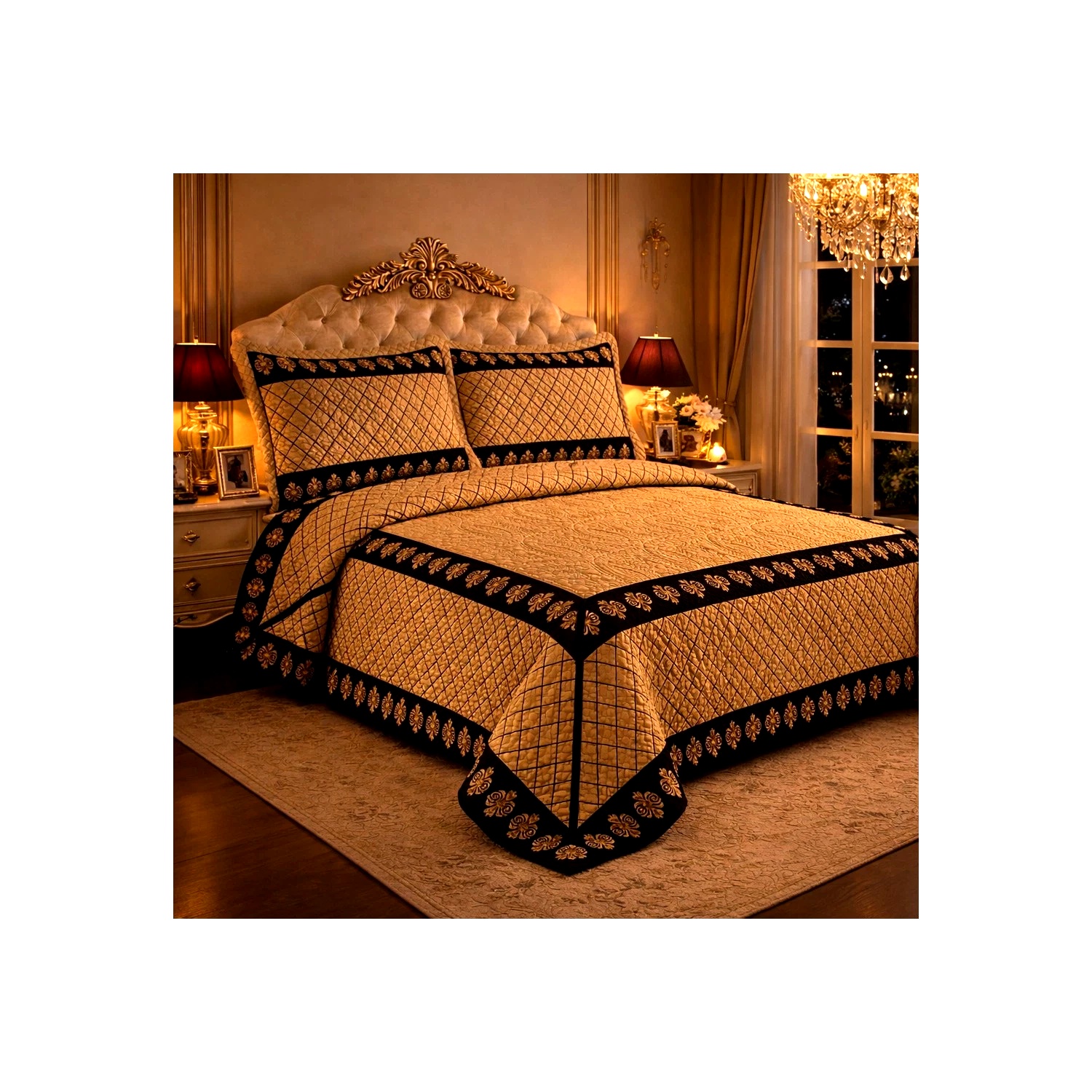 Generic Luxury Gold Black Damask Bedspread Quilt Set Embroidered Royal Bedding King Queen