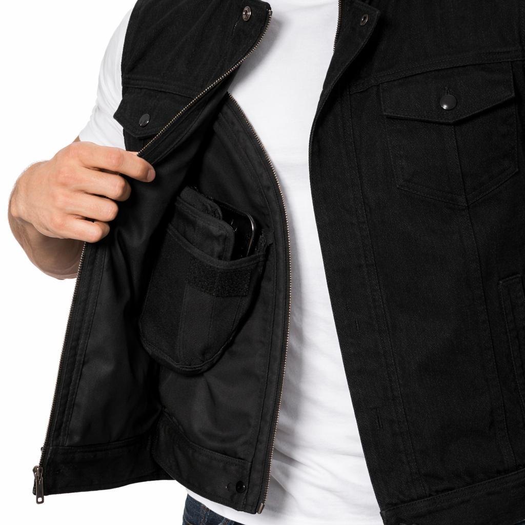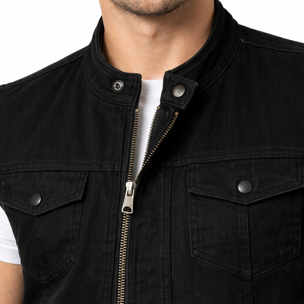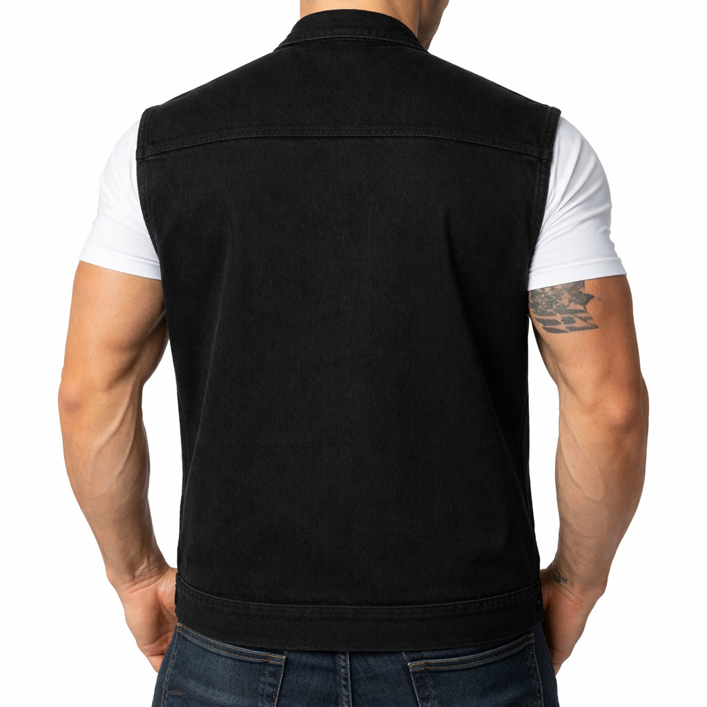 Classic SOA Style Denim Club Vest designed for motorcycle riders and biker enthusiasts. This rugged black denim vest features a sleek mandarin collar, hidden zipper with snap closure, and a single back panel perfect for adding your club patches. Durable cotton construction and a comfortable mesh lining make it ideal for everyday riding.
