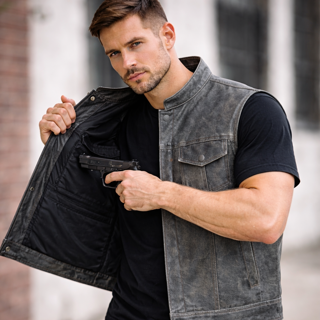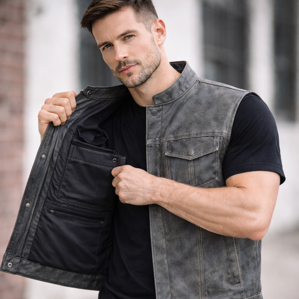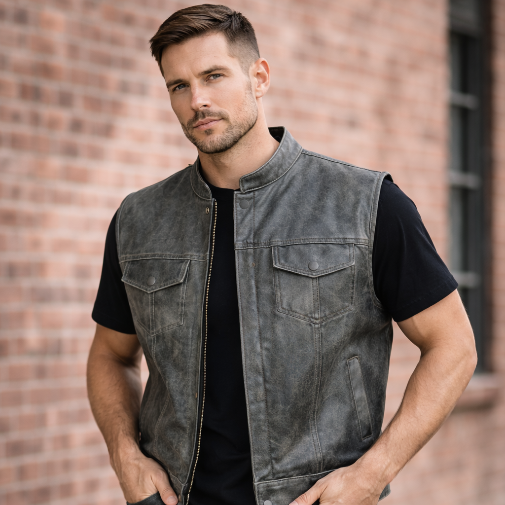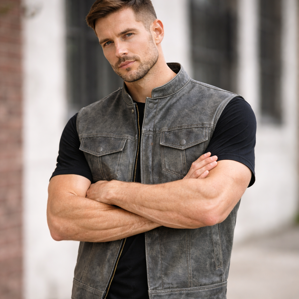 Built for riders who want a rugged edge without sacrificing functionality, this distressed gray leather club vest delivers classic motorcycle styling with a modern layered look.