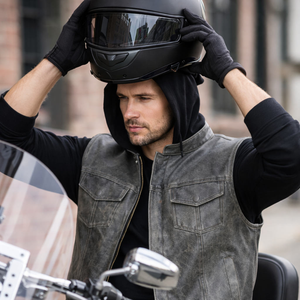 The one-piece back panel makes this vest ideal for club patches, embroidery, or custom artwork. Whether worn with the hood up under your helmet or removed for a clean traditional club look, this vest adapts to your ride.
