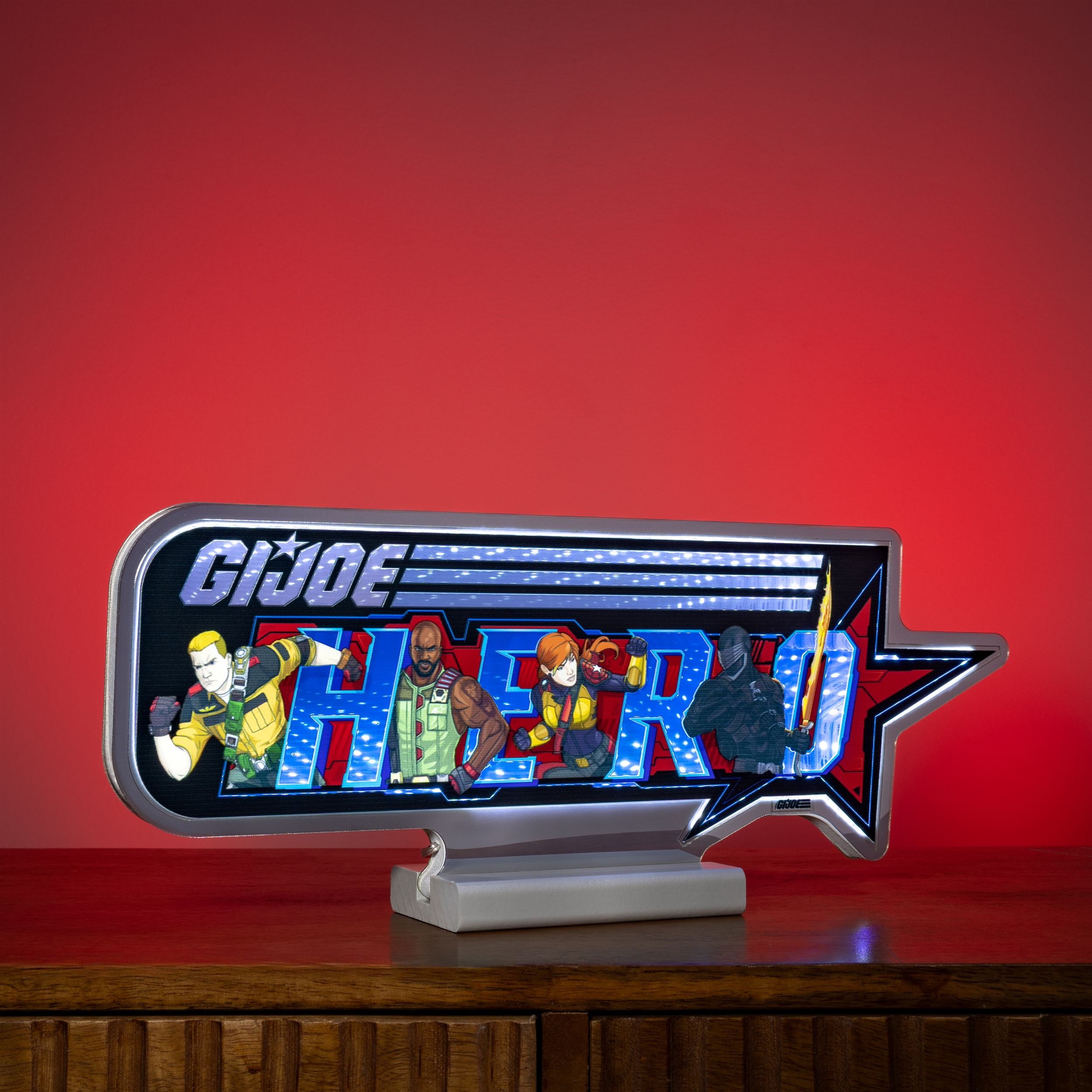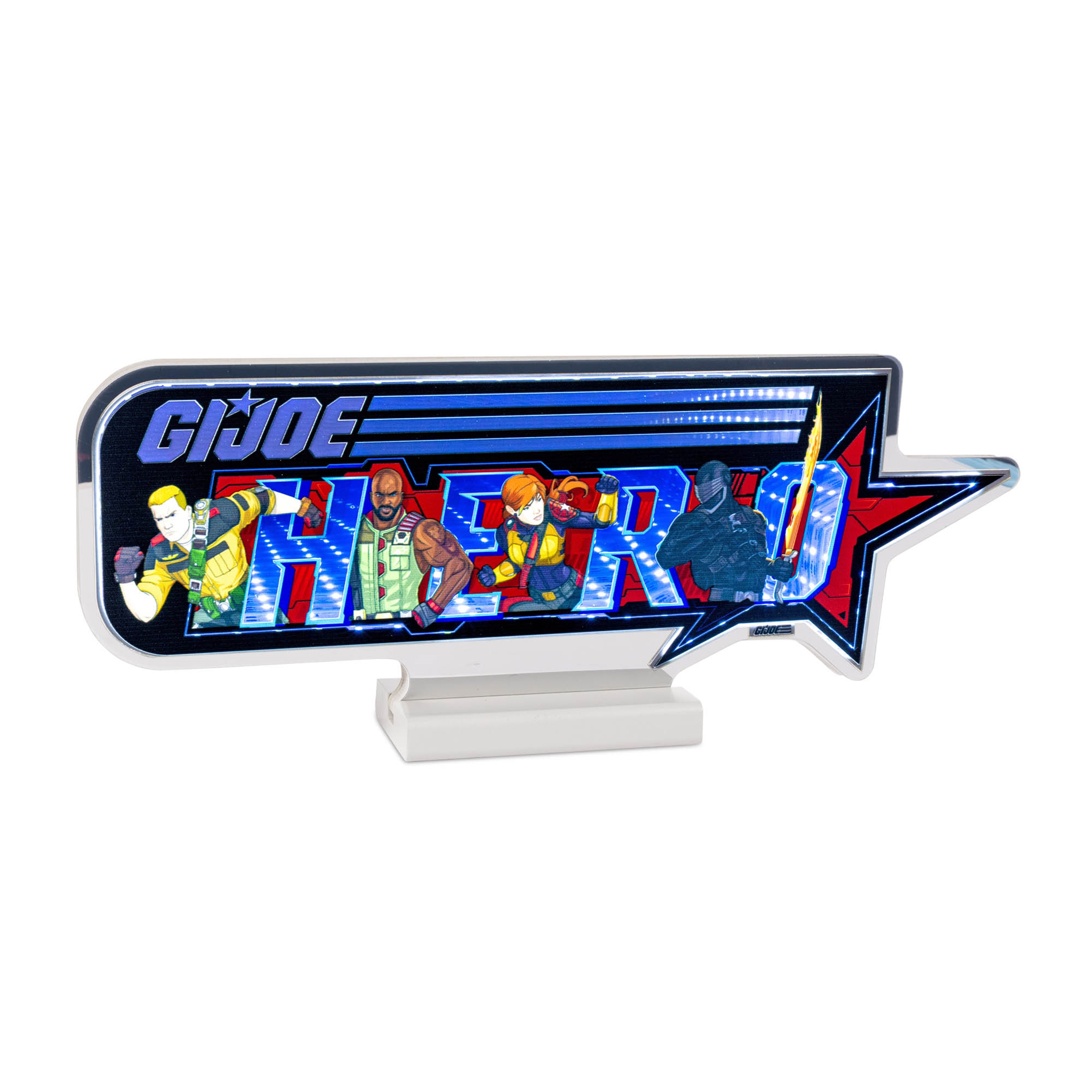 Bring home the bold spirit of America s elite heroes with the G.I. Joe Hero Ekkolight. This dynamic infinity-LED tabletop accent shines with vivid blue and red illumination, creating a captivating depth effect that fans of the iconic franchise will instantly recognize. Designed to celebrate the courage, action, and adventure that define G.I. Joe, this striking d cor piece transforms any room into a tribute to heroism. Whether displayed in a game room, office, or collector s shelf, it s the perfect blend of fandom pride and futuristic visual appeal.